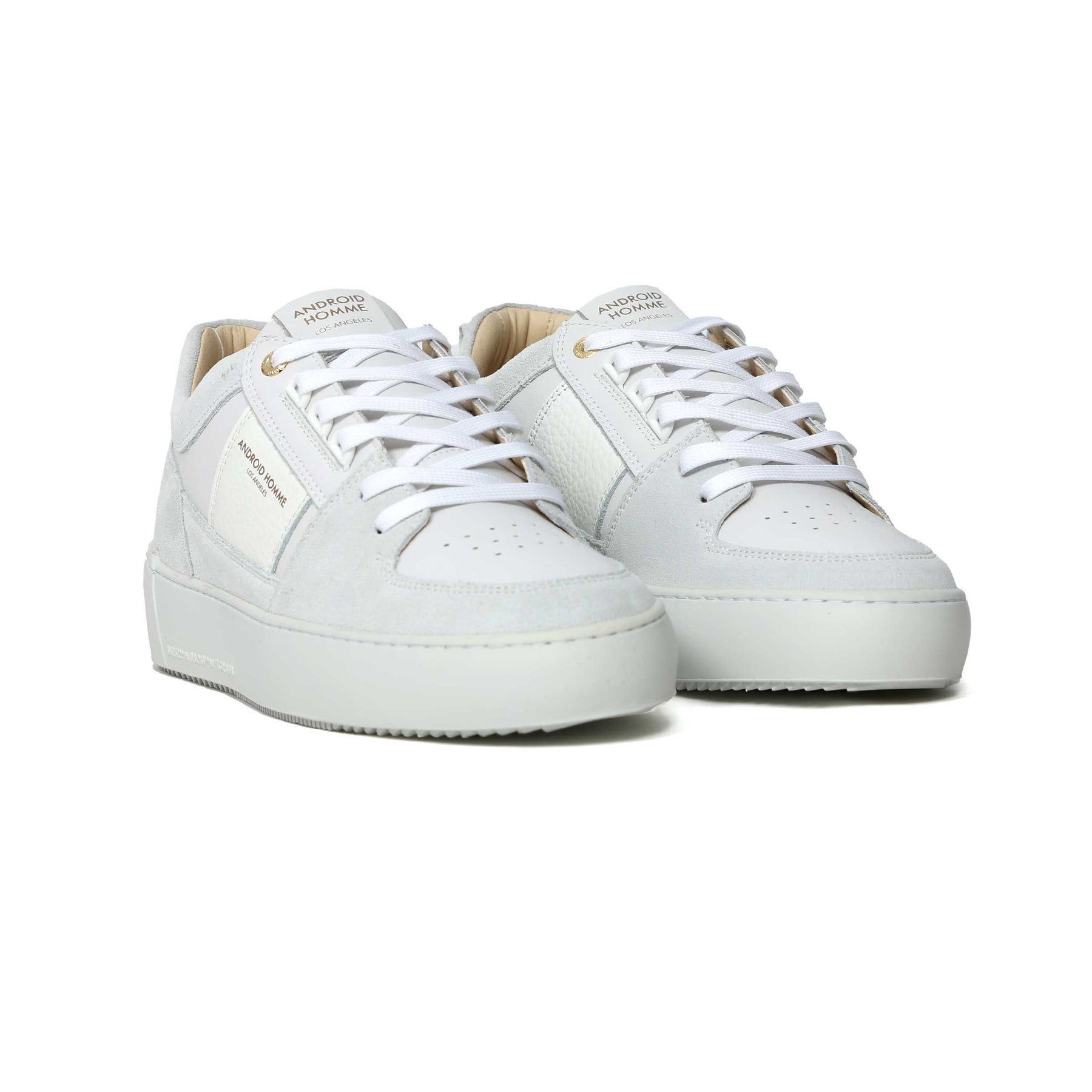 Android Homme Point Dume Low Trainer in White. Luxury trainers by Android Homme. This Android Homme trainer arrives with leather and suede upper panels. Tonal colour sole. Punch hole design to the upper. Textured panel design to the side. Finished off with 6 hole eyelets and D-rings. Pull tab to the heel. Android Homme logo tab to the tongue and printed logo to the side panel.