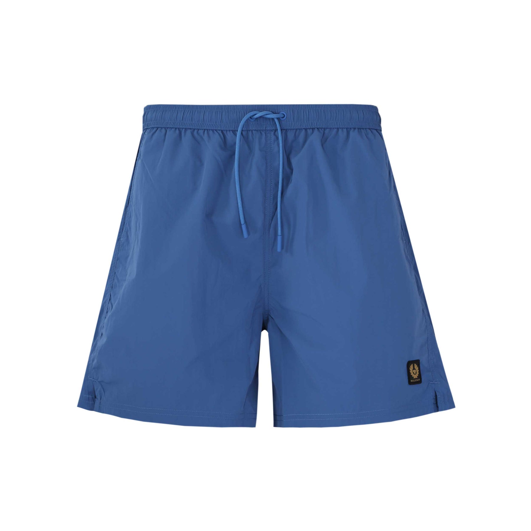 Belstaff Clipper Swim Short in Marine Blue. Swim short by Belstaff. Elasticated waistband with drawstring feature. Branded metal tips to the drawstrings. With two slash front pockets and a zip fastening pocket to the seat. Small Belstaff heritage logo badge to the leg.