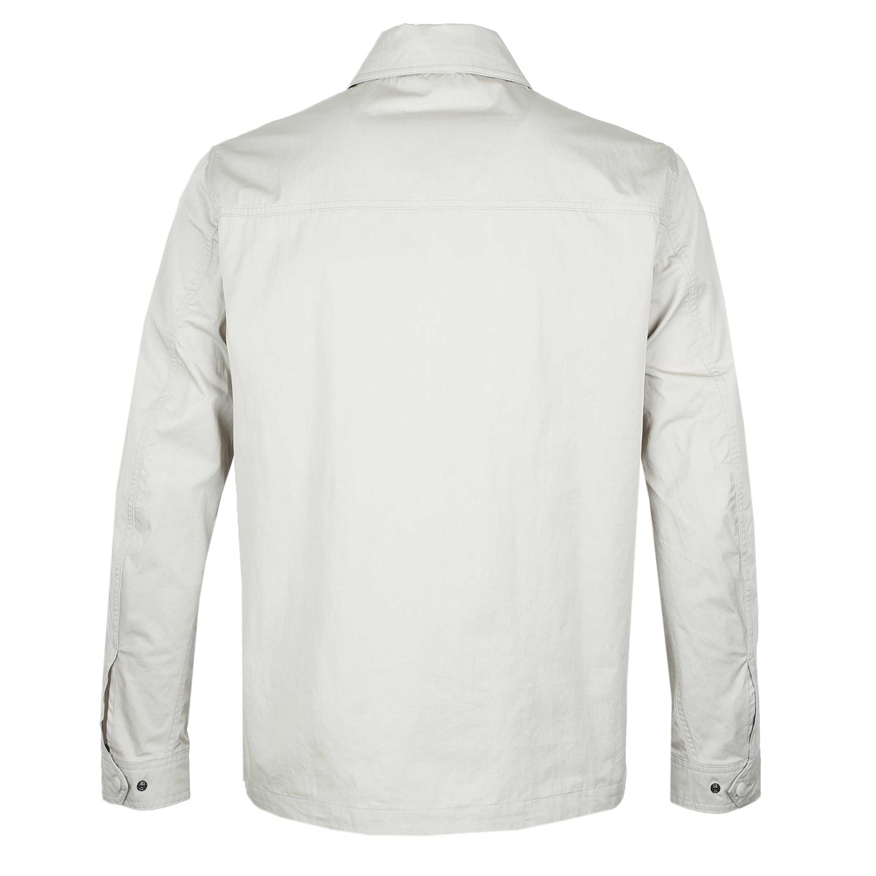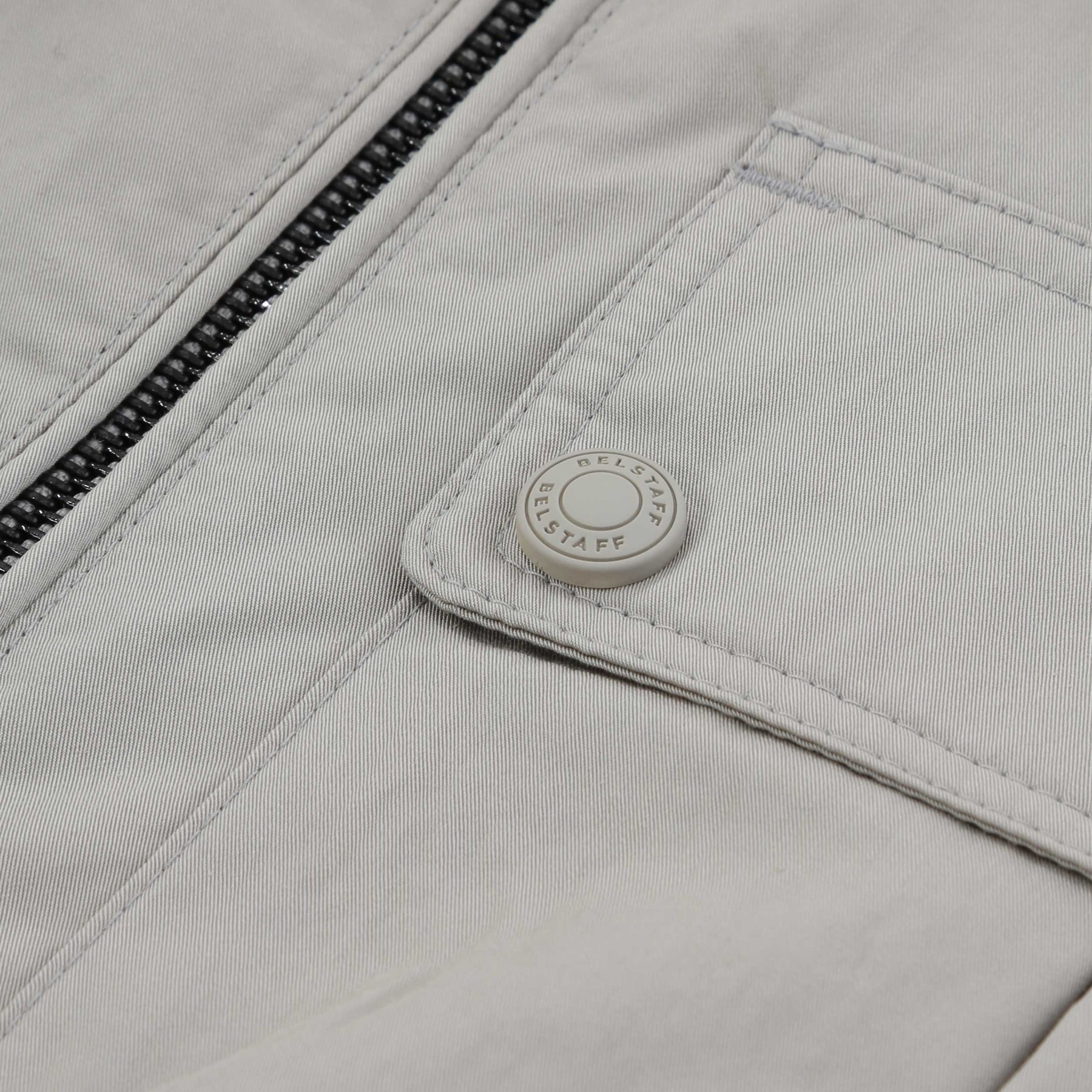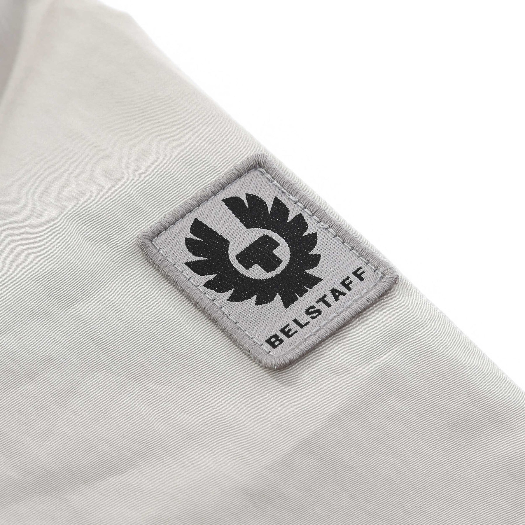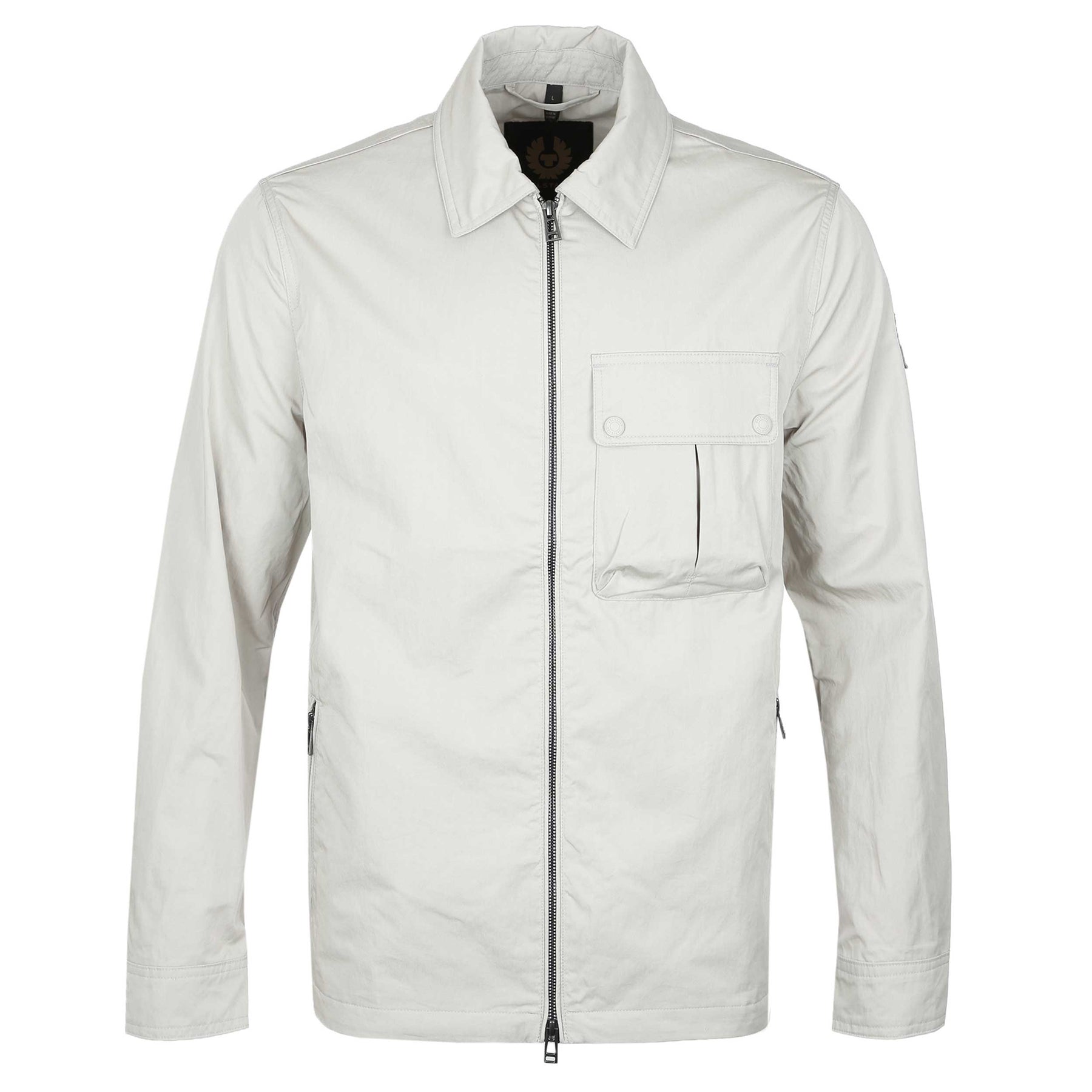 Belstaff Drome Overshirt in Cement Grey. A lightweight overshirt by Belstaff with a water repellent finish. A zip-up, collared style overshirt with a chest pocket with snap fastening. Featuring a full zip fastening and two zip fastening side pockets. Adjustable press stud cuffs. Finished with a Belstaff logo on the left sleeve.