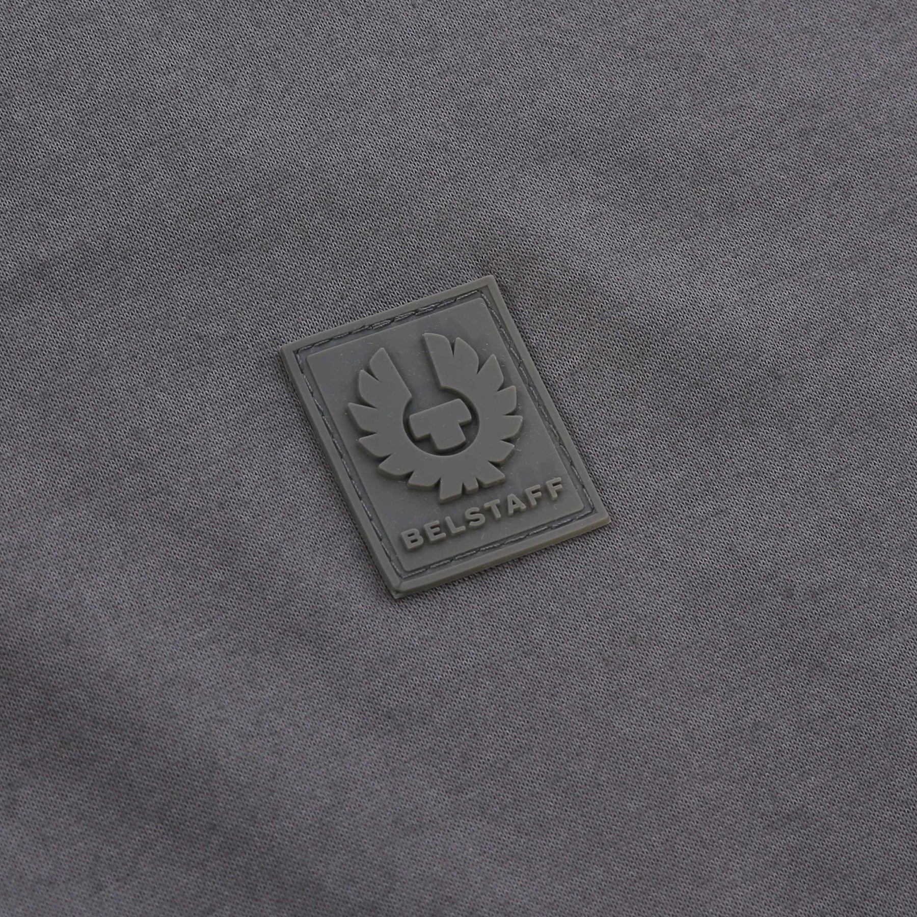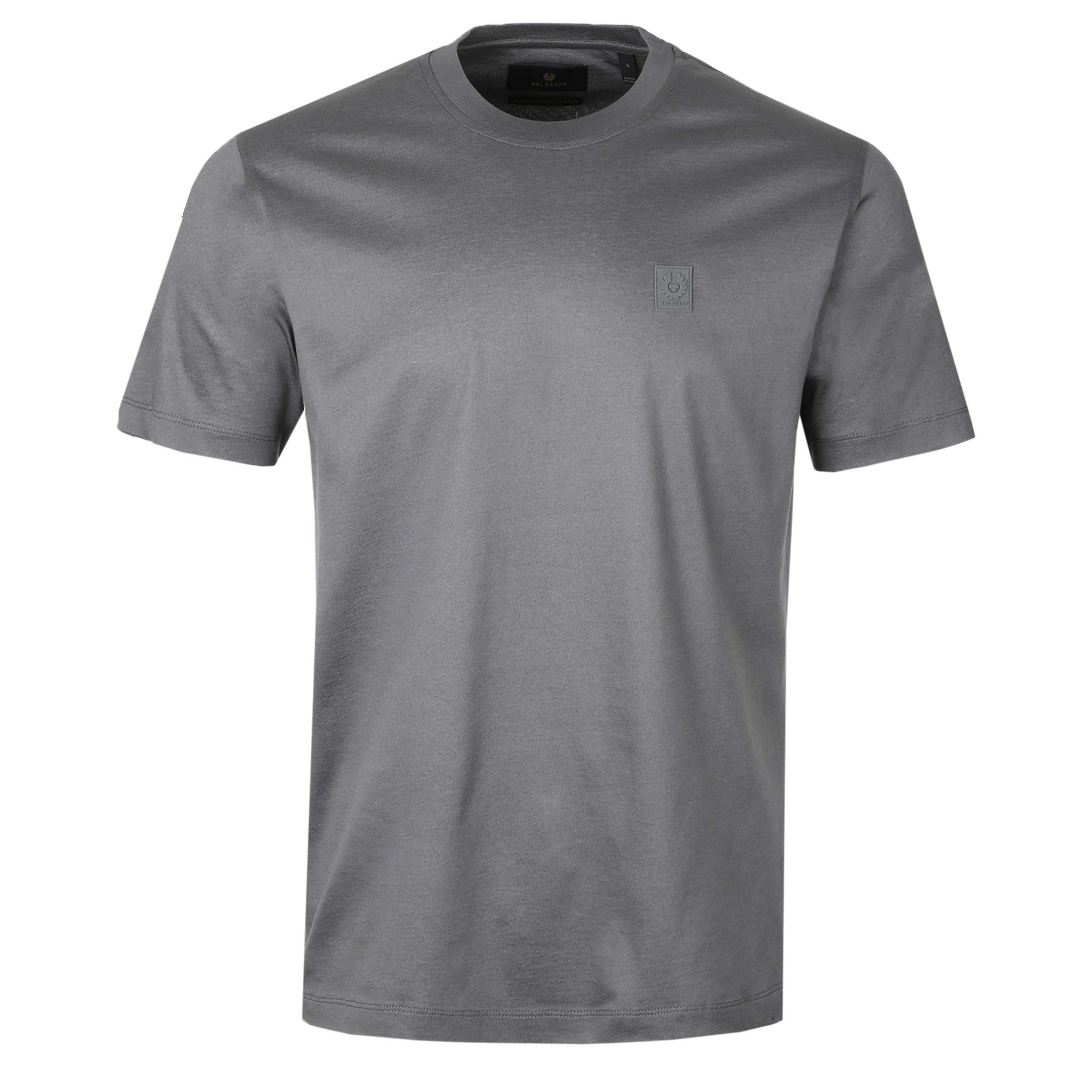Belstaff Steel T-Shirt in Tornado Grey. A classically styled crew neck, short sleeve t-shirt by Belstaff. Soft cotton t-shirt finished with a tonal silicone Belstaff logo to the chest.