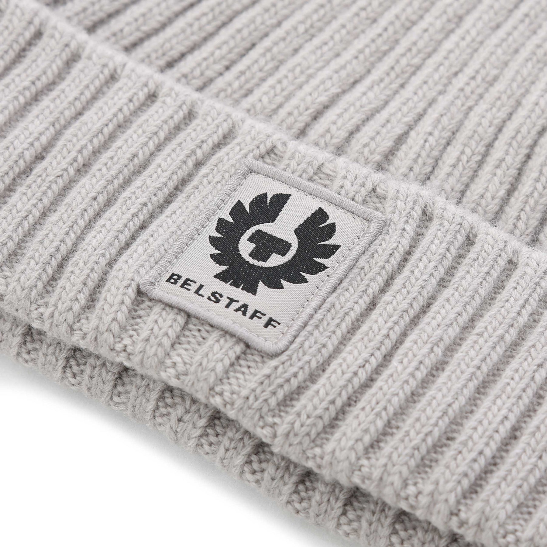 Belstaff Watch Beanie Hat in Cement Grey. A classic beanie style hat by Belstaff. This hat is made using soft lambswool which will keep your head warm this Winter. With a ribbed design and Belstaff logo badge on the front of the hat.
