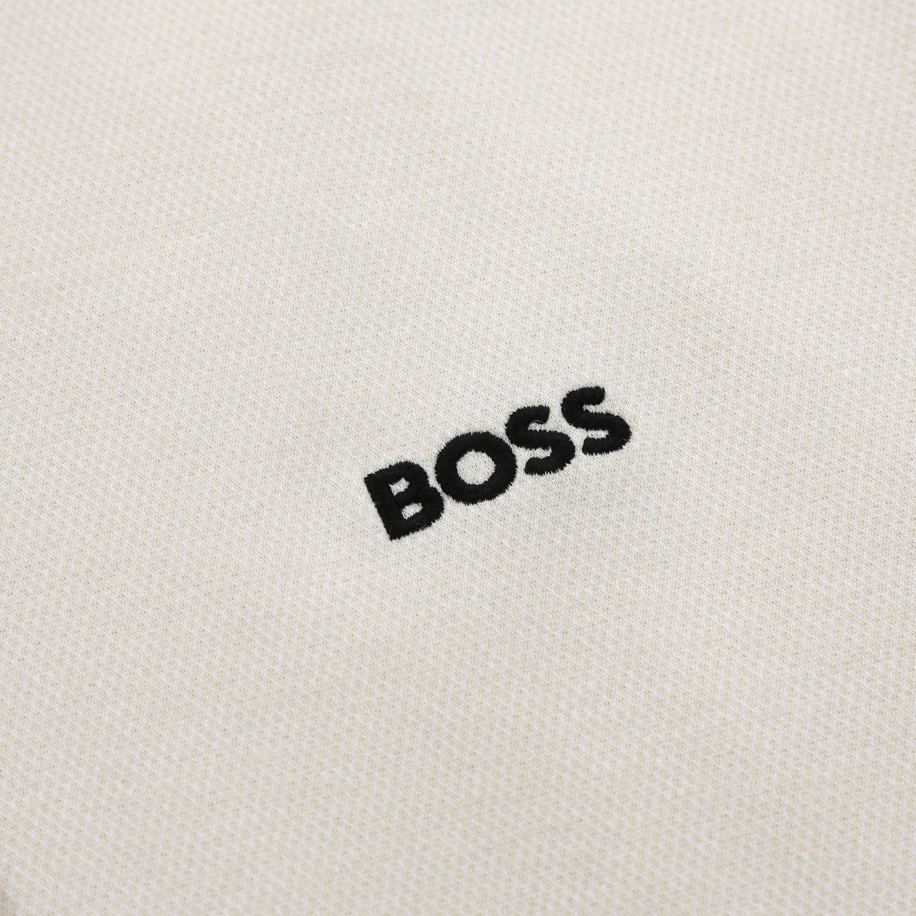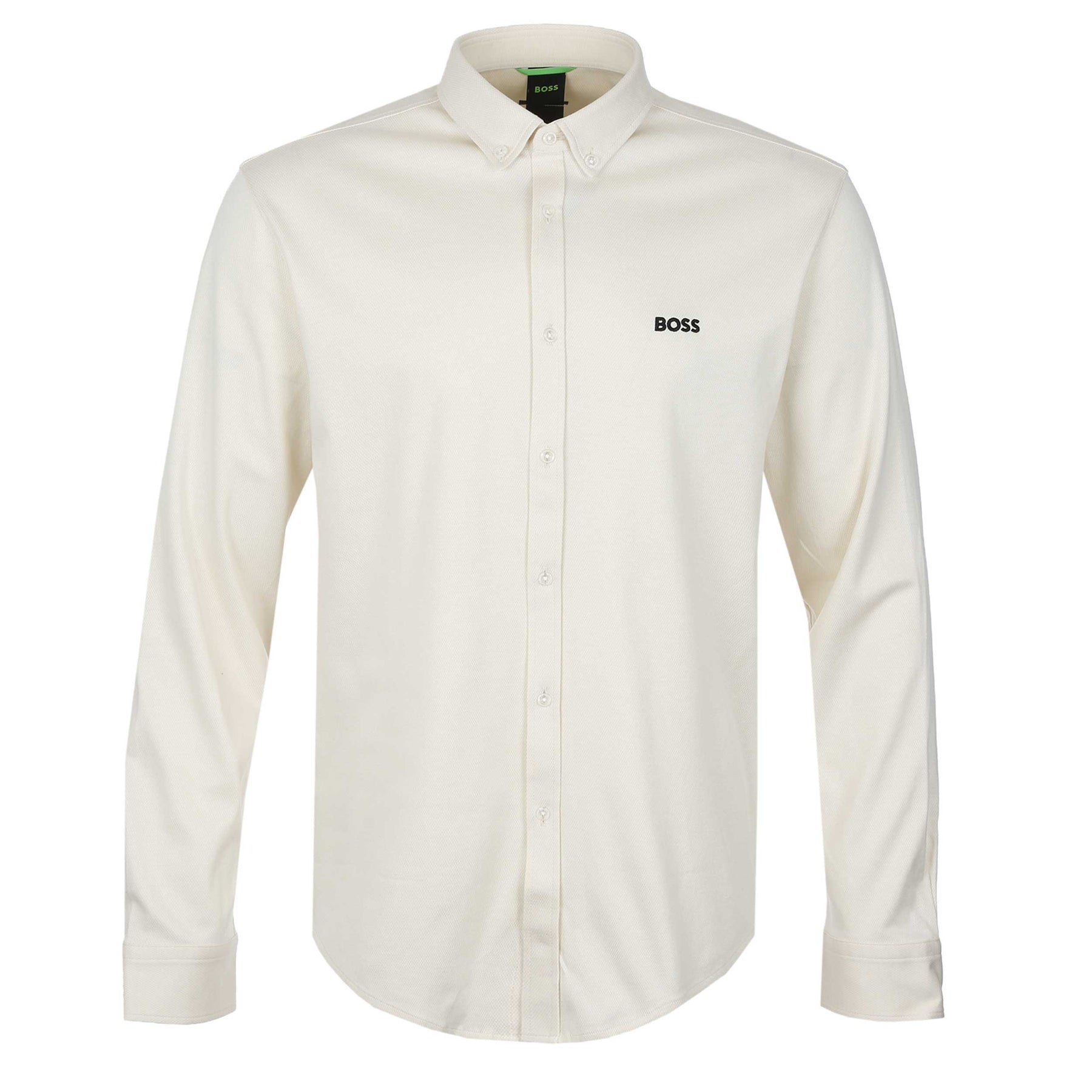 BOSS B Motion L Shirt in Open White. A long sleeve Hugo Boss shirt in a regular fit. Featuring button down collar and a rubber BOSS logo to the chest. Contrasting trim to the collar and cuff. The shirt is constructed with a moisture-wicking cotton, keep you feeling cool and fresh all day.