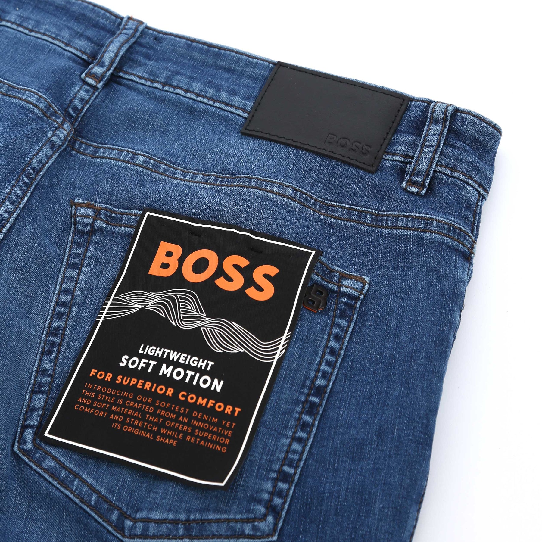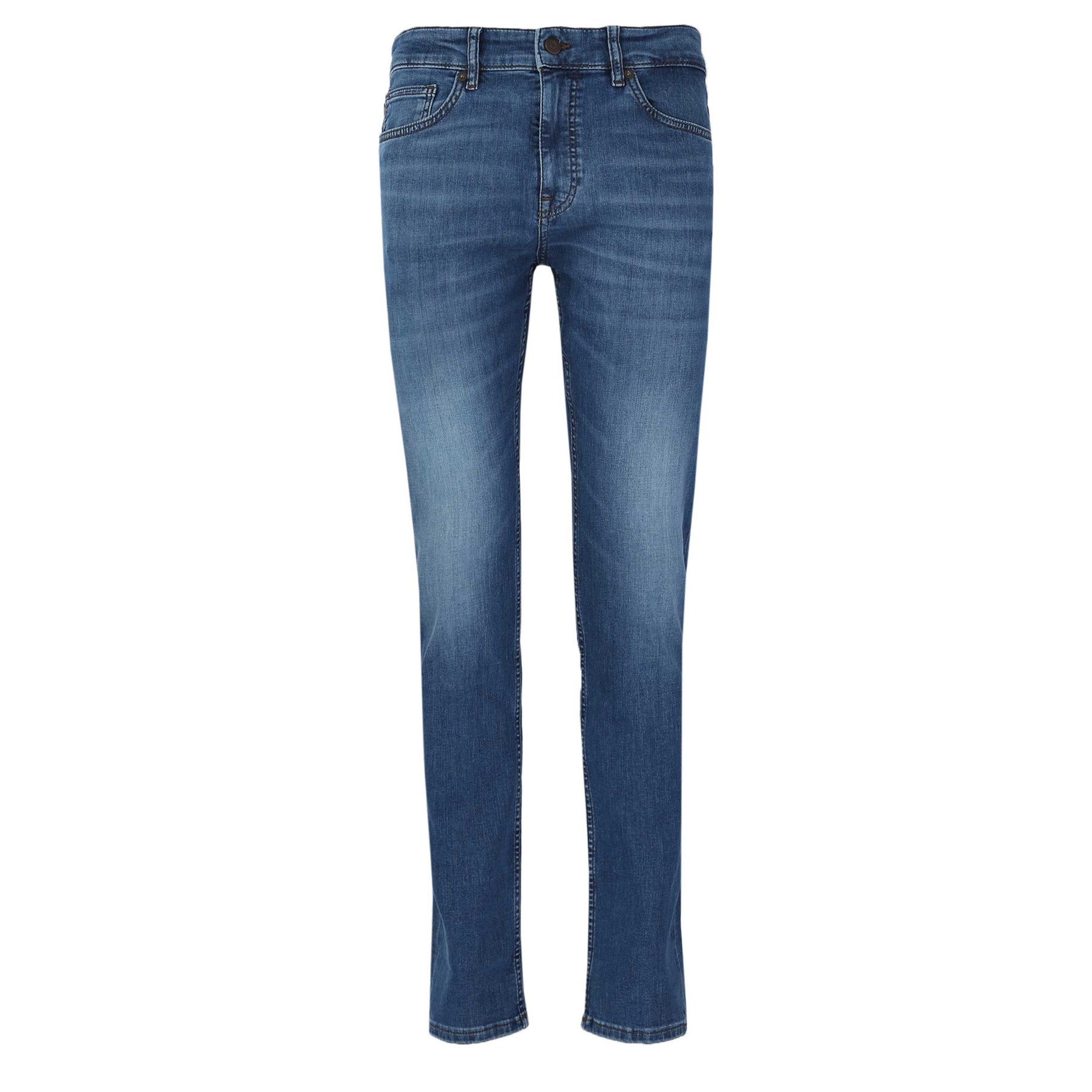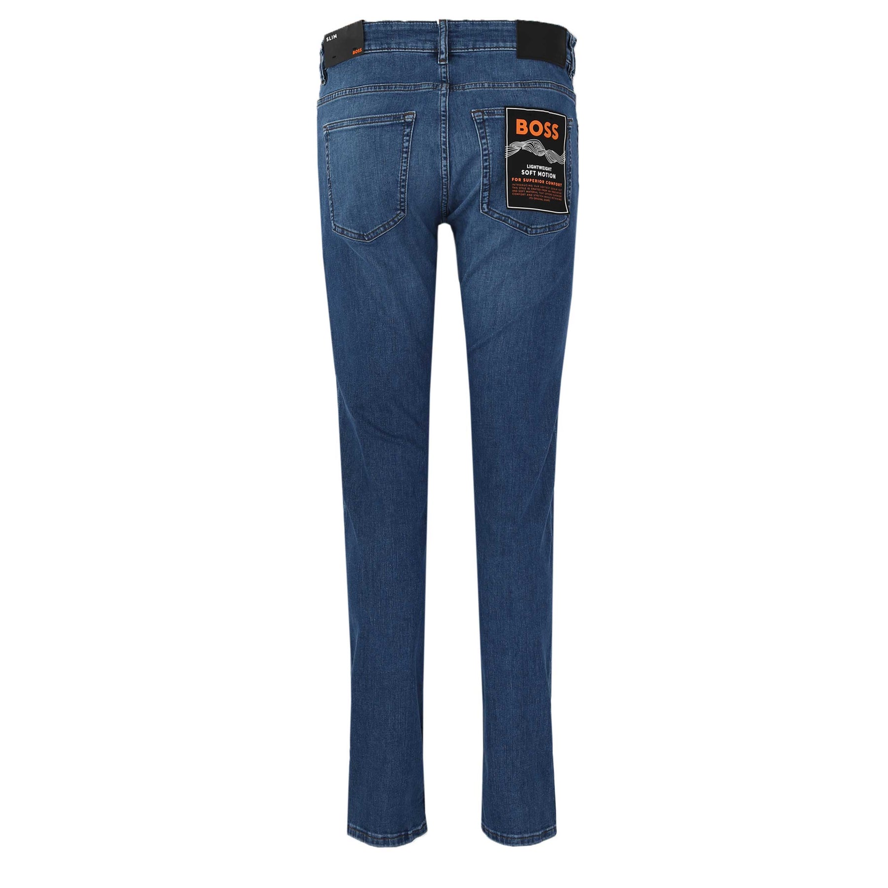 BOSS Delaware BO S.NOOZE Jean in Medium Blue. BOSS Delaware jeans arrive in a slim fit, made from a brushed cotton with stretch for added comfort. Featuring a regular zip fly fastening with button to waistband. Solid colour jean in a 5 pocket jean design. The perfect jean to wear casual, or smarten up by layering up with a shirt and jacket combination.