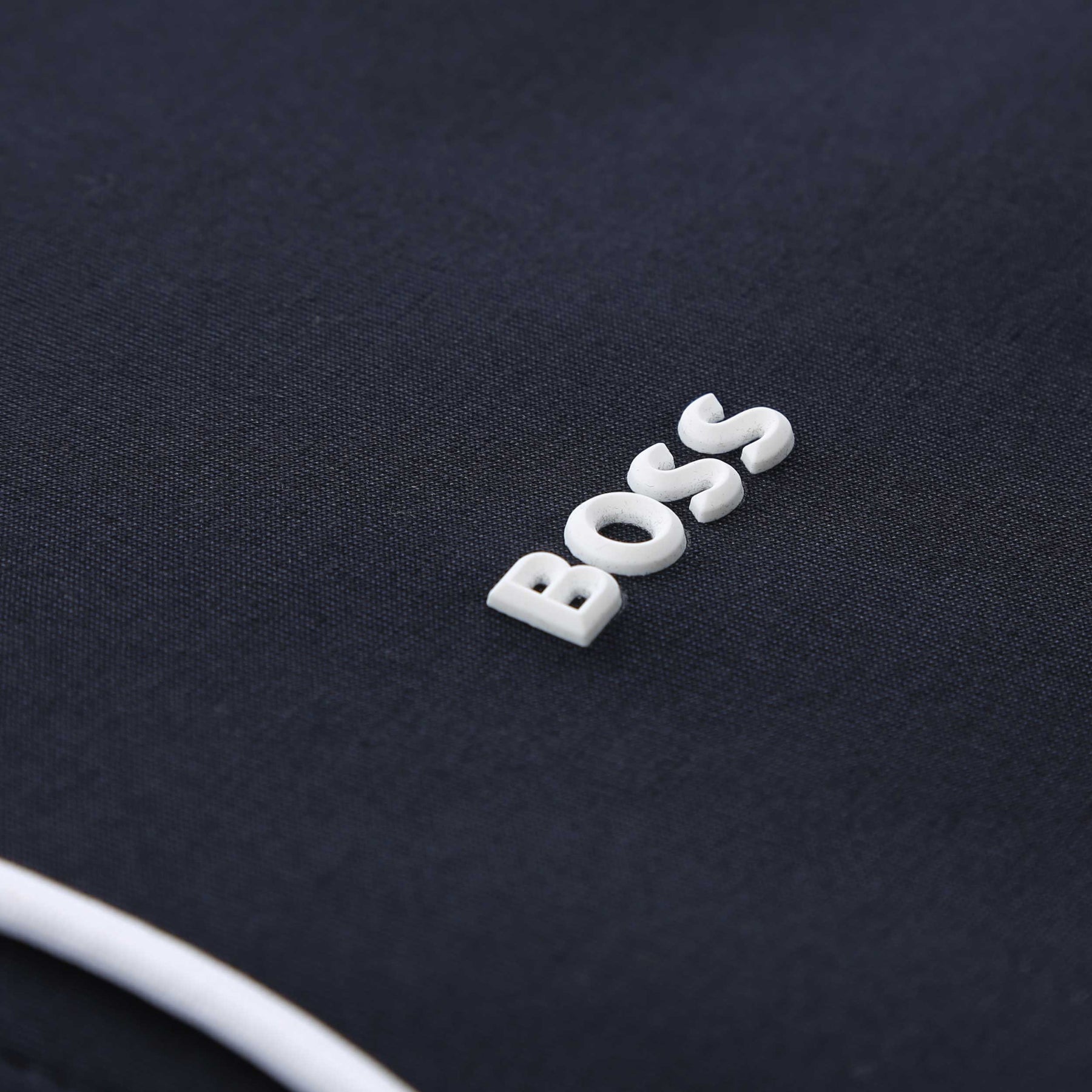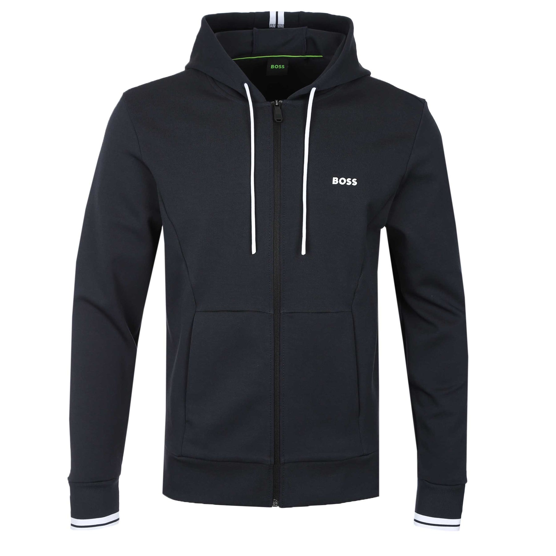 BOSS BOSS FZ Hoodie Zone Sweat Top in Dark Blue.A full-zip BOSS hoodie built for everyday comfort, designed with a large adjustable drawstring hood featuring a bold striped panel. The long sleeves finish with ribbed cuffs and matching stripe details, complemented by a ribbed waistband for a clean, structured fit. Two waist pockets add practicality, while the raised BOSS chest logo gives it a sharp, premium finish.