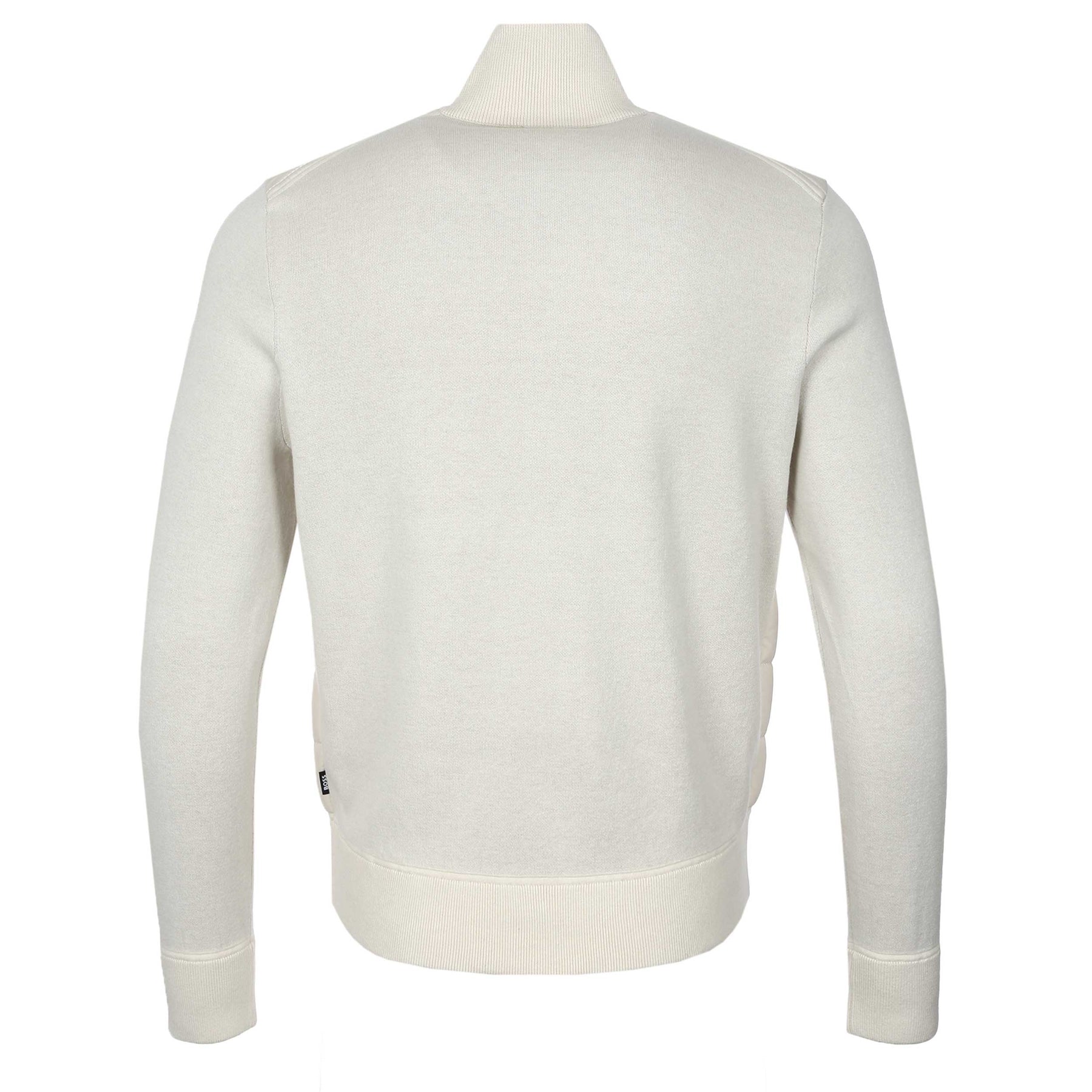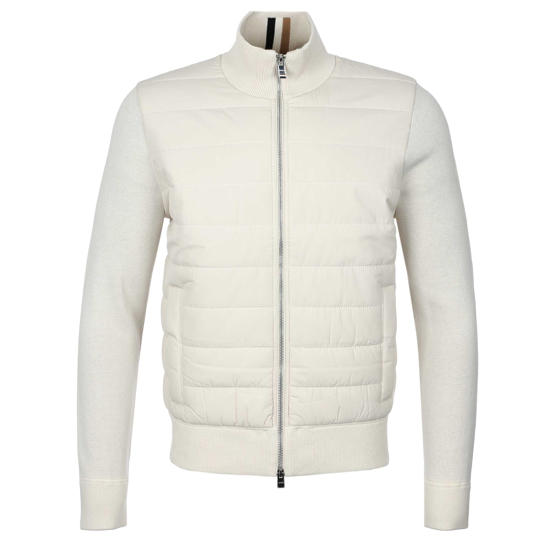 BOSS H Hernesto Knitwear in Cream. This mixed-media jacket combines a lightly padded front with knitted sleeves and reverse for a sharp, modern contrast. Designed with a ribbed stand collar, ribbed cuffs and a structured waistband, it delivers a clean, athletic silhouette. Two press-stud waist pockets offer easy functionality, while a double monogram logo on the upper left sleeve adds a subtle premium finish. A versatile layering piece that bridges smart and casual with zero effort.