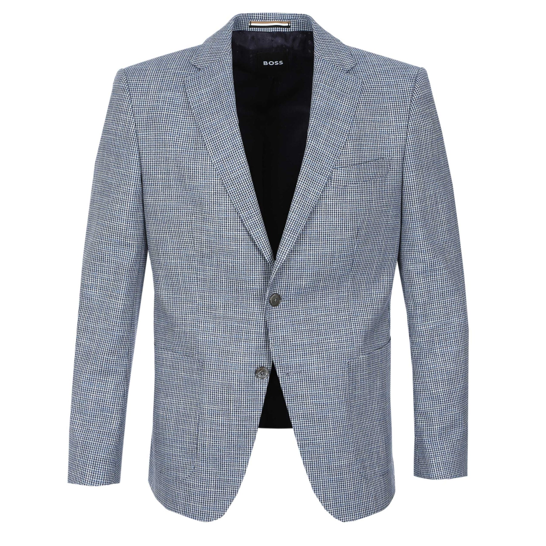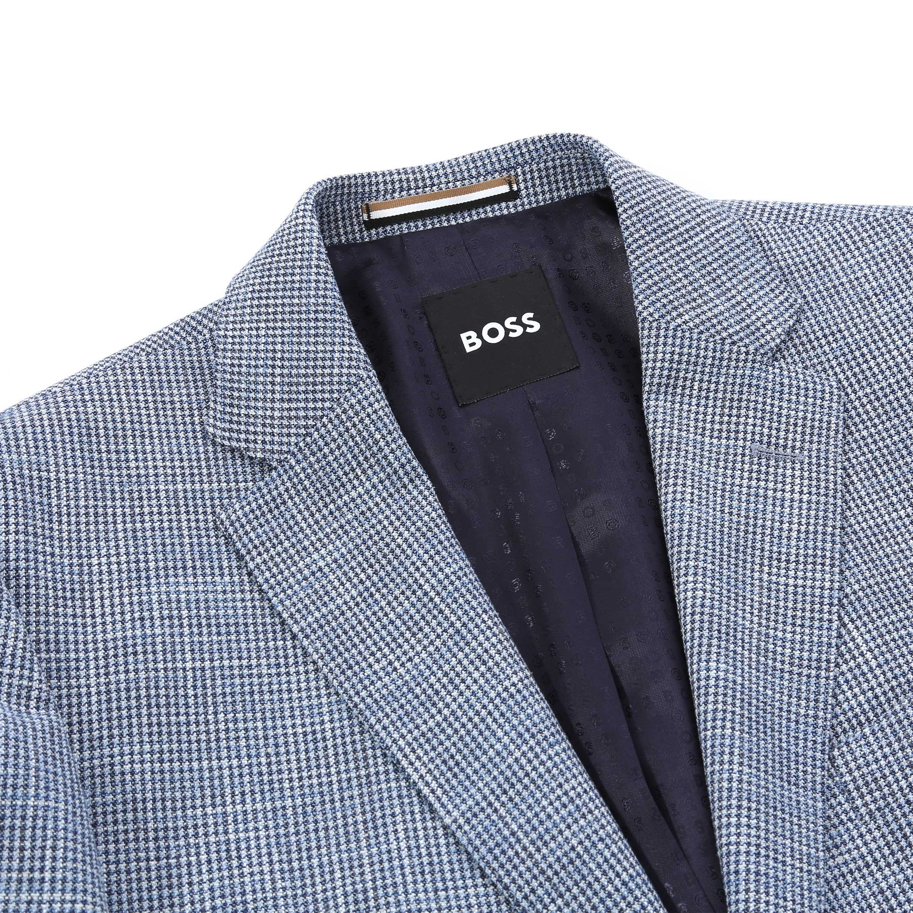 BOSS H Hutson 2PP 253 Jacket in Open Blue. Crafted for refined business dressing, this straight-fit BOSS blazer is detailed with a subtle check pattern for understated sophistication. Made from a premium stretch fabric blending virgin wool, silk and cotton, it delivers natural breathability, lightweight structure and all-day comfort. Sharp tailoring enhances the silhouette while the flexible construction allows ease of movement, making it an elevated choice for modern office wear, formal occasions or smart evening styling.
