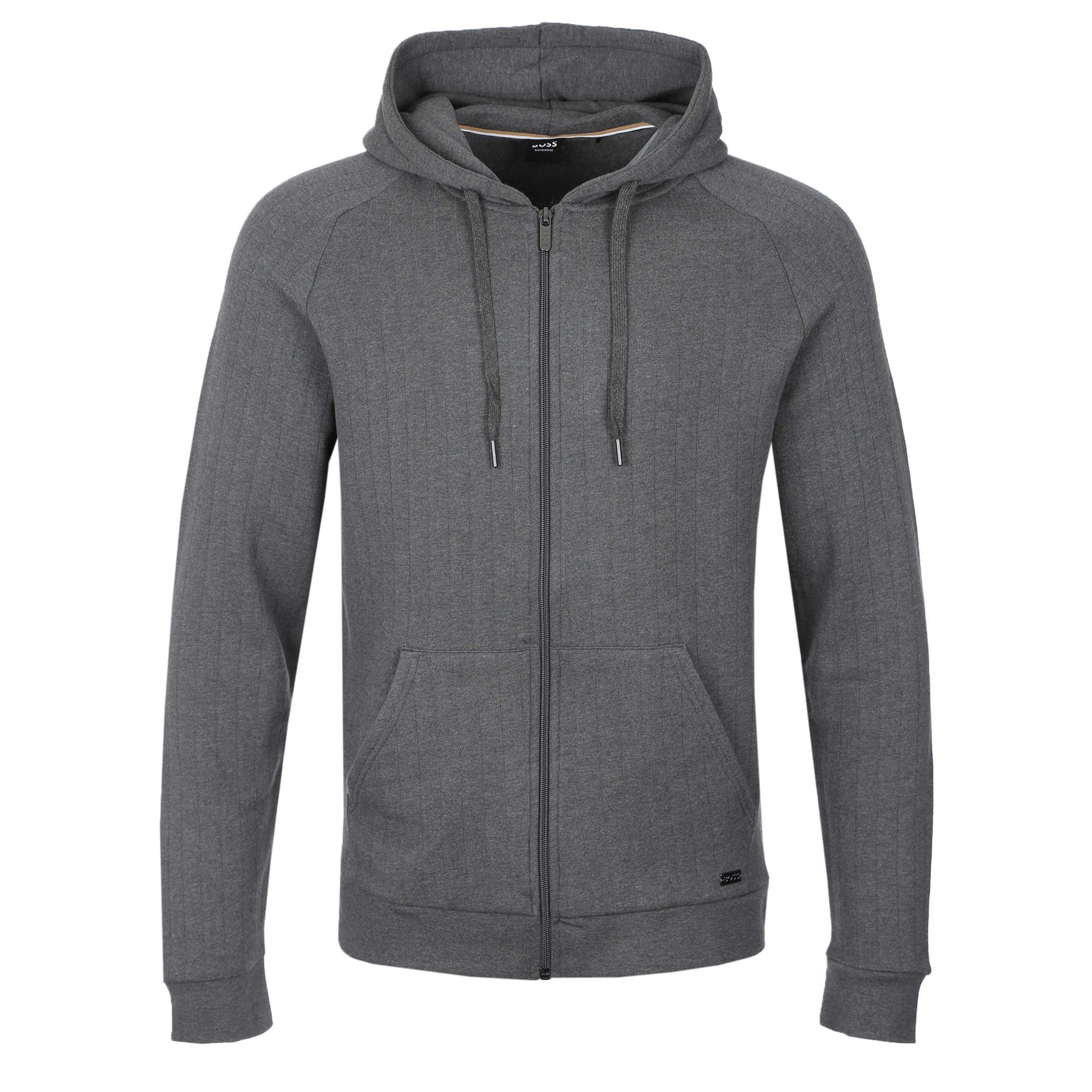 BOSS Heritage Jacket H Sweatshirt in Medium Grey. A heritage-inspired hoodie by BOSS. This zip-up style jacket has a drawstring hood with branded metal toggles. Full zip fastening front. Subtle pinstripe design throughout the sweatshirt. Metal Boss logo tab to the front. Finished with slip pockets.