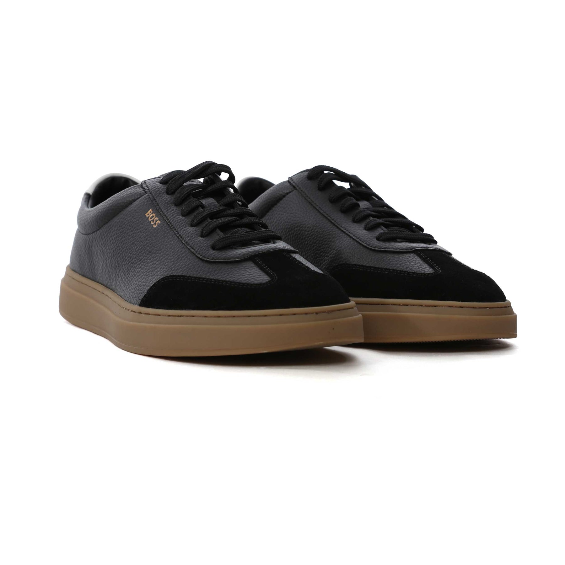 BOSS Kieran Tenn sdgral Trainer in Charcoal. These low top BOSS trainers arrive with a 7 hole lace up and a tonal colour sole unit. Textured leather trainer featuring subtle BOSS logo. Contrasting heel tab. A perfect blend of luxury and everyday comfort.