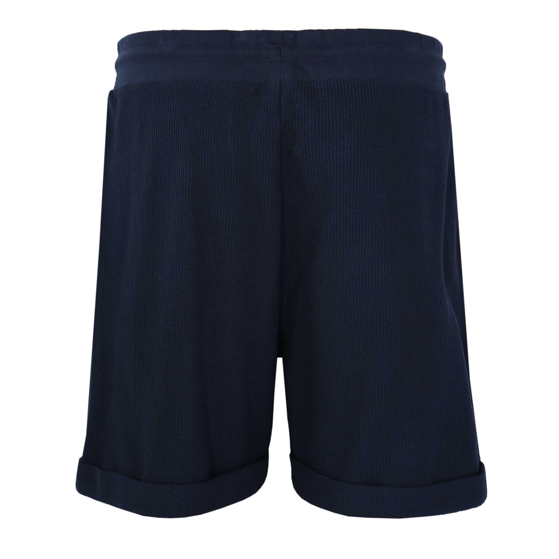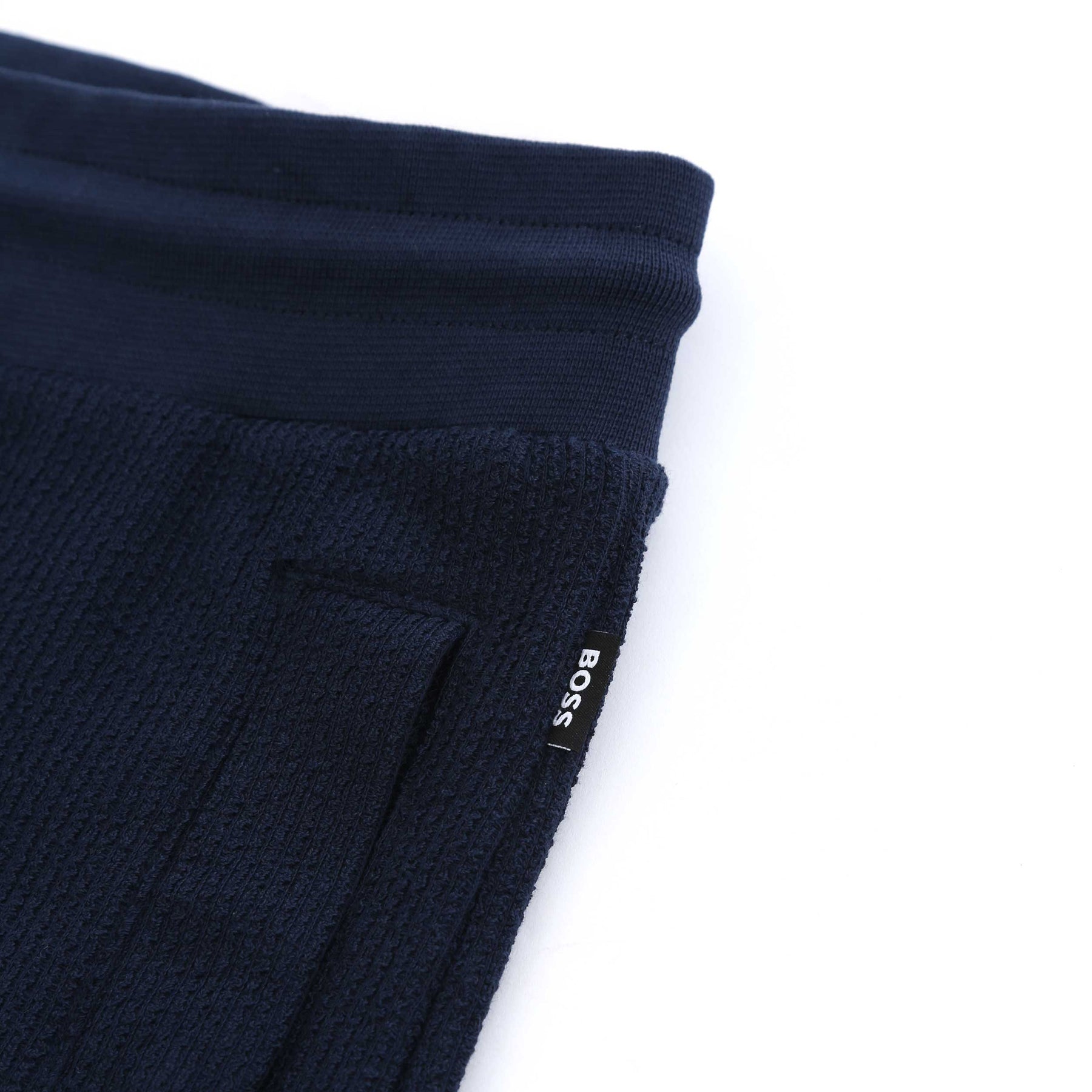 BOSS Lasdun 129 Short in Navy. A regular fit short by BOSS. This short arrives in a plain design. Boucle fabric style. Featuring an elastictae drawstring waistband. 2 snap fastening side spockets and 2 seat pockets. Team up with the matching shirt.