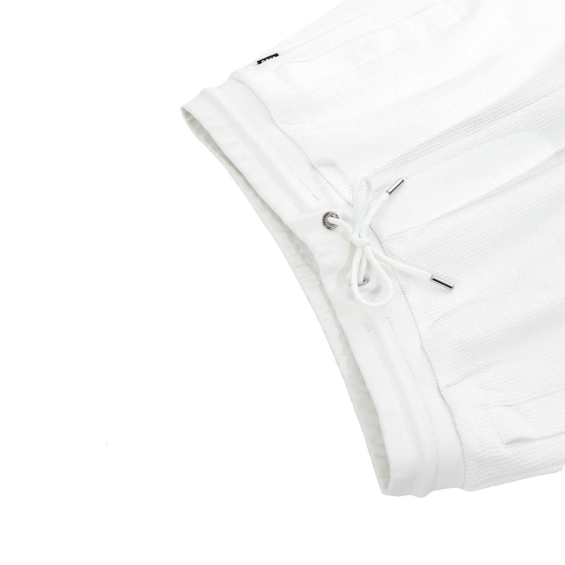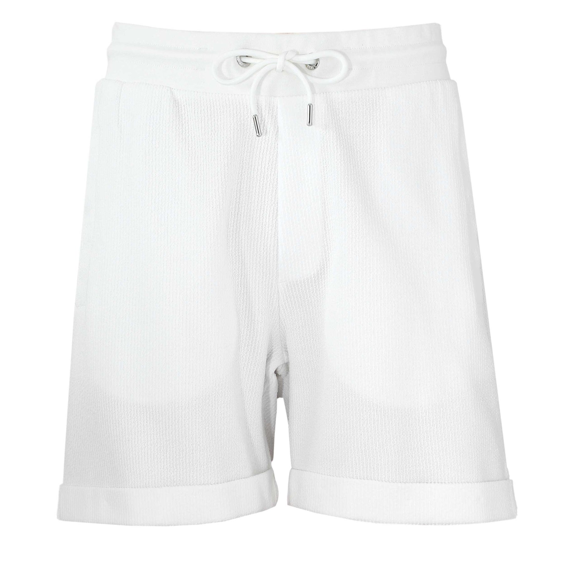 BOSS Lasdun 129 Short in White. A regular fit short by BOSS. This short arrives in a plain design. Boucle fabric style. Featuring an elastictae drawstring waistband. 2 snap fastening side spockets and 2 seat pockets. Team up with the matching shirt.