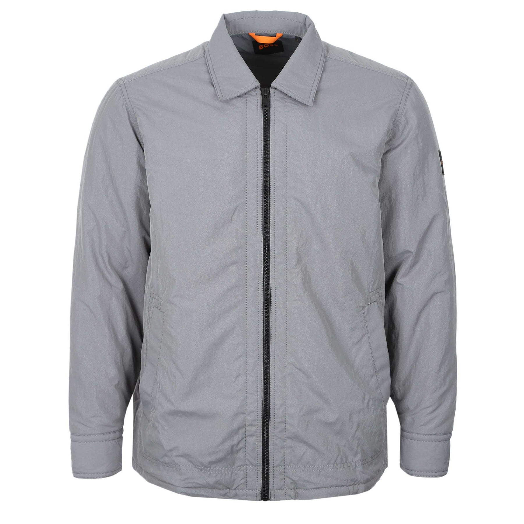 BOSS Leejay 1 M Overshirt in Open Grey. Overshirt by BOSS with full zip fastening. A BOSS overshirt with a full zip fastening placket. Classic pointed collar. Press stud fastening cuffs. Two side entry pockets to the waist. Press stud fastening to the waist. Rubber BOSS logo to the sleeve.