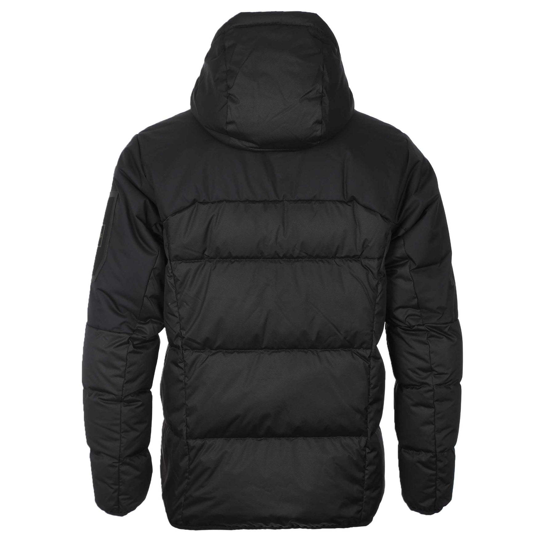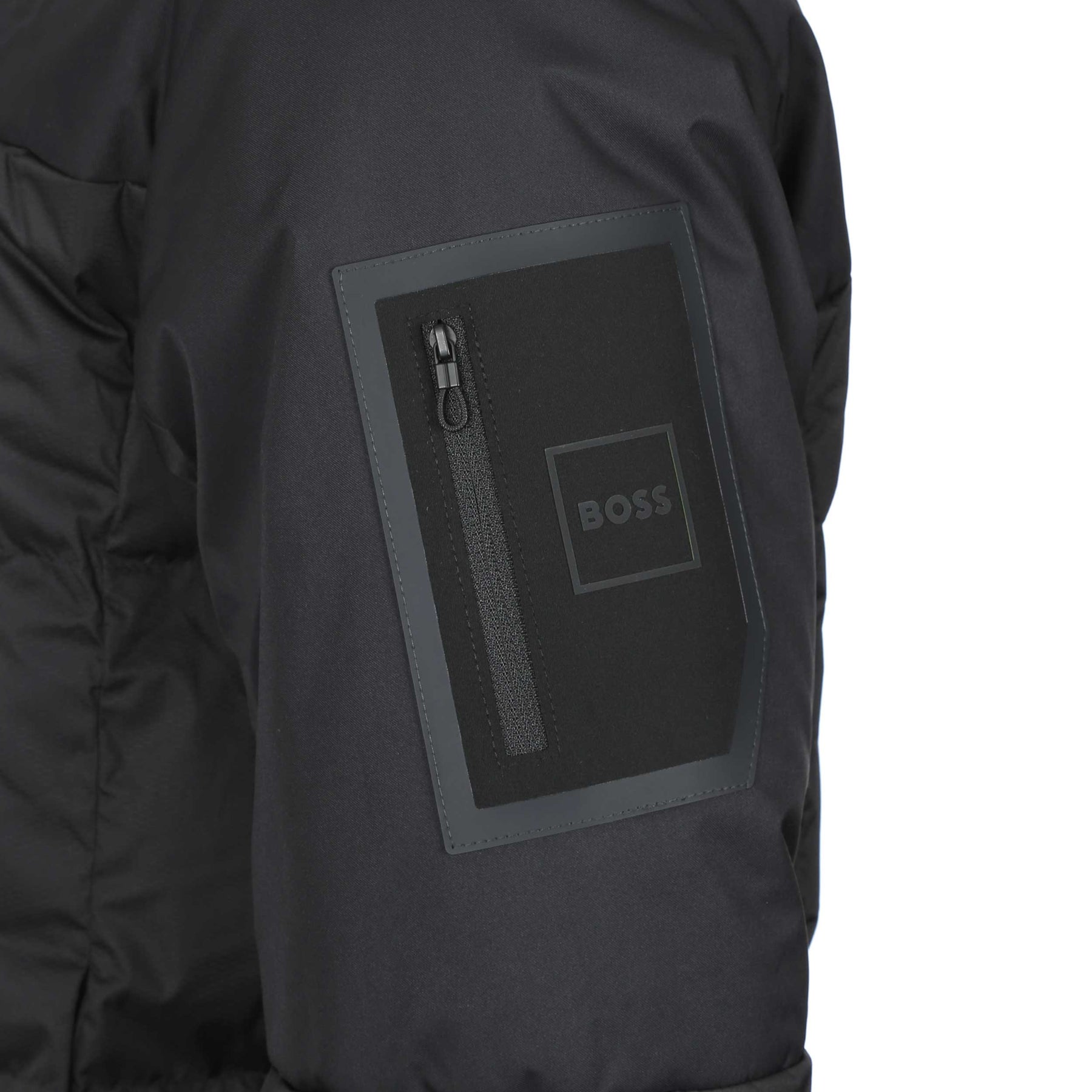 BOSS OW Block X JT HD Jacket in Black. Lightweight and padded for everyday warmth, this water-repellent BOSS jacket features a branded zip fastening and an adjustable, removable hood with a structured stand collar. Elasticated cuffs and hem give a secure, comfortable fit, while two press-stud waist pockets add practical storage. The signature BOSS logo sits on the left sleeve beside a functional zip pocket, with an additional internal zip pocket for essentials.