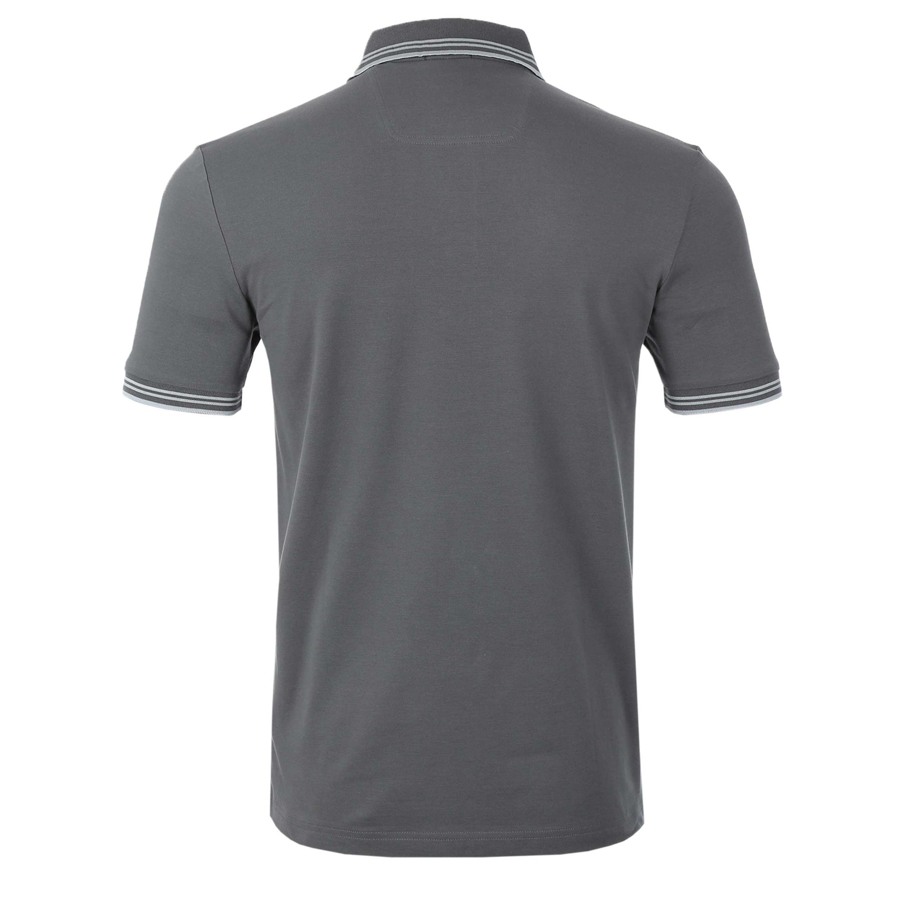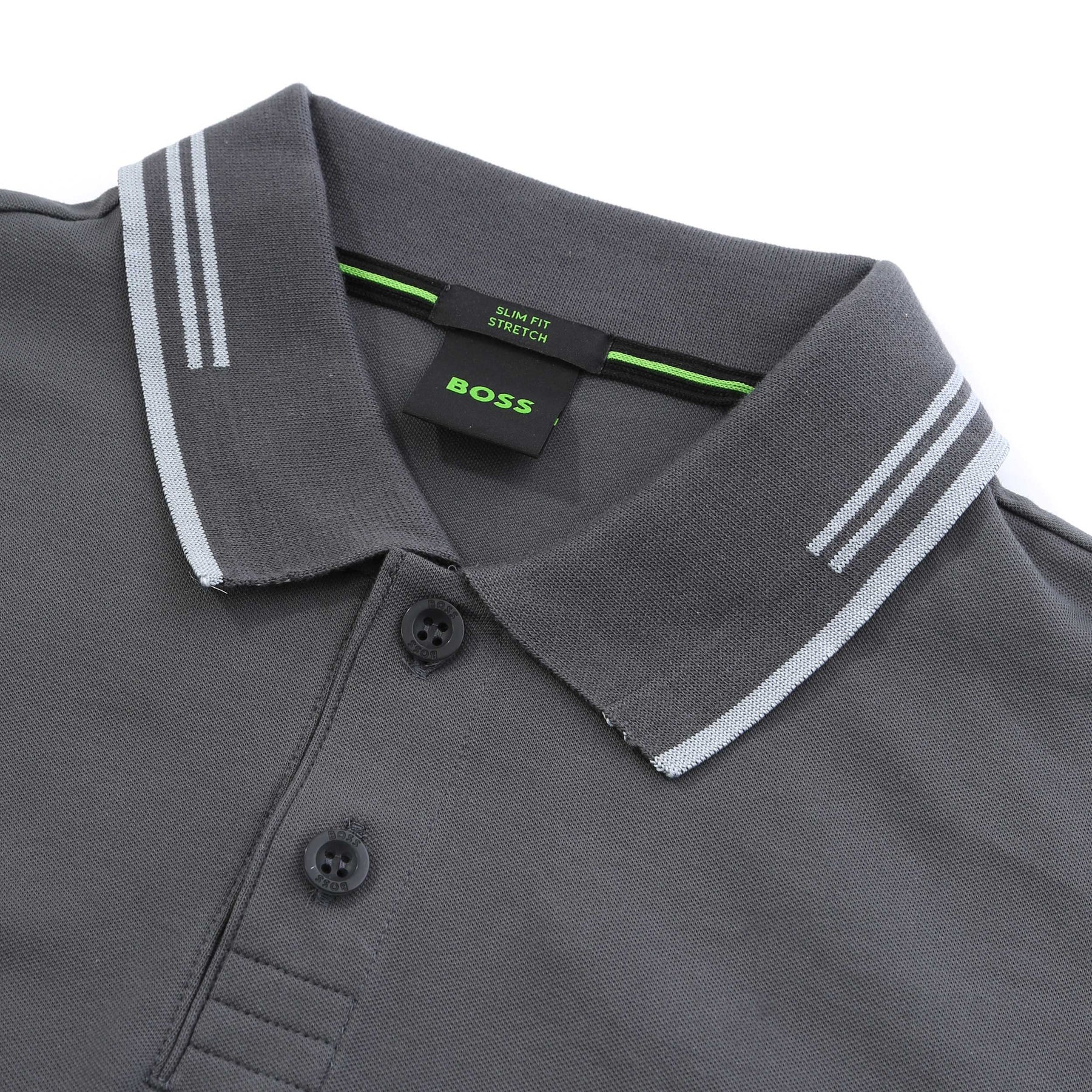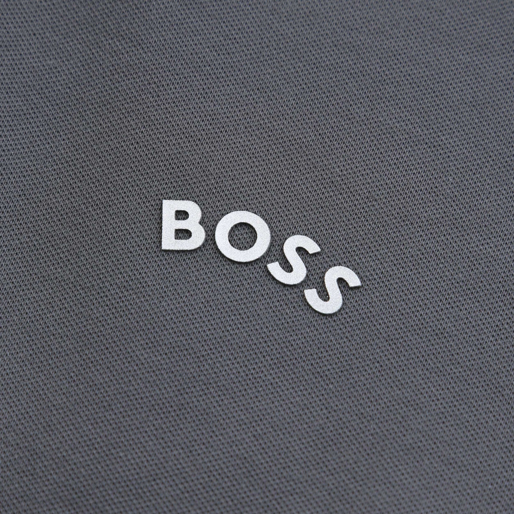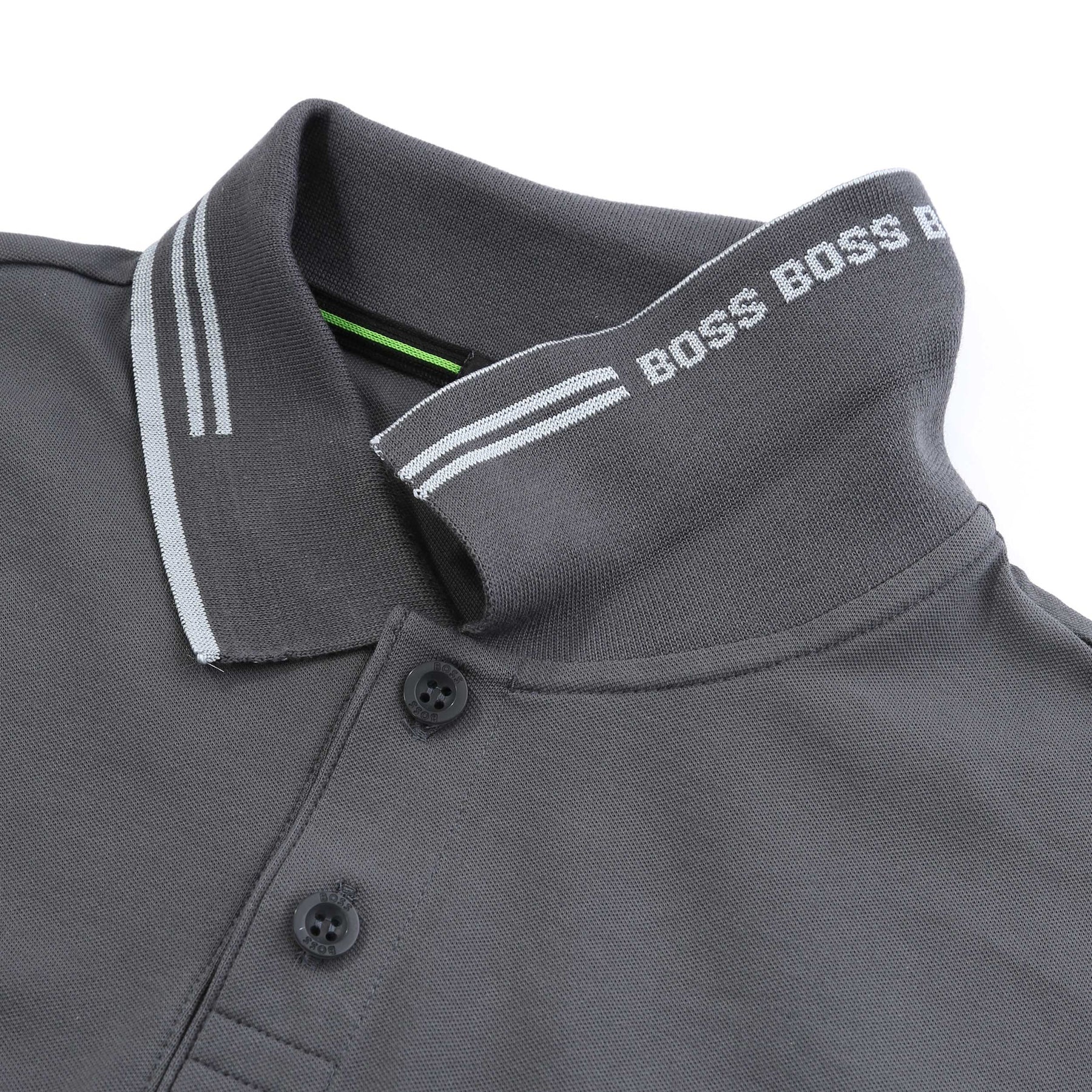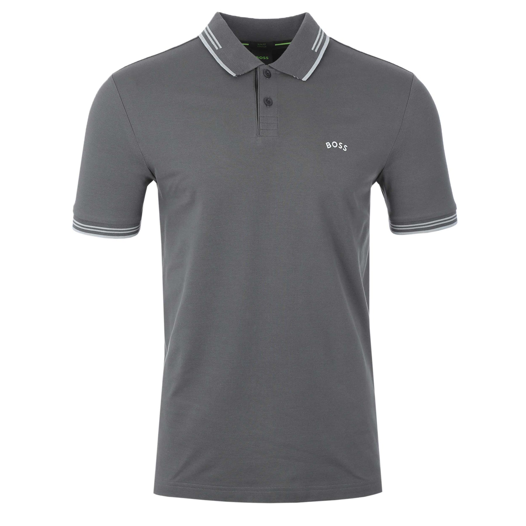 BOSS Paul Curved Polo Shirt in Dark Grey. BOSS polo shirt cut to a slim fit and a flat-knit collar. 2-button placket. Colourful tipping stripers on the collar and cuffs. New season curved logo on the left breast. A perfect smart casual polo shirt.