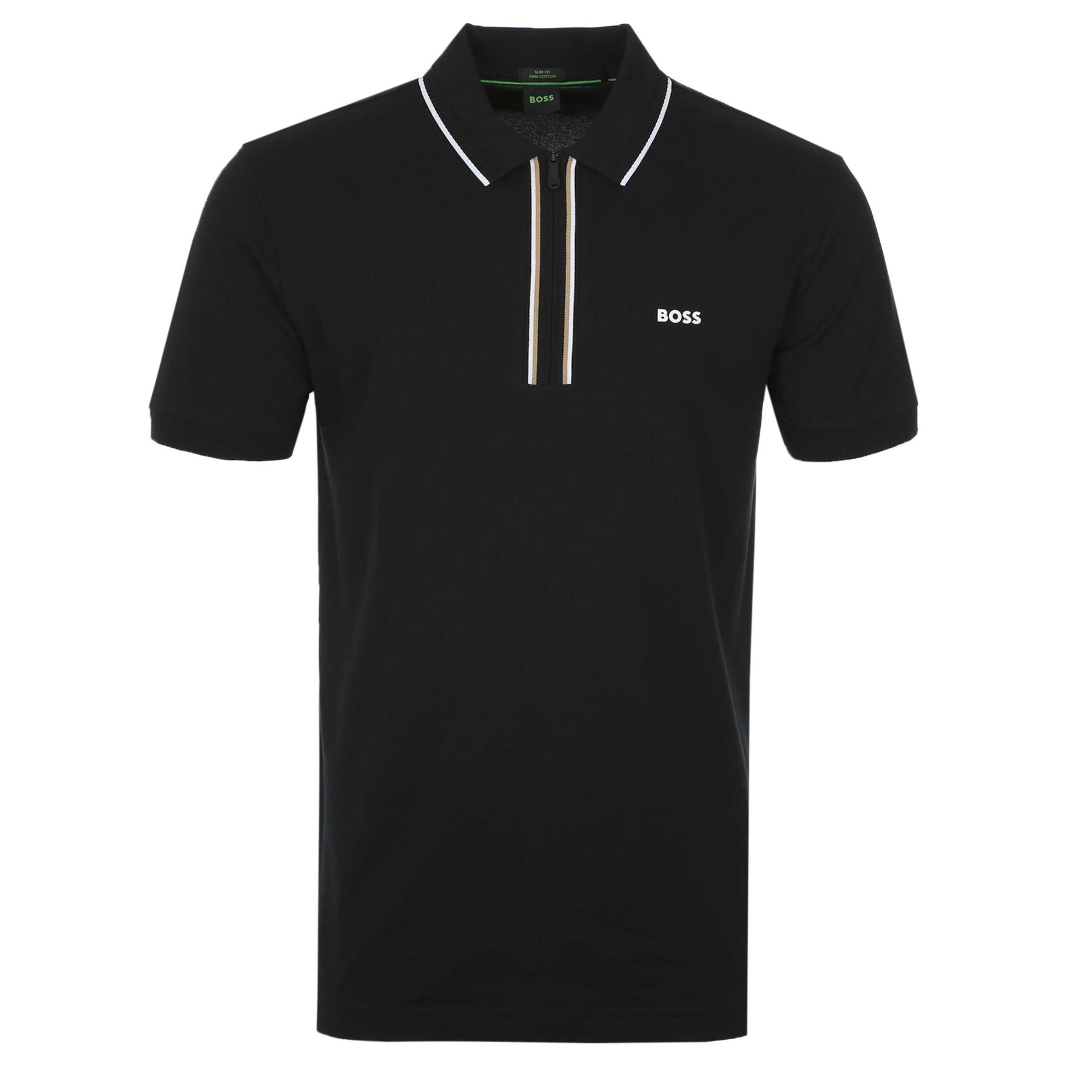 BOSS Philix GOC Polo Shirt in Black. A classic polo shirt by BOSS. This slim fit polo shirt is made with a 4 way stretch cotton. The zip placket is detailed with a contrasting stripe detailing. Stripe detail to the collar. Finished with a contrasting rubber BOSS logo on the chest.
