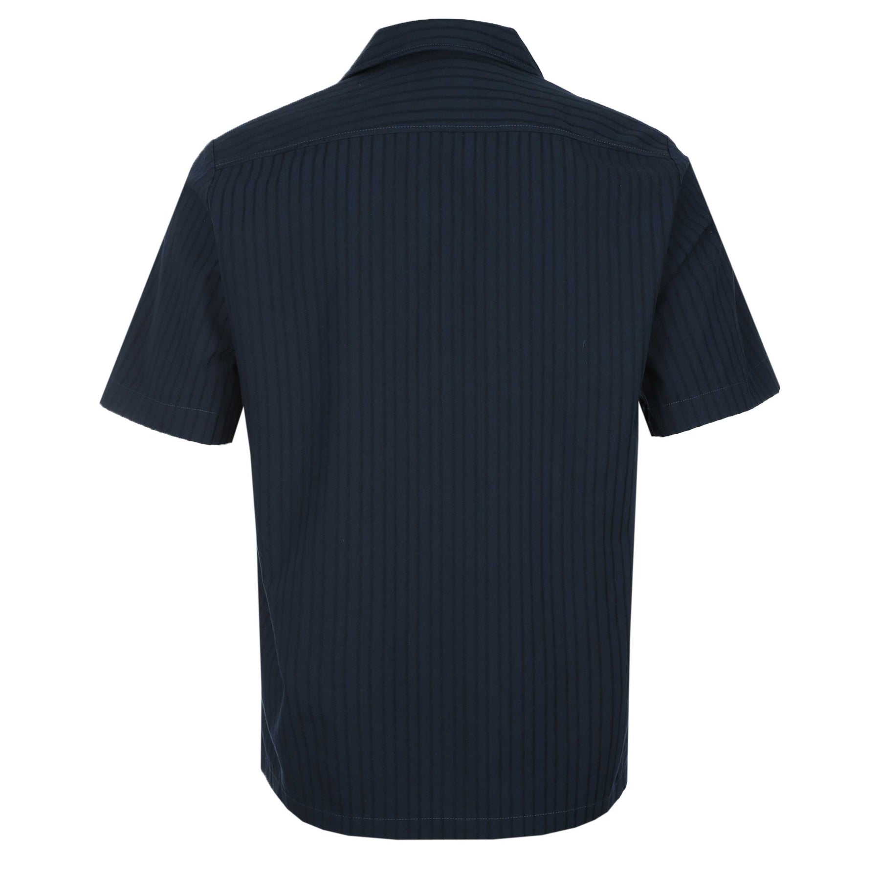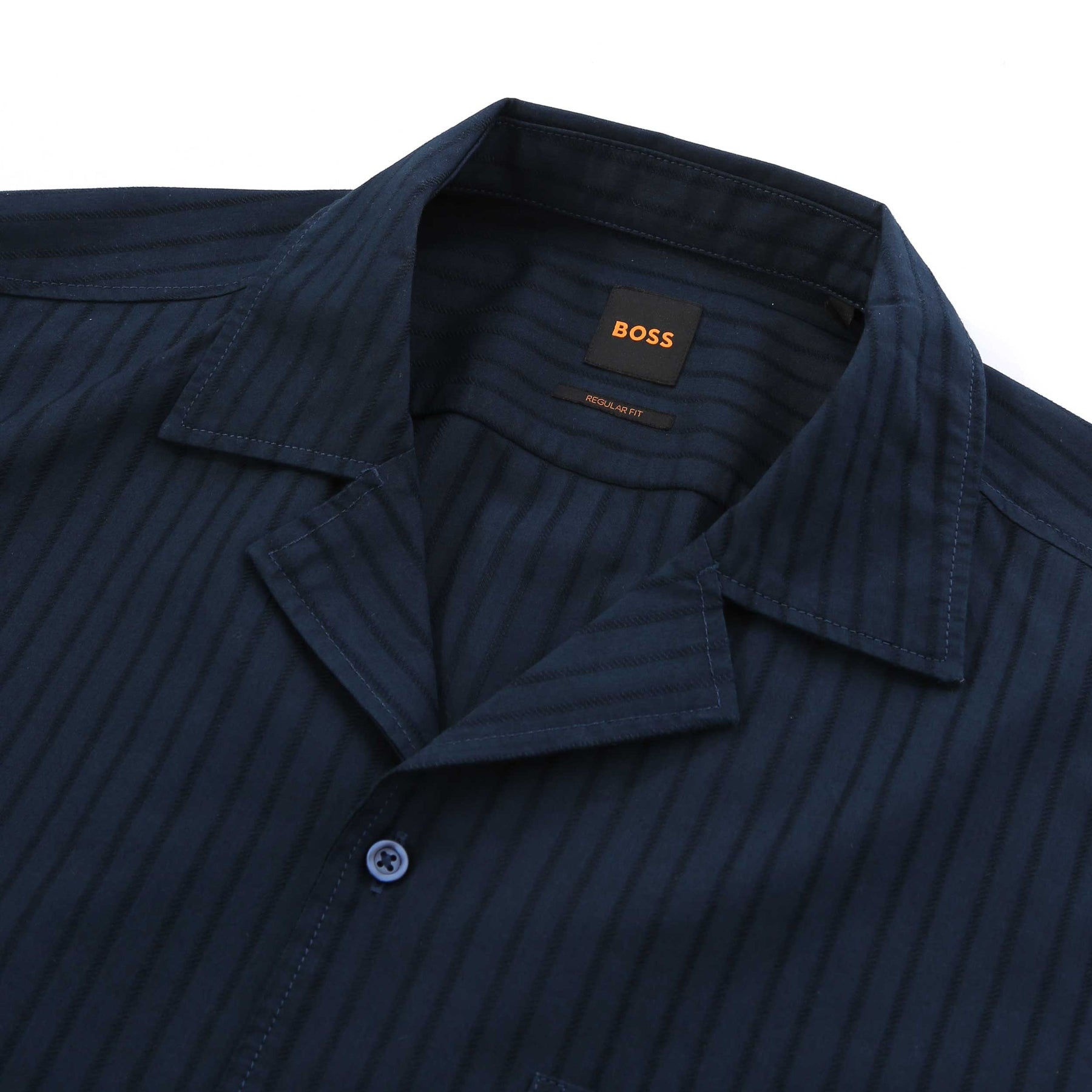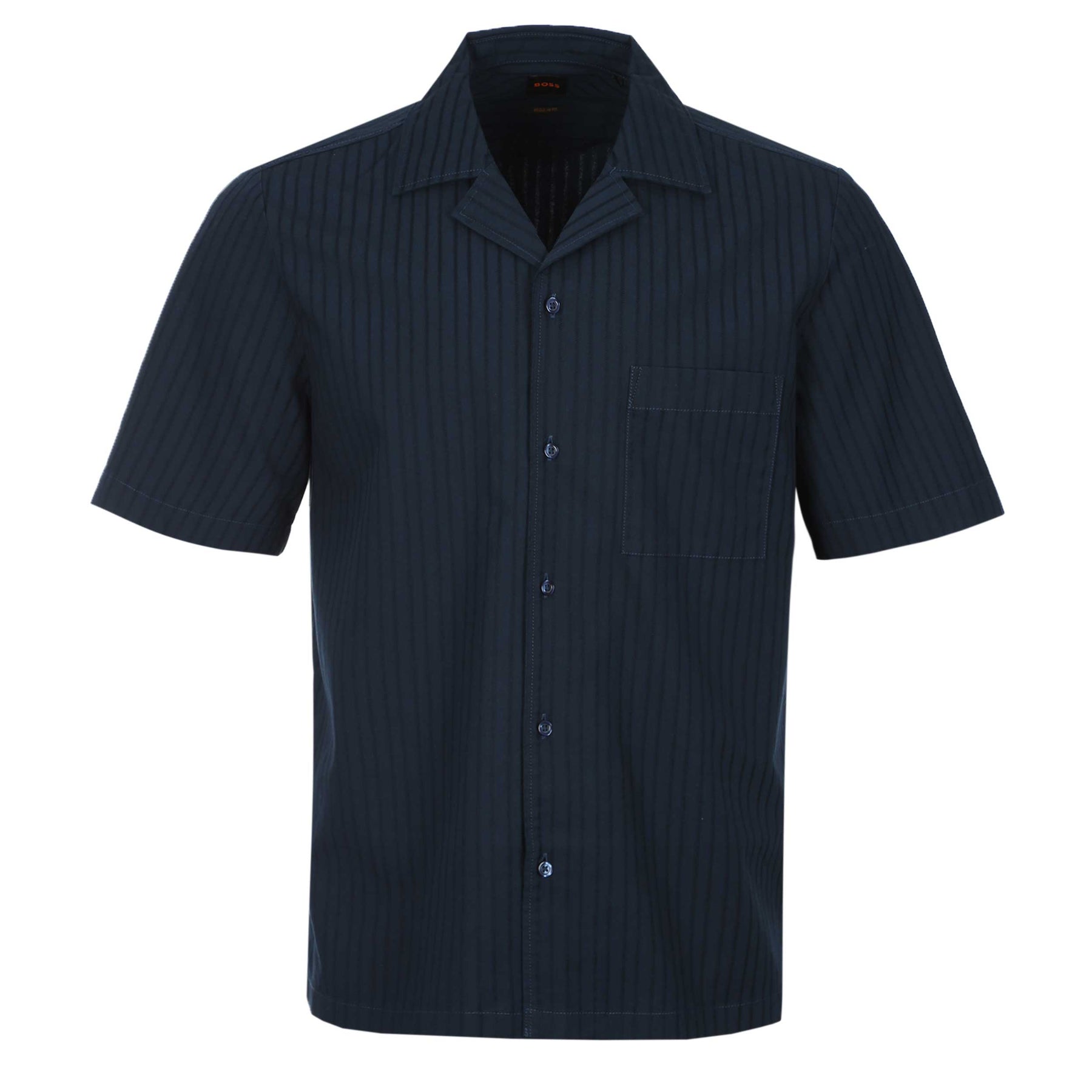 BOSS Rayer M SS Shirt in Dark Blue. Short sleeve shirt by BOSS. A regular fit shirt with a full button placket. This shirt arrives with an all over tonal vertical stripe design design. Cuban style collar. Chest pocket. Perfect short sleeve shirt form those summer days.