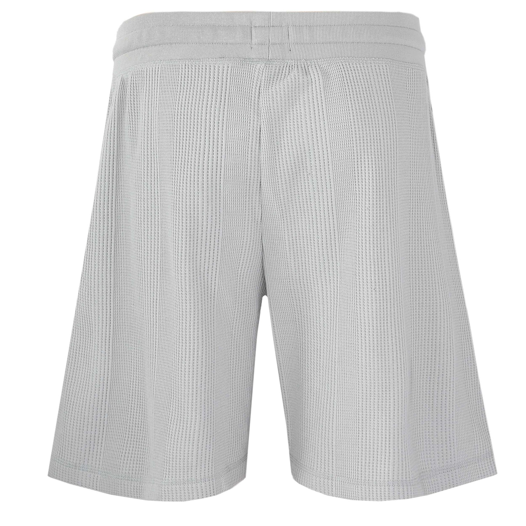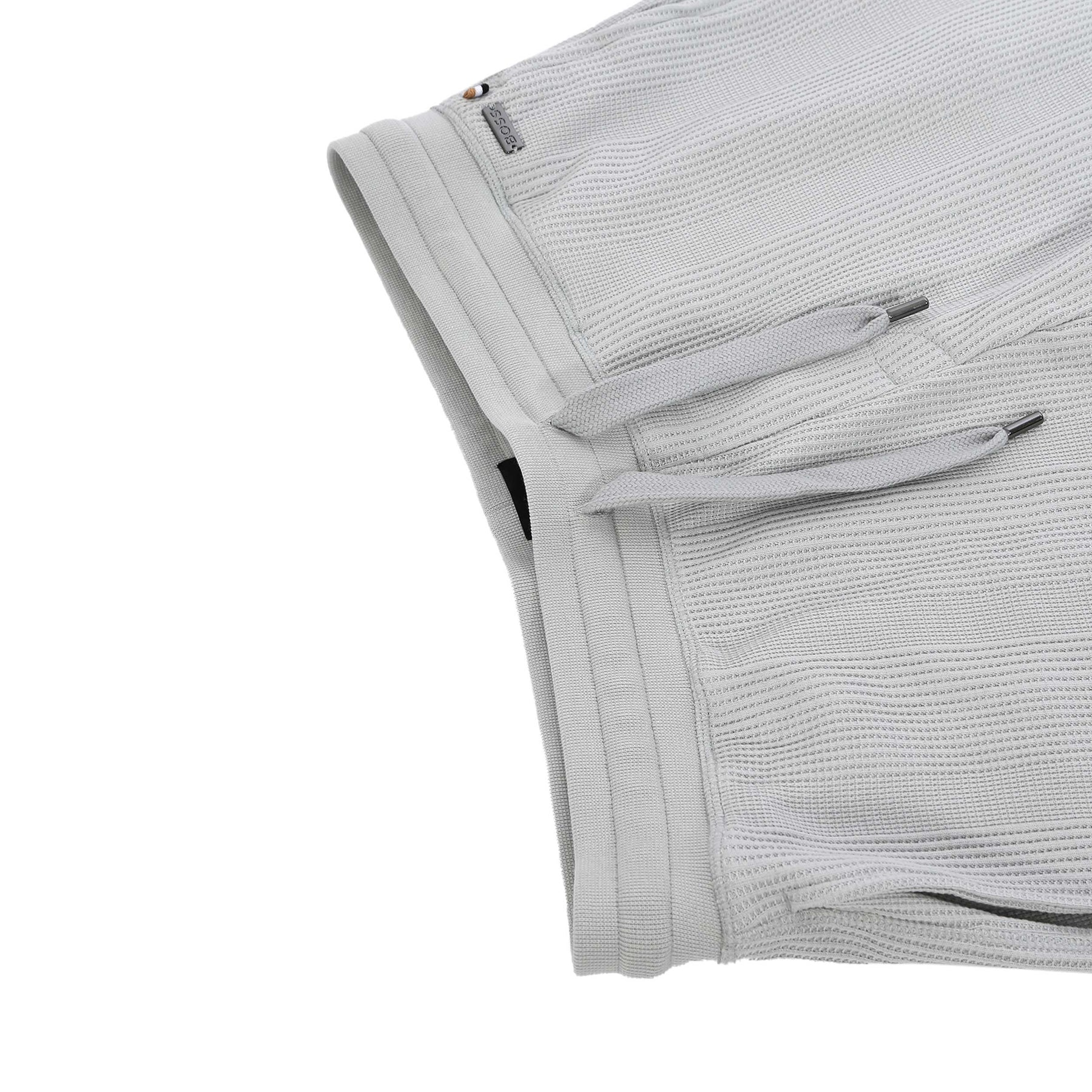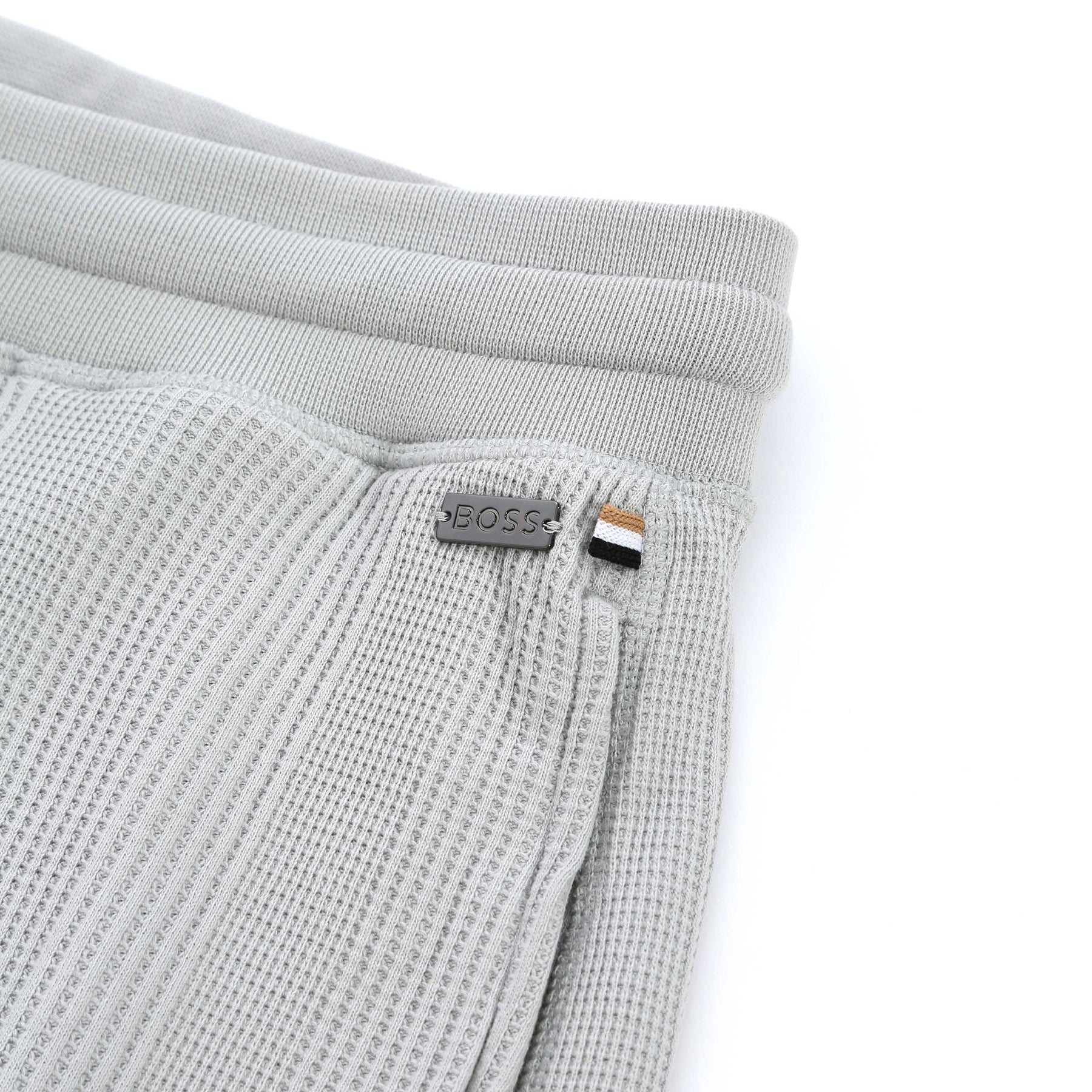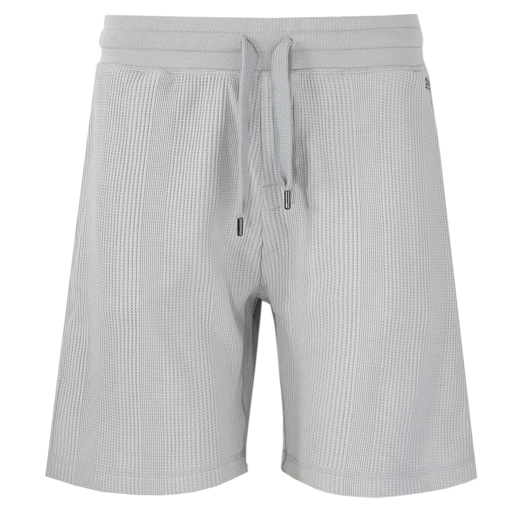 BOSS Structure Shorts Short in Light Pastel Grey. Sweat short by Hugo Boss. These regular fit sweat shorts feature an elasticated waistband with a metal BOSS logo tab. Textured waffle design to the short. Matching t shirt available.