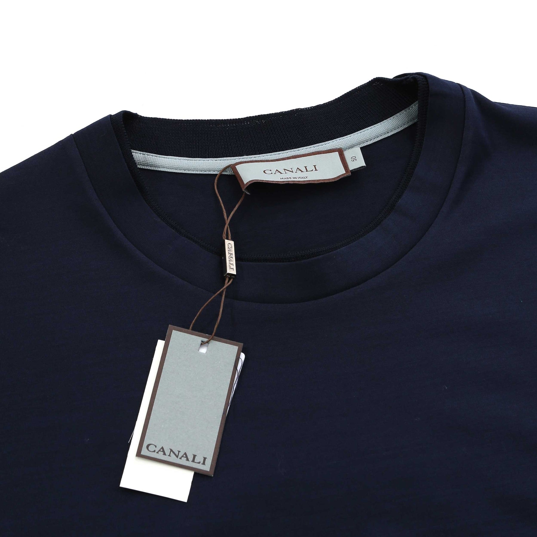 Canali Basic T Shirt in Navy. A crew neck, short sleeve t shirt by Canali. A solid colour t shirt in a plain design. Ribbed trim to the neckline. Perfect t shirt to layer up with a shirt or jacket.