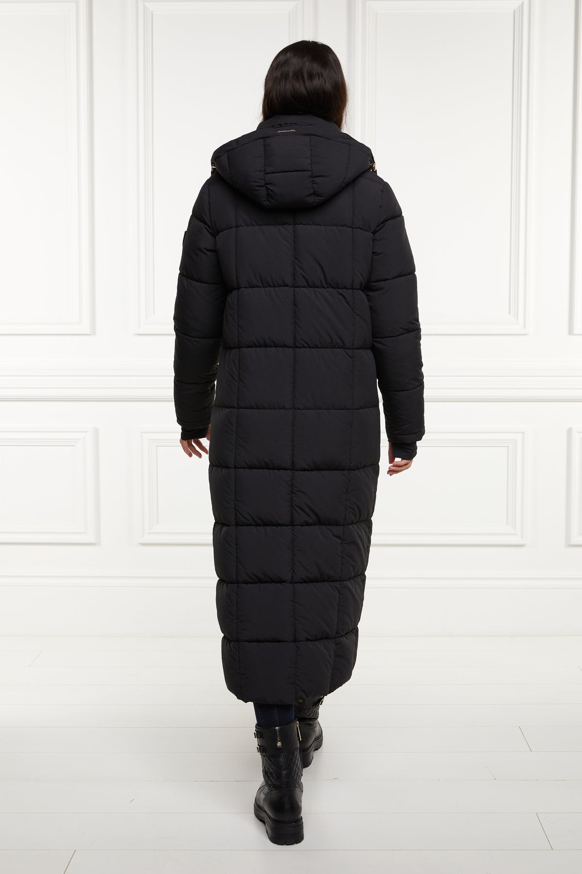 Holland Cooper Carrington Longline Coat in Black. A classic jacket by Holland Cooper. This longline jacket is designed with an oversized and relaxed fit. It has storm cuffed sleeves and a quilted body to ensure warmth. Thmb holes design to the storm cuffs. Internal carry straps, waterproof zips and a zip fastening. Detailed with Holland Cooper branding. Detachable drawstring hood. Stand collar with tonal logo to the rear of the neck.
