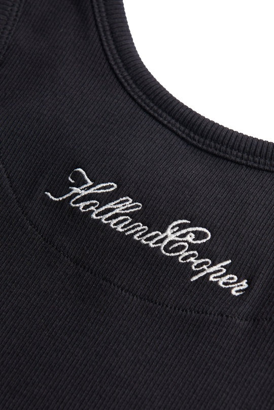 Holland Cooper Rebecca Rib Tank in Black. Elevate your everyday wardrobe with this refined essential, designed with timeless British sophistication. Crafted from a premium cotton-elastane blend, it offers a smooth, breathable feel with just the right amount of stretch for all-day comfort. Expertly tailored in a sleek slim fit, it creates a clean, flattering silhouette while maintaining effortless wearability. Finished with the signature HC embroidery at the neckline, this understated detail adds a subtle mark of heritage luxury, making it a versatile foundation piece for both smart and casual styling.