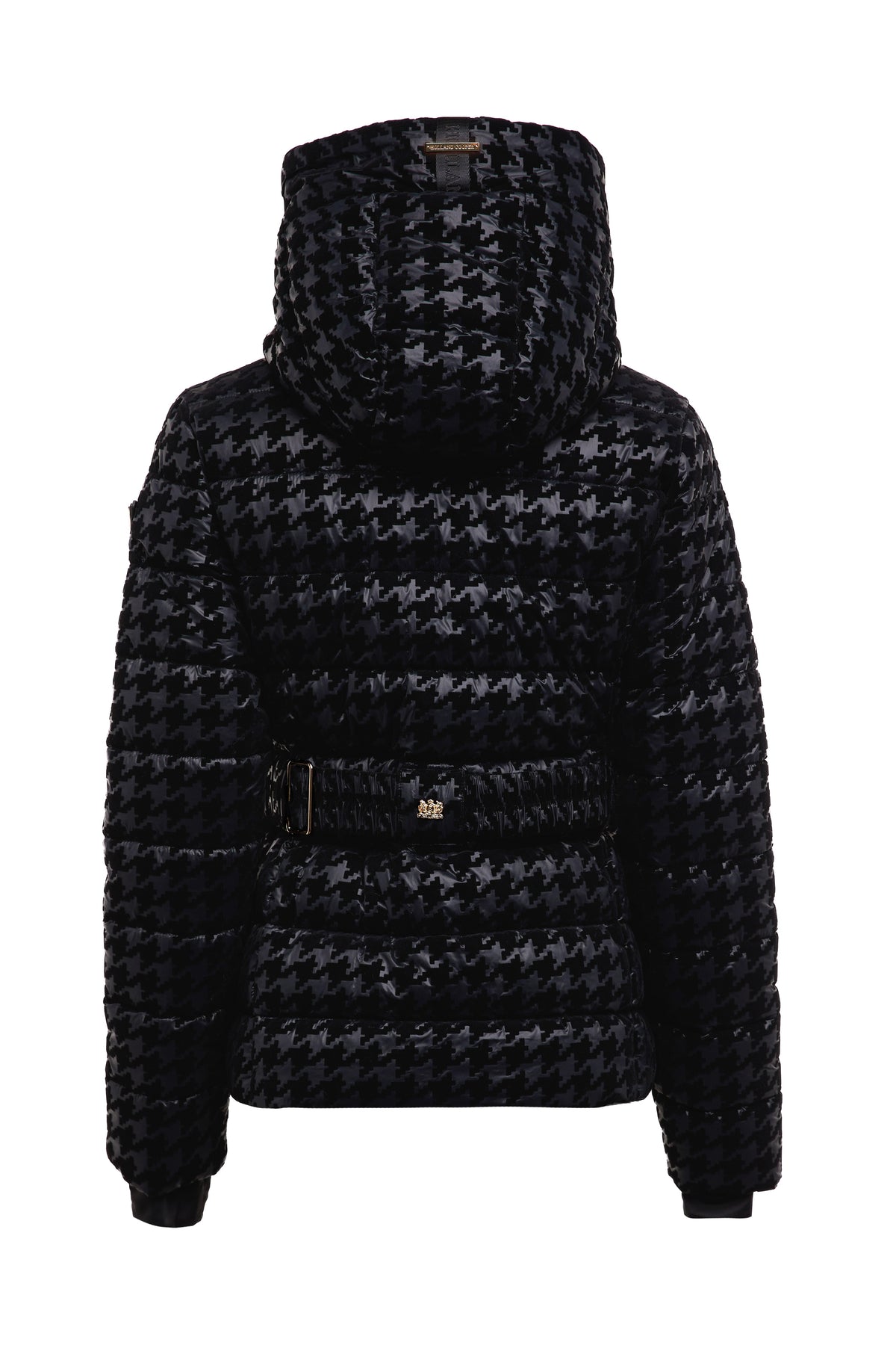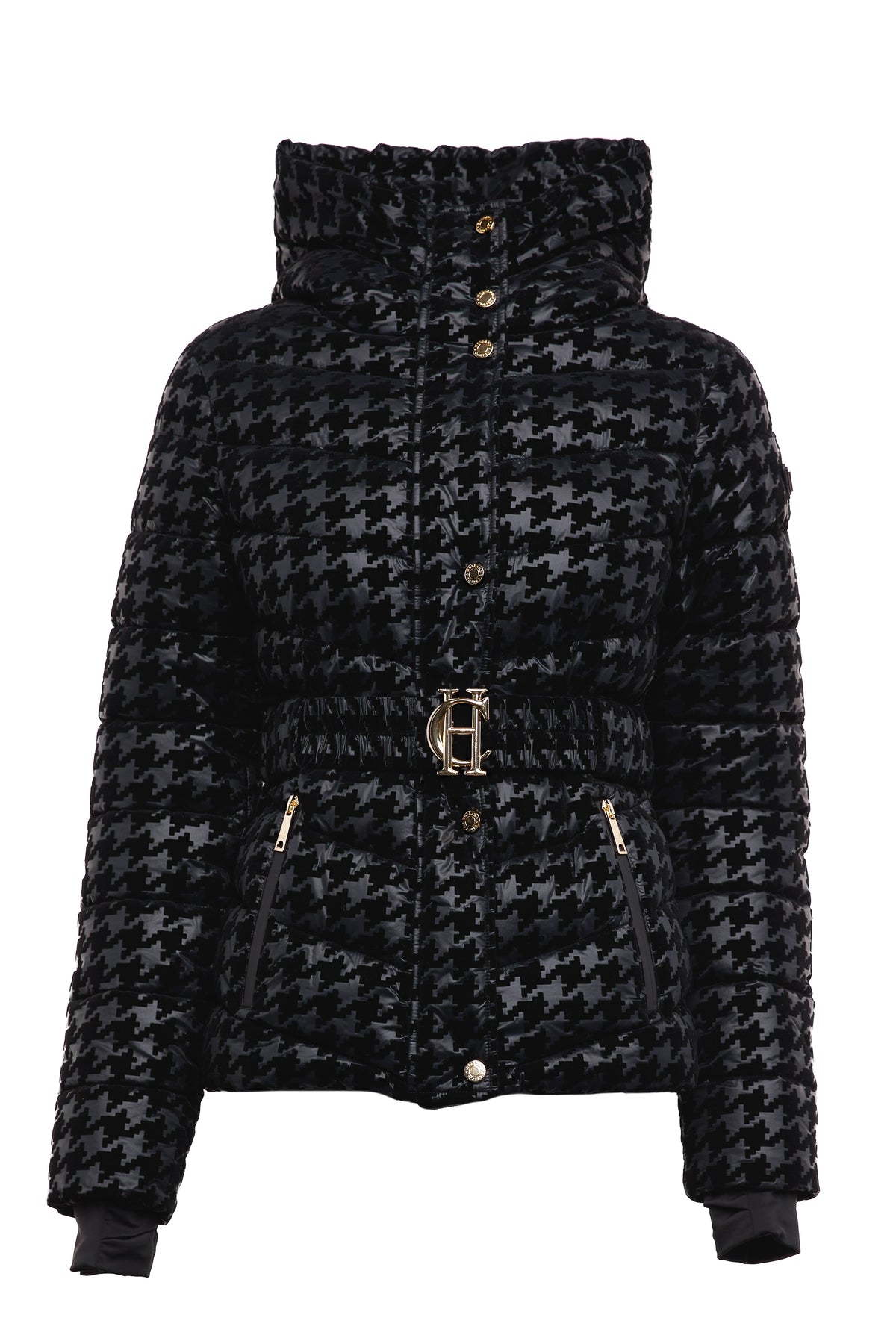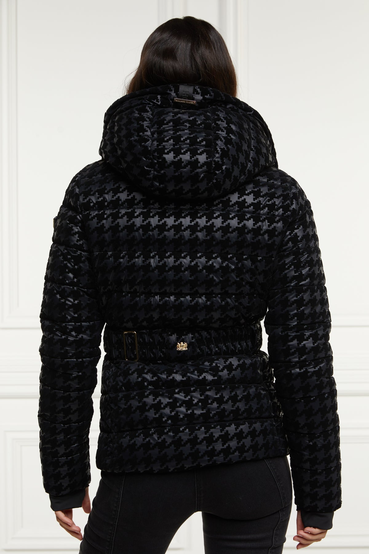 Holland Cooper Vermont Ladies Jacket in Mono Houndstooth. Holland Cooper puffer style coat features an over sized collar with a hood. Quilted design to the jacket. Soft velour touch houdstooth design. Full zip fastening with a detachable hand-plated gold Holland Cooper signature logo buckle waist belt. Two zip pockets to the front of the jacket and one to the chest. Holland Cooper logo badge to the left sleeve. Snap button detailing to the cuffs.