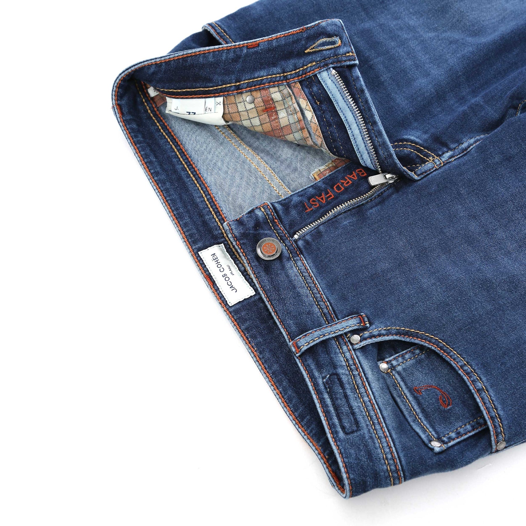 Jacob Cohen Bard Zip Tan Badge Jean in Mid Blue Denim. A high quality jean by Jacob Cohen. They feature a 5 pocket jean style and a tan Jacob Cohen horse hair logo badge. Zip fly fastening with embroidered detailing. The jean is treated using extraordinary techniques creating vintage looks by means of abrasion, washing, embroidery all preformed in-house by hand.