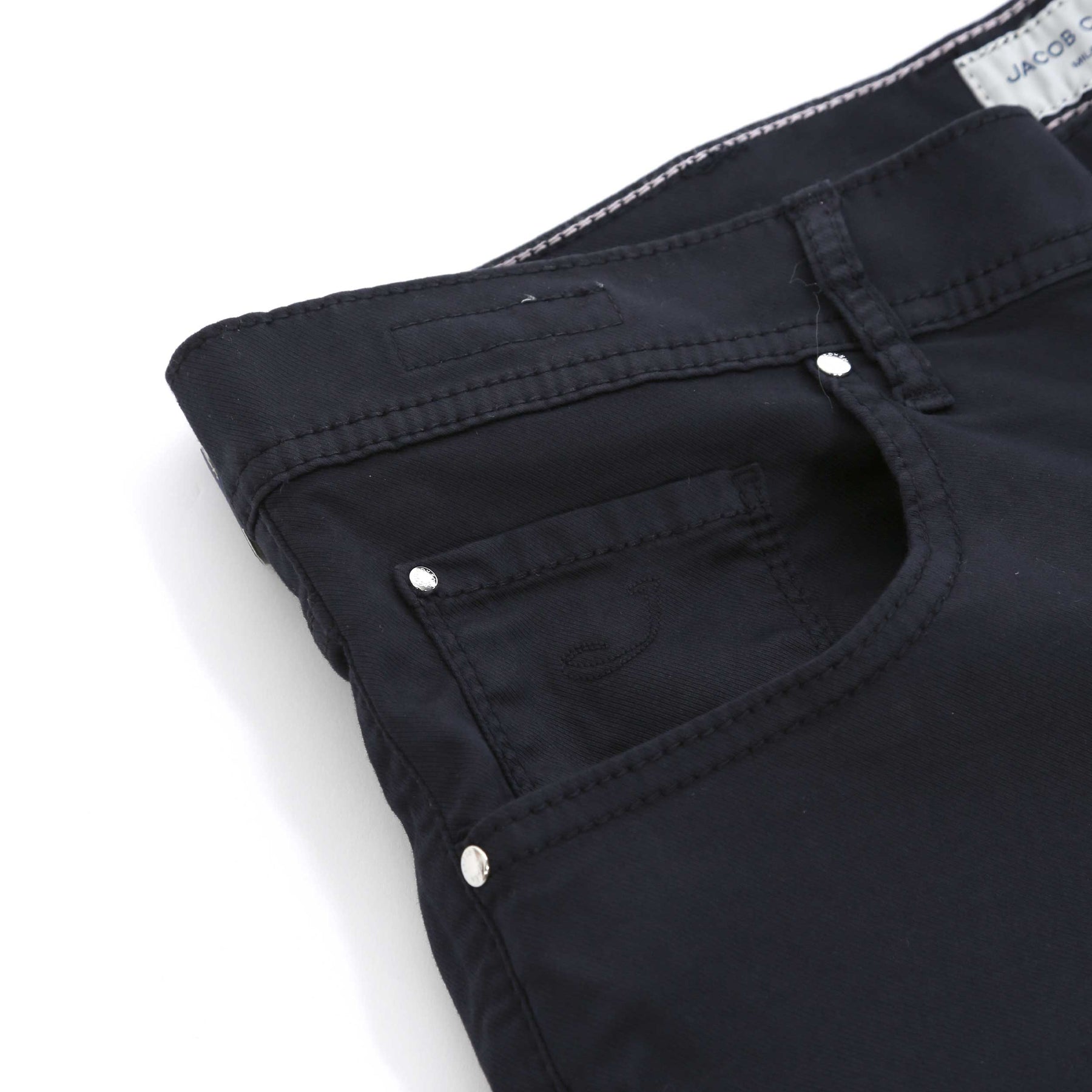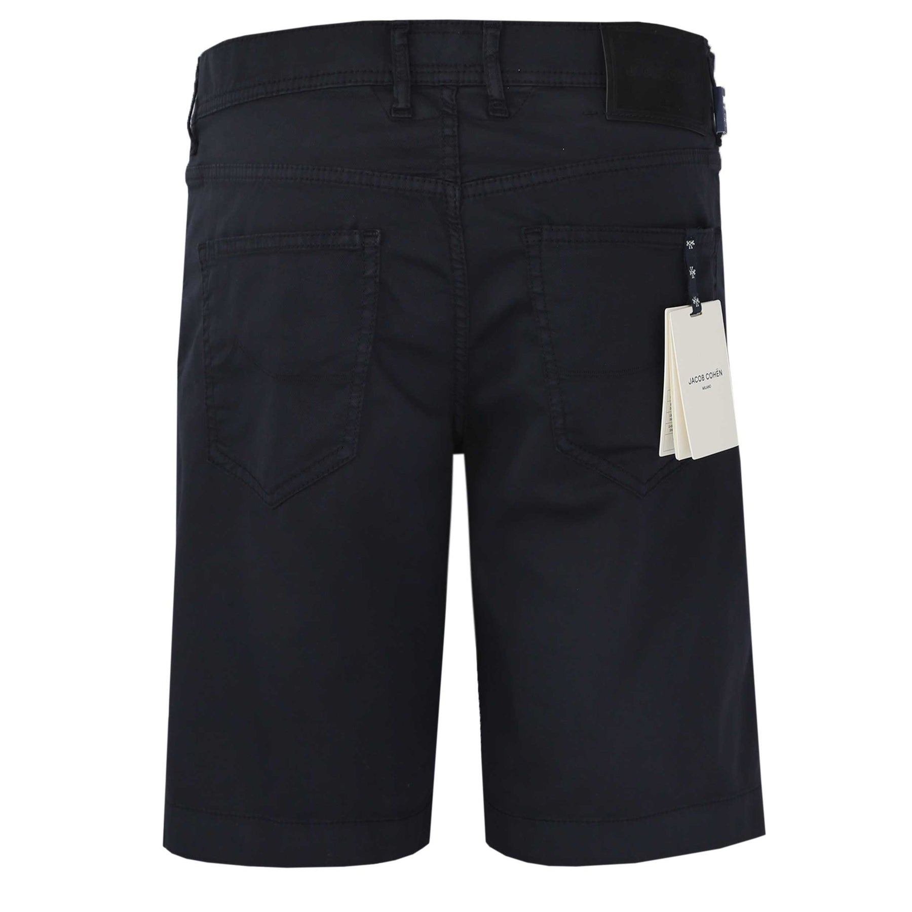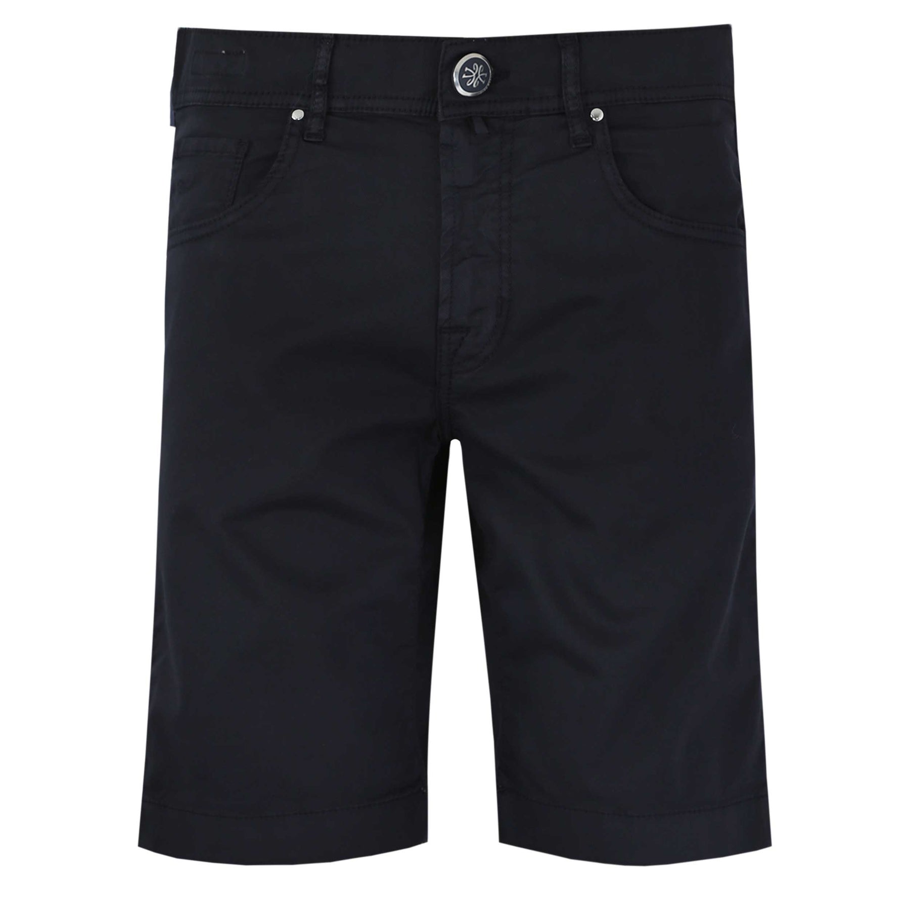 Jacob Cohen Nicholas Short in Navy. A high quality, cotton blend short by Jacob Cohen. They feature a 5 pocket jean style and a Jacob Cohen brand badge to the rear. Button and fly zip fastening. Tonal grained leather logo badge to the waistband.