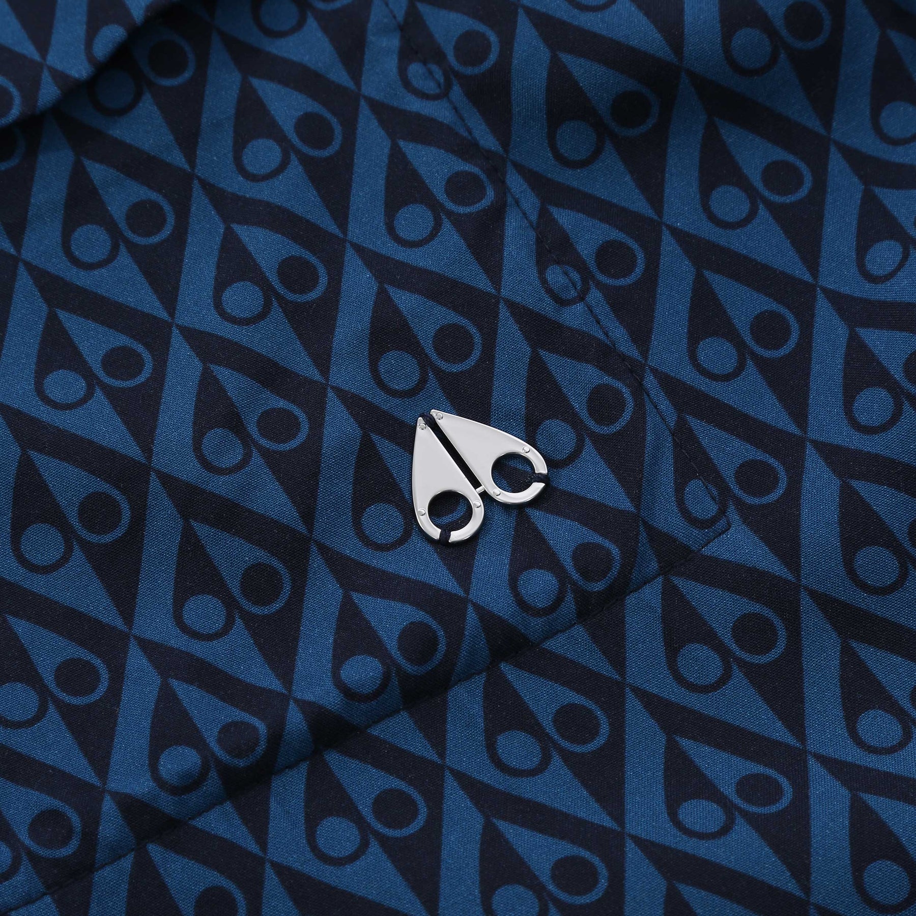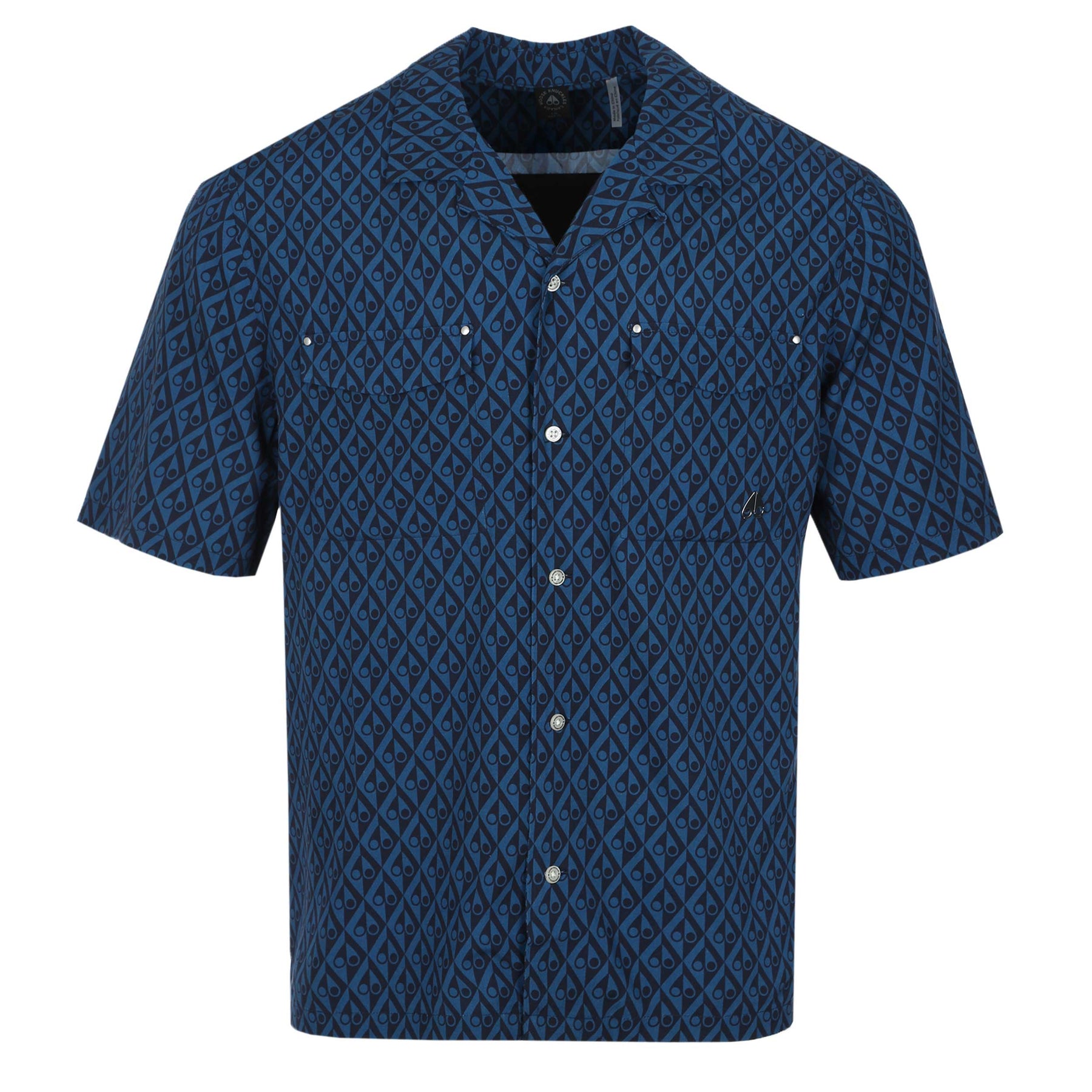 Moose Knuckles The Bay Shirt in Navy Combo. A regular fit shirt with a full button fastening placket. Cuban collar shirt with short sleeves. All over Moose Knuckles logo design to the shirt. Chest pocket with a metal Moose Knuckles logo badge. Matching swim short available.