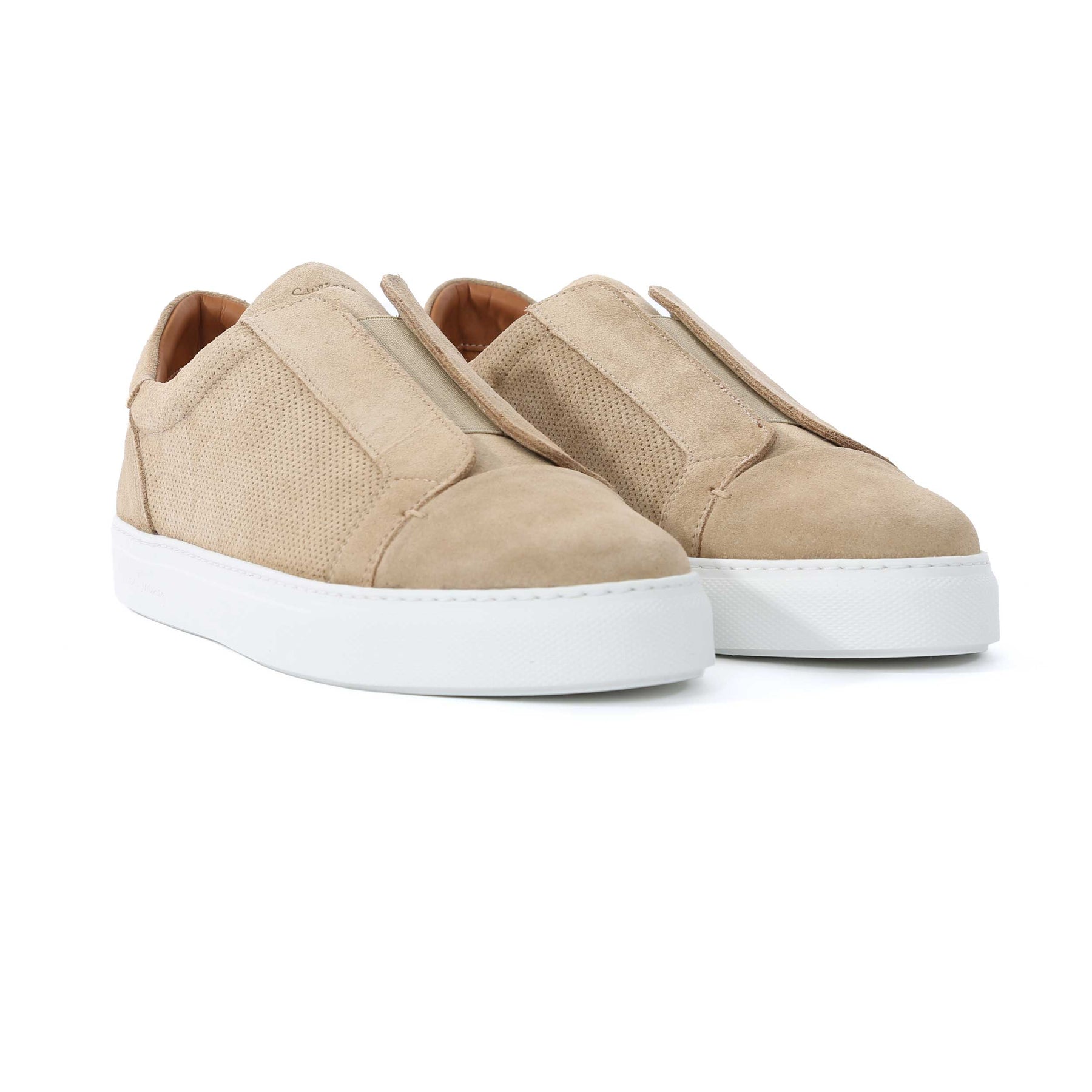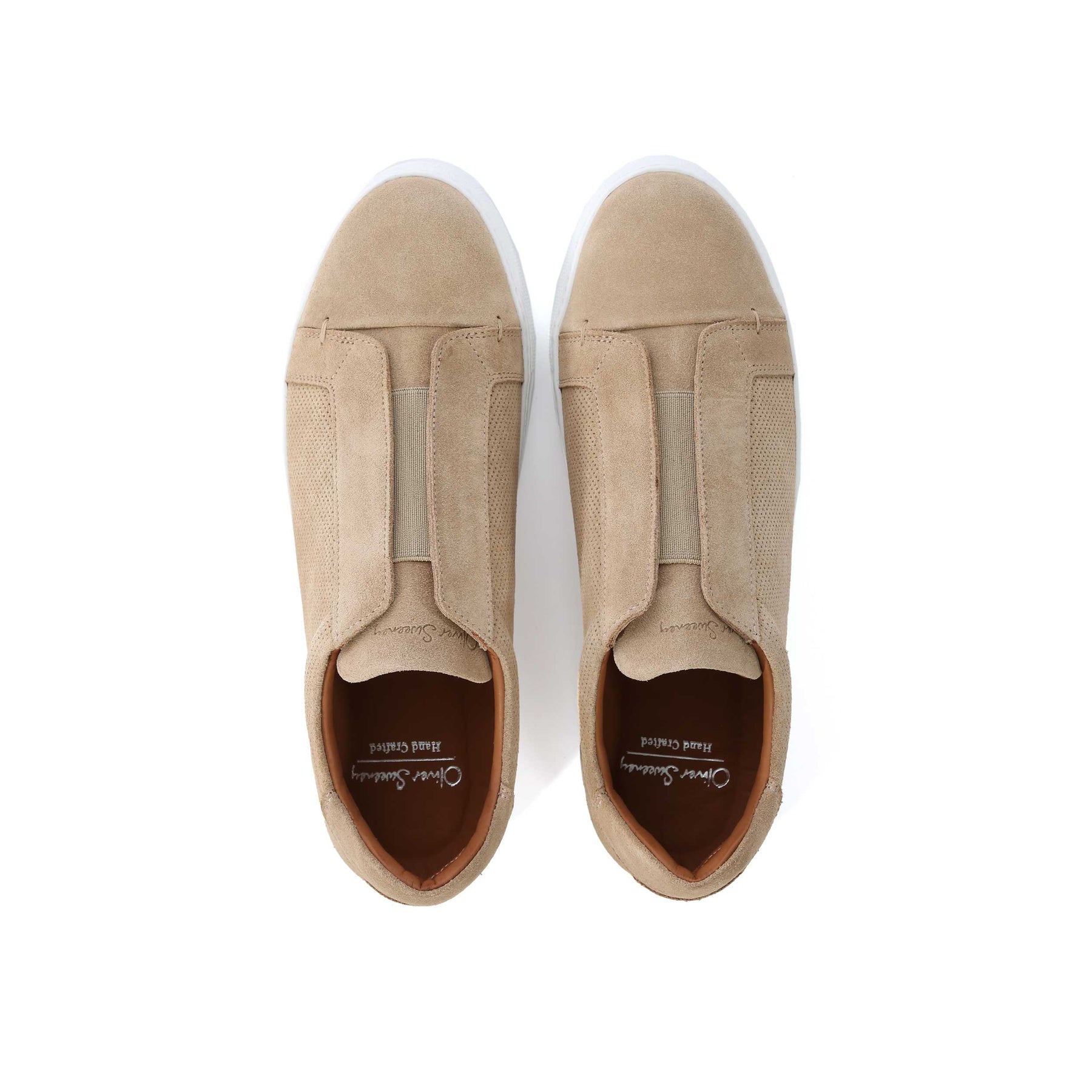 Oliver Sweeney Valezim Trainer in Sand Suede. A handmade trainer by Oliver Sweeney. This slip on suede trainer has a plain design with an elasticated strap for a secure and perfect fit. Perforated side panel detailing with a contrasting white sole. Padded collar. Embroidered tonal stitch logo to the heel panels. Signature Oliver Sweeney logo to the sole unit. A smart trainer to compliment jeans or shorts.