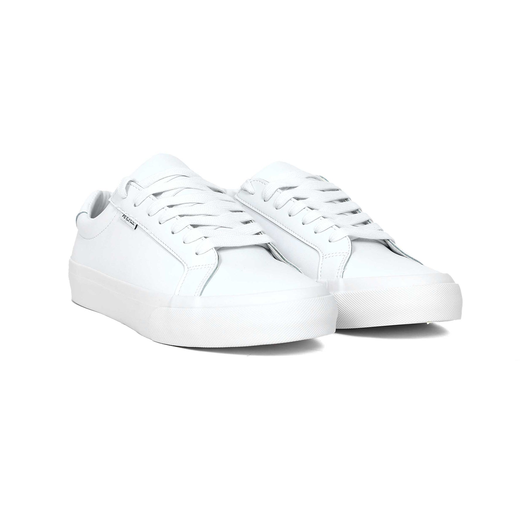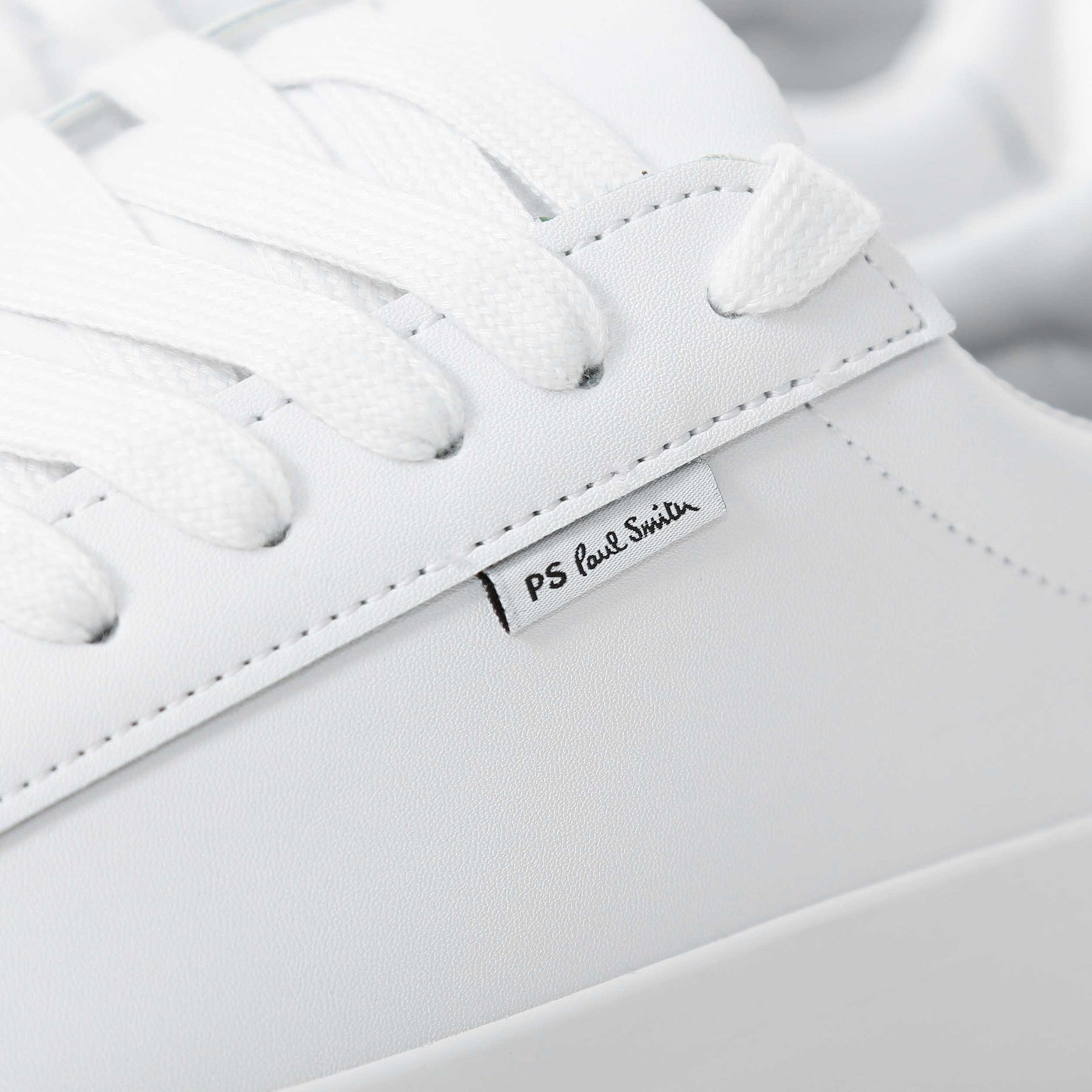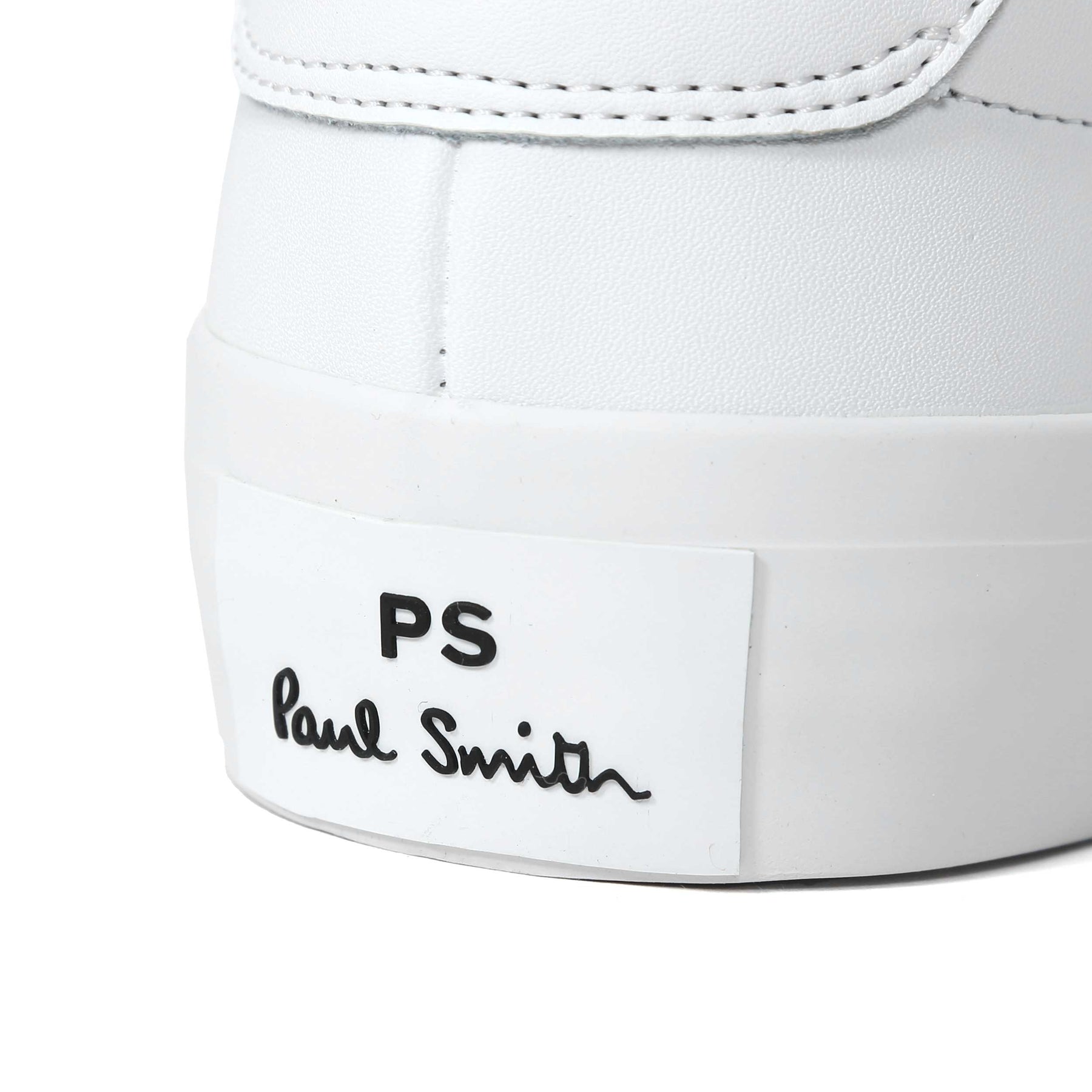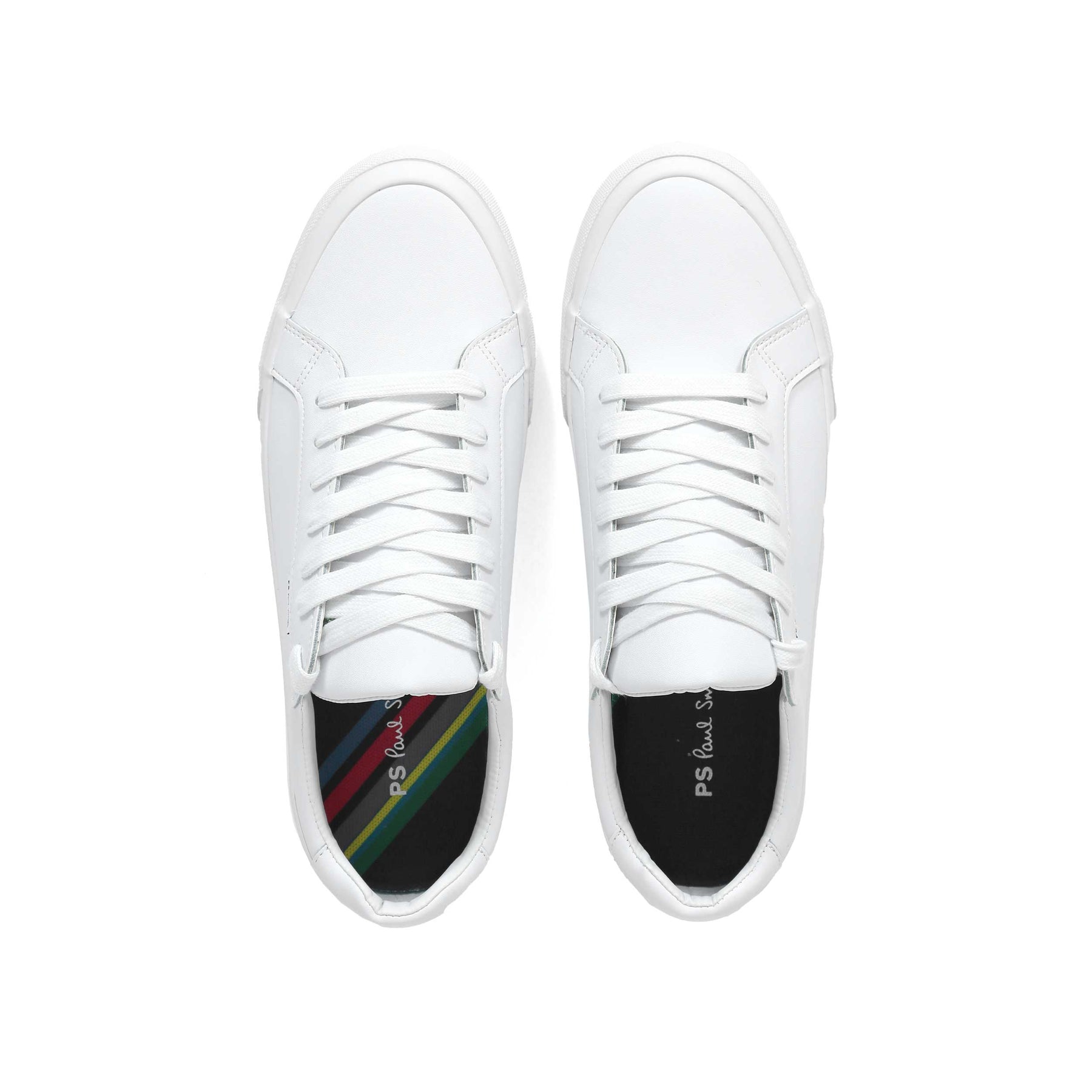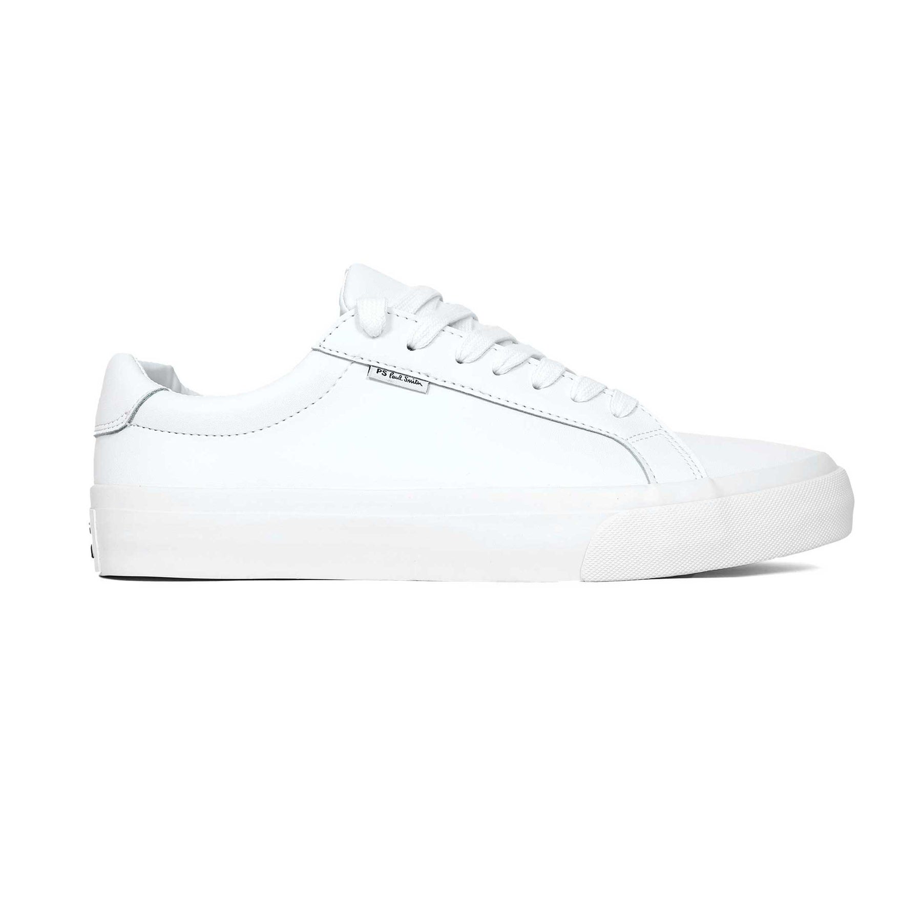 Paul Smith Amos Trainer in White. A premium trainer by Paul Smith. Plain leather trainer. Paul Smith branding to the heel of the sole unit and side panel of the trainer. Tonal rubber sole unit. Classic Paul Smith multicoloured branding to the aglet of the lace. Perfect for everyday wear.