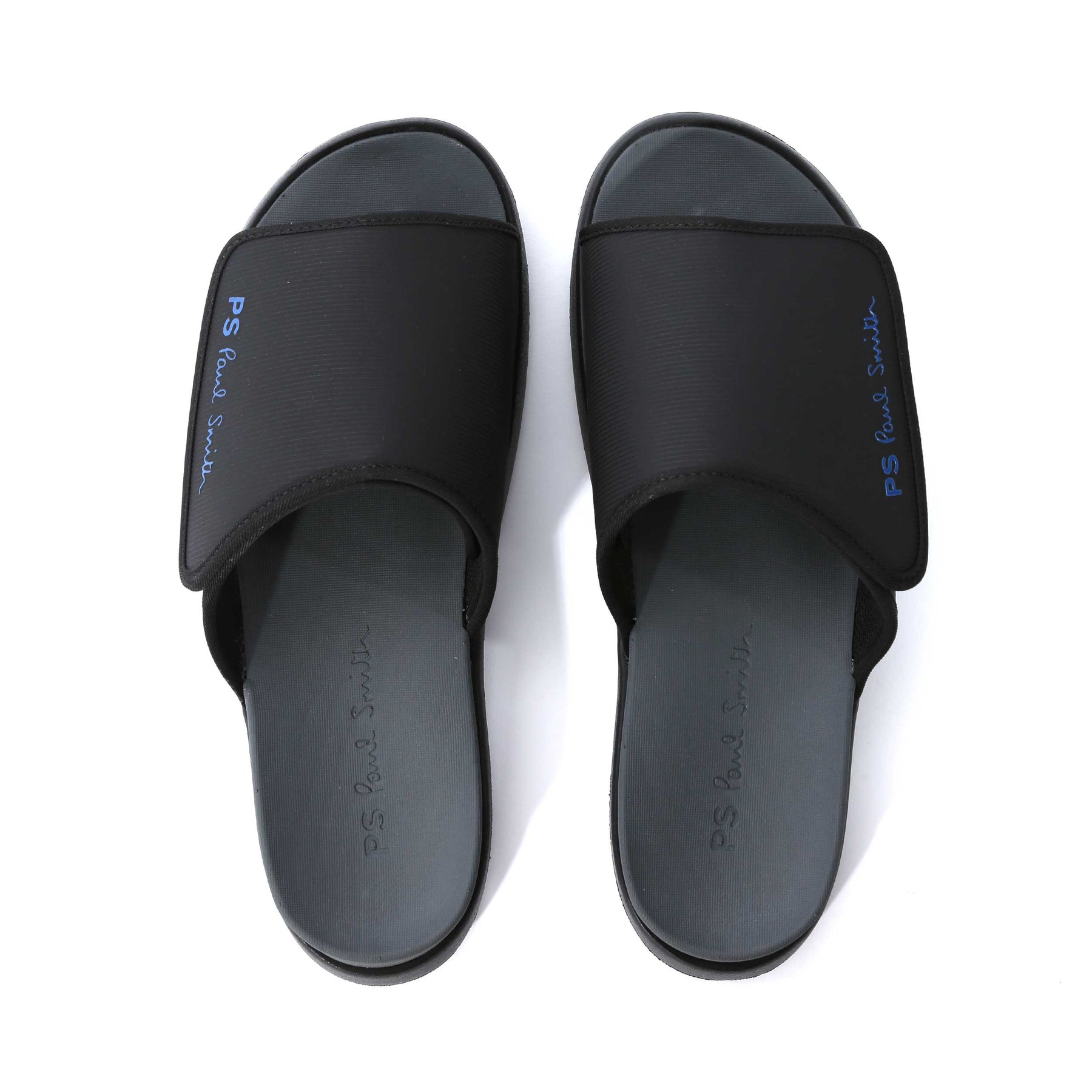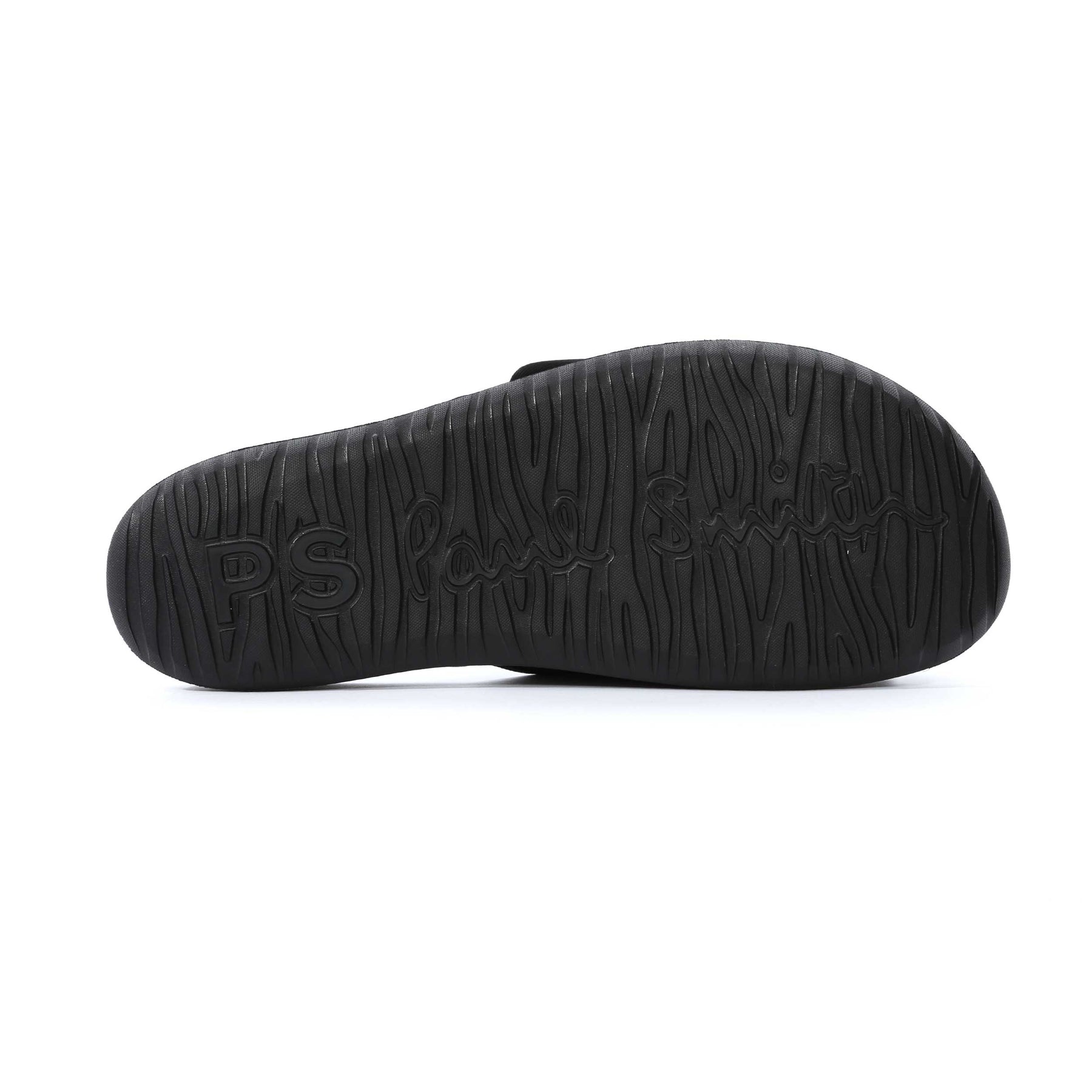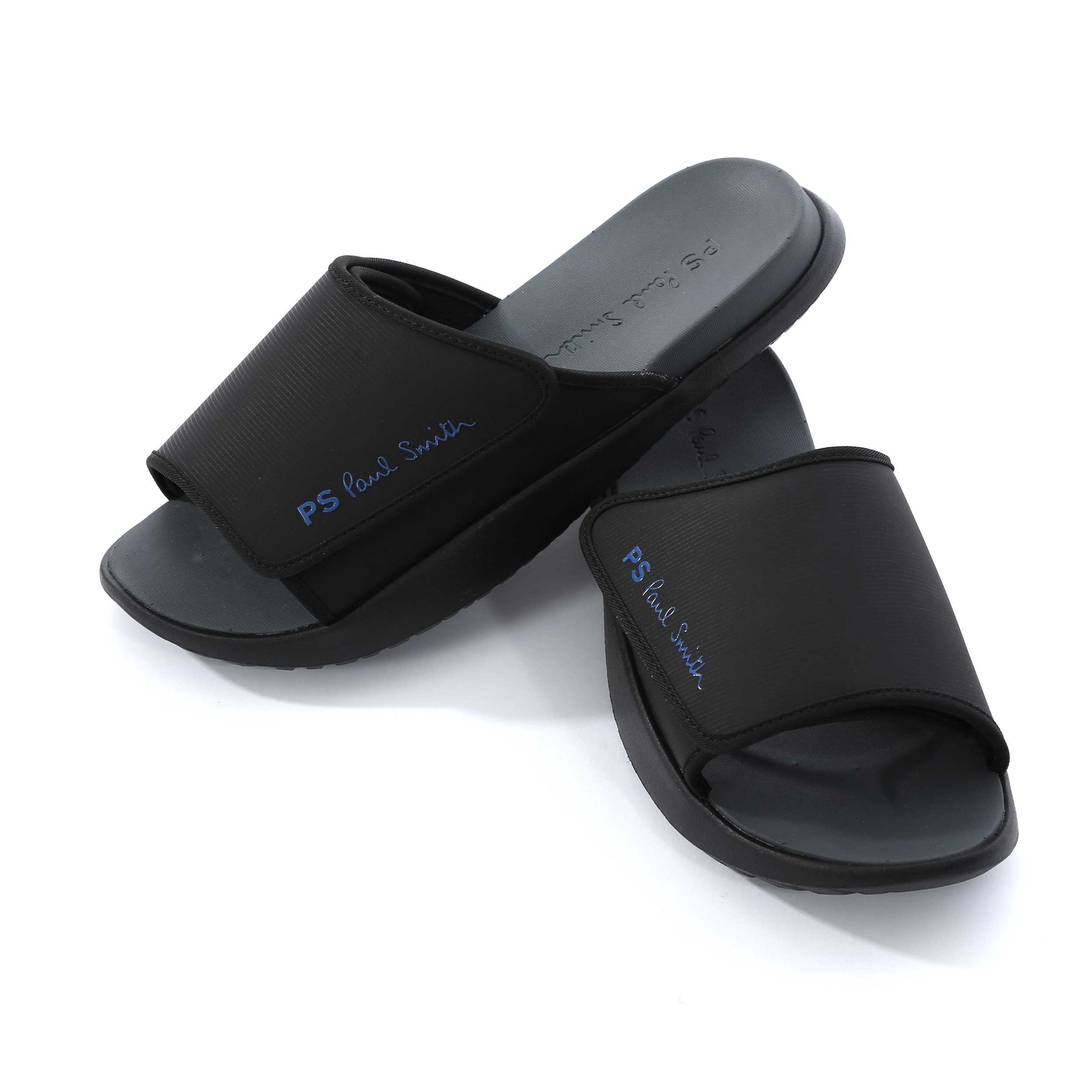 Paul Smith Chiba Slide in Black. Contoured cushioned footbed for comfort. Sleek and contemporary finish. Featuring a velcro fastening strap and contrasting colour printed logo on the strap, they blend effortless style with signature branding. Designed for both comfort and durability, the treaded sole showcases a distinctive zebra-embossed pattern. Perfect for warm-weather styling, these slides are a must-have for the season.