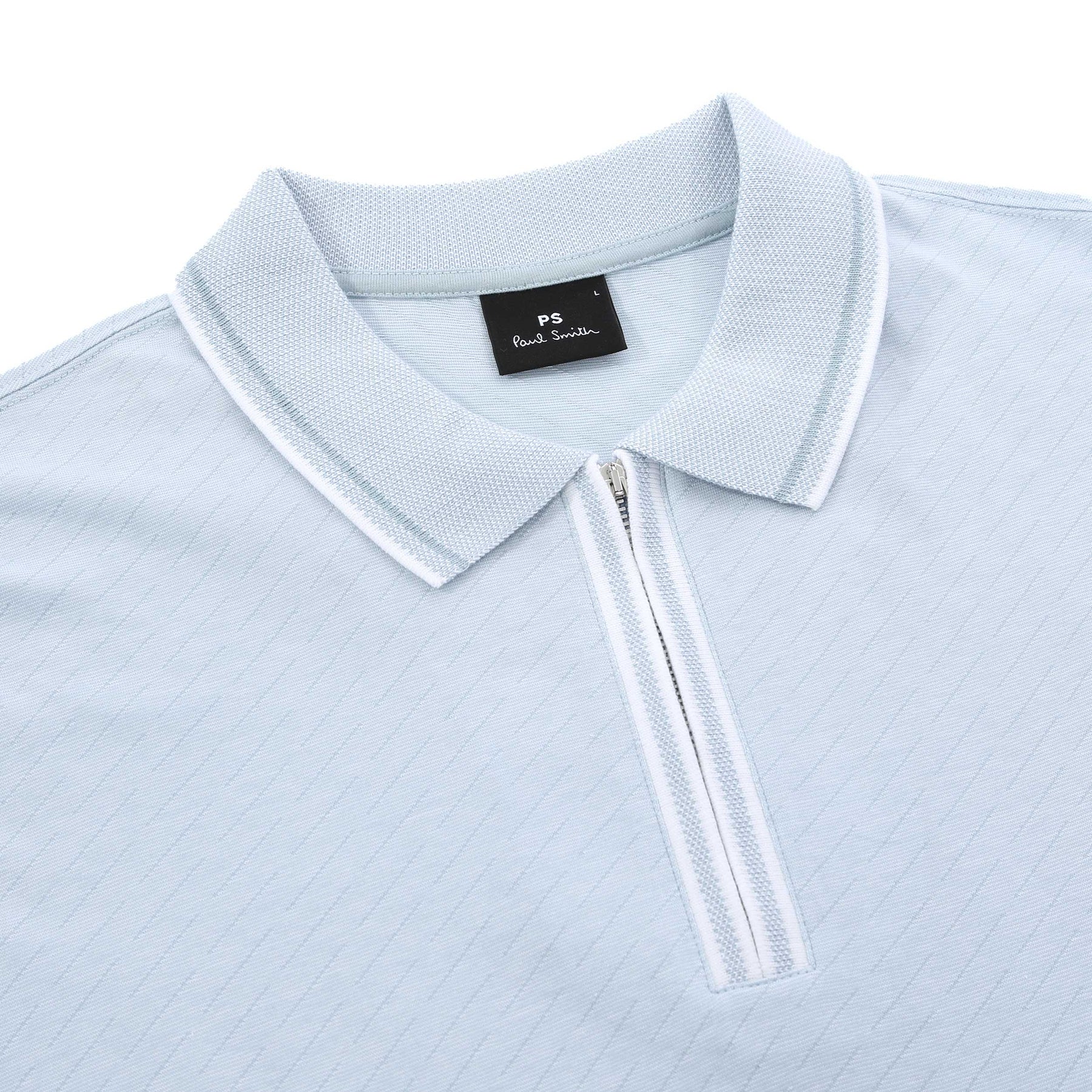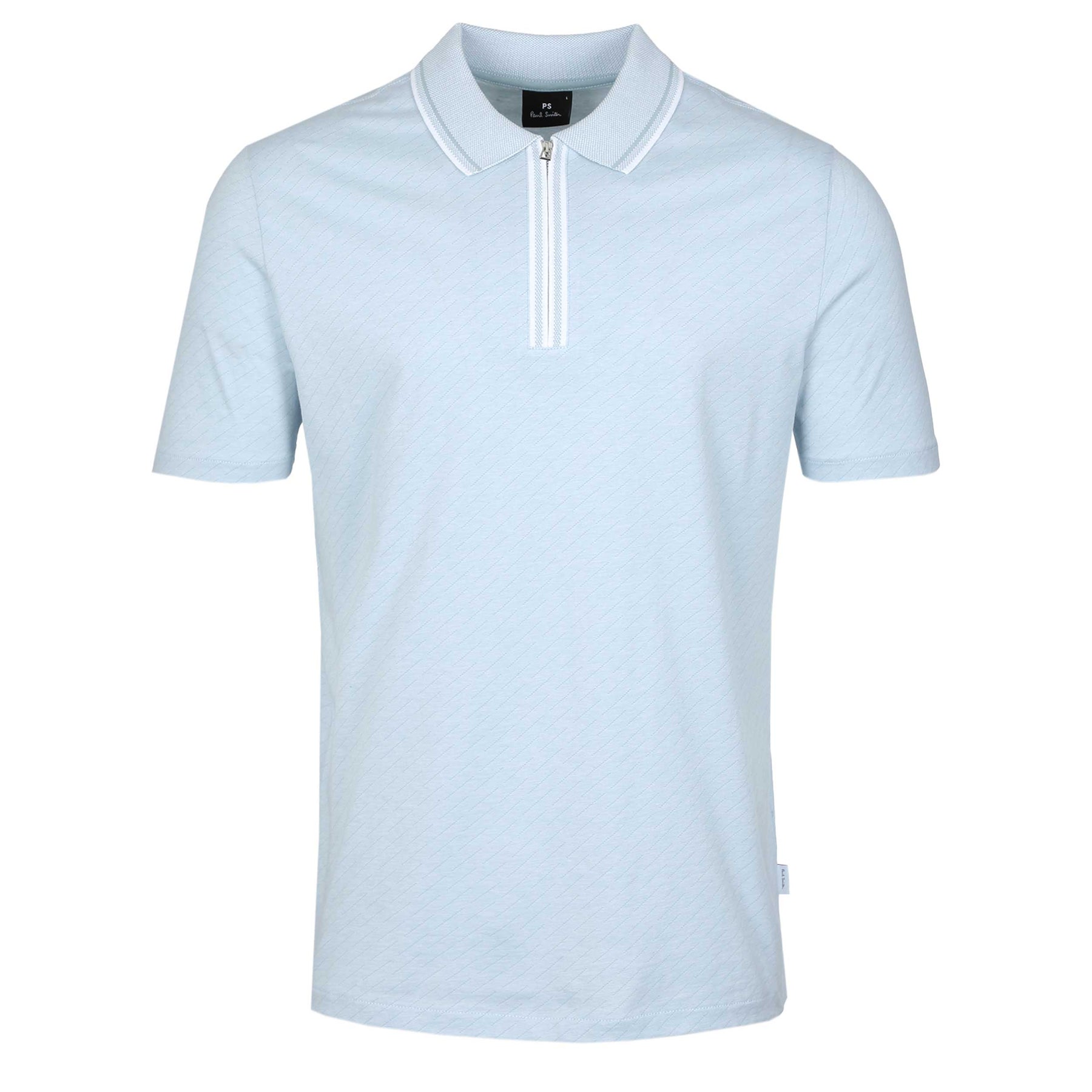 Ideal for the discerning gentleman who appreciates the fusion of comfort and quality, the Paul Smith Diagonal Print Zip Polo Shirt in Sky Blue is like no other garment in your closet. Complete your fashion ensemble with this versatile piece that pairs well with tailored trousers or classic denim.