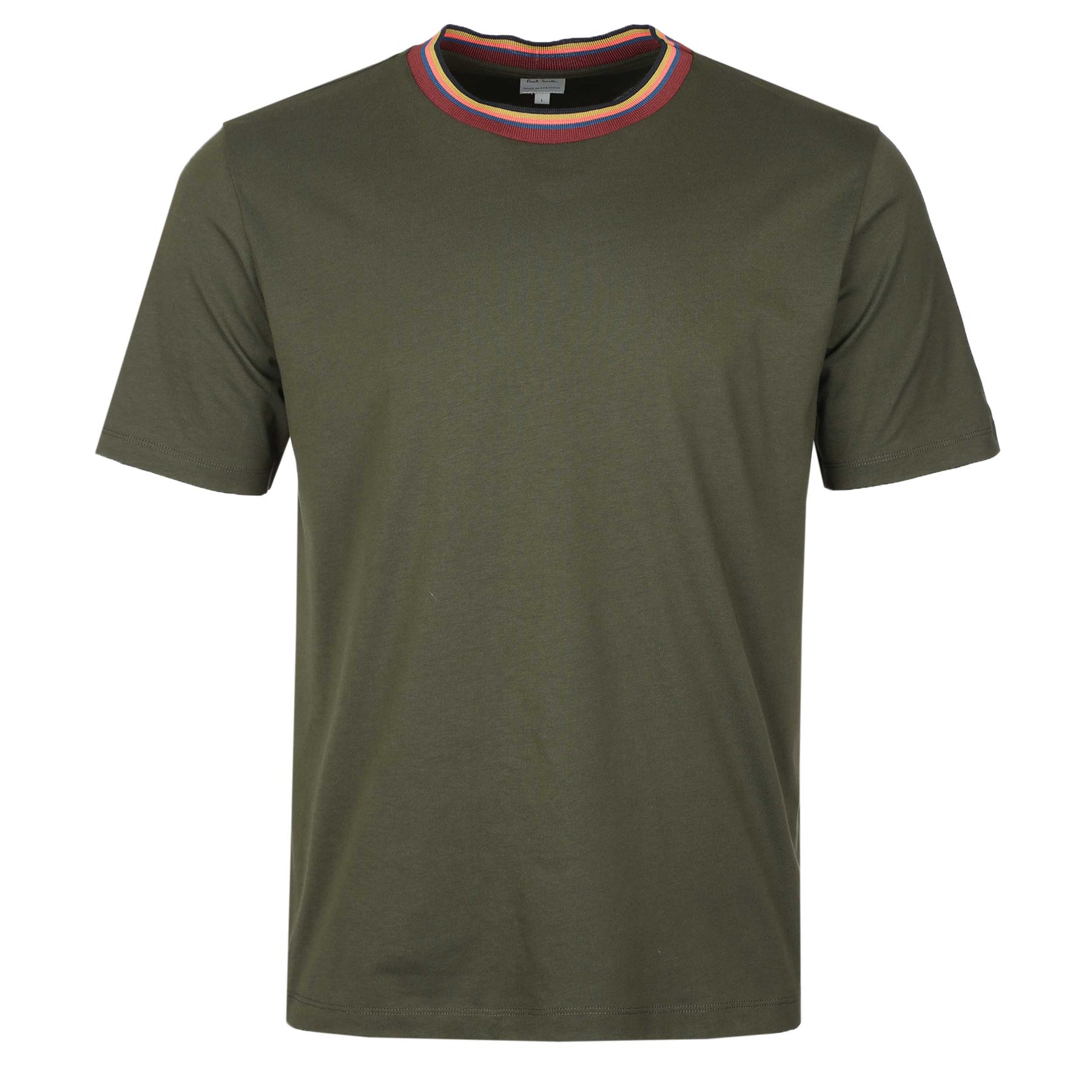 Paul Smith Stripe Rib T Shirt in Army Green. A classic T shirt by Paul Smith. With a crew neck and short sleeves. A plain design with a contrasting multi-coloured stripe neckline. Paul Smith branding to the nape of the neck.