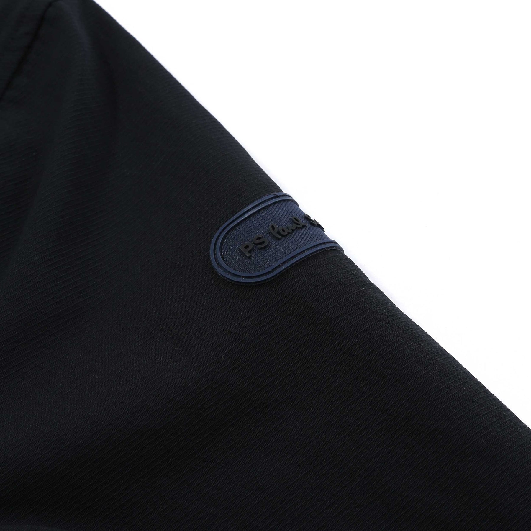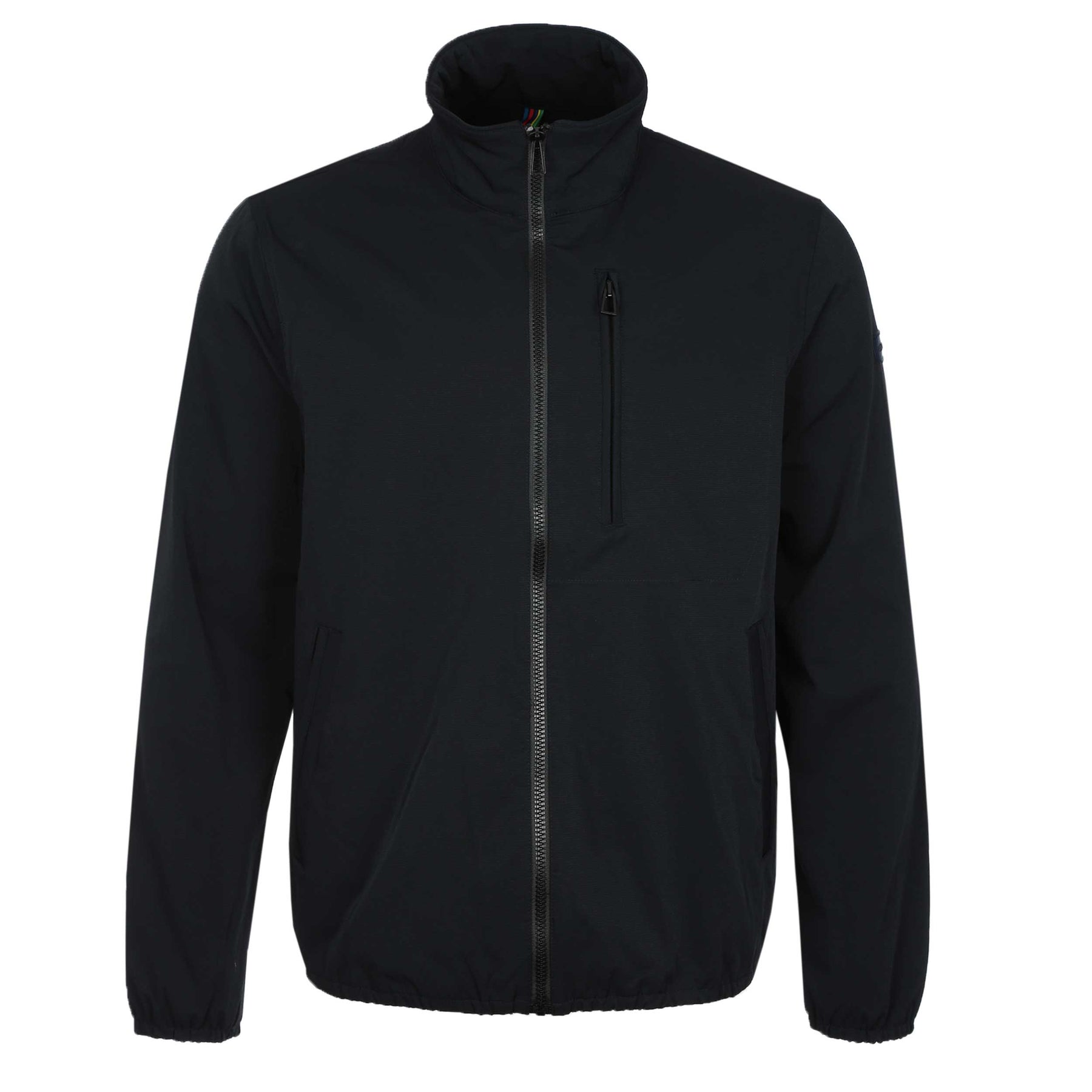 Paul Smith Track Jacket in Black. Lightweight jacket by Paul Smith. A full zip fastening jacket with stretch properties. 1 zip fastening pockets at the chest of the jacket. 2 side entry pockets with press stud fastening. Elasticated cuffs and waistband. Paul Smith logo badge to the sleeve in a contrasting colour.