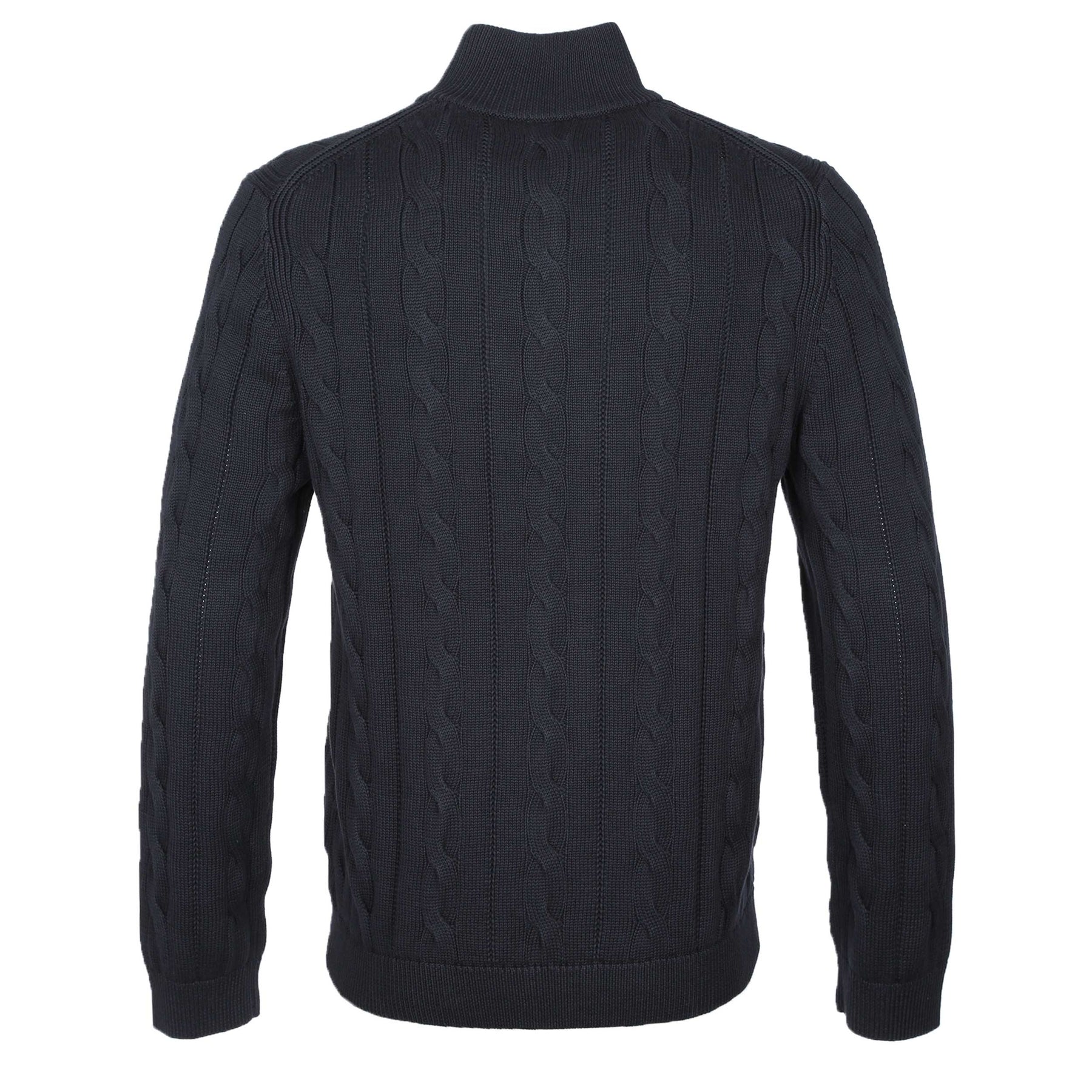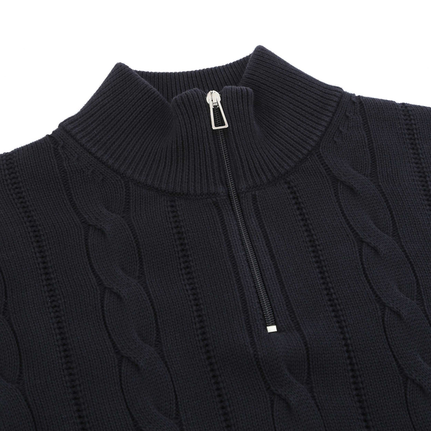 Discover the elegance and sophistication of the Zip Neck Sweater Knitwear in Navy. Crafted from 100% organic cotton, this cable knit style knitwear addition embodies both comfort and luxury, making it a perfect choice for the modern gentleman.
