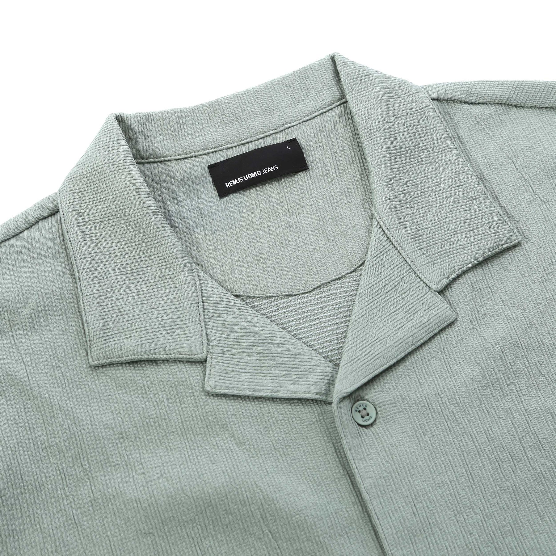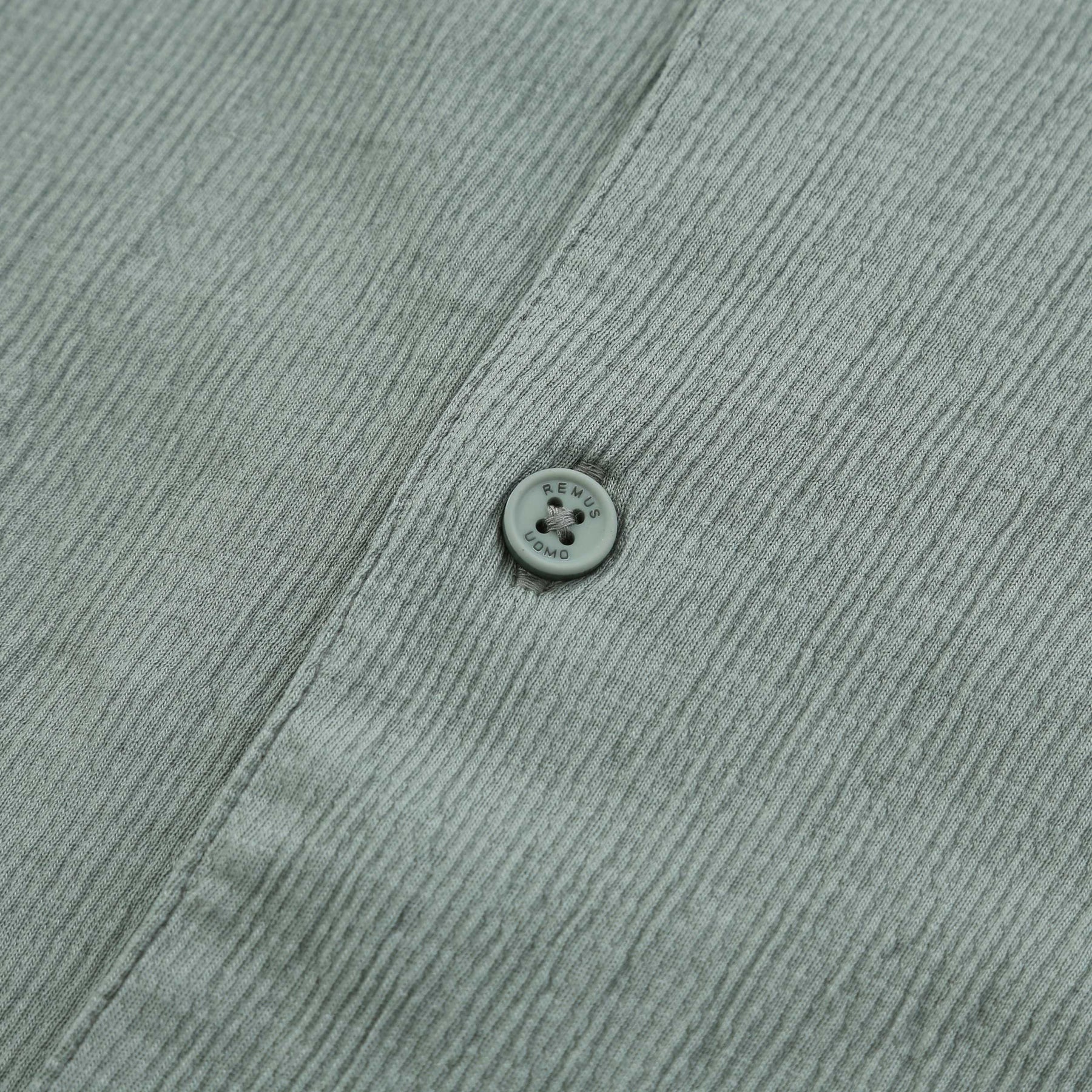 Remus Uomo Cuban Collar SS Shirt in Sage Green. Elevate your summer style with the Remus Uomo Cuban Collar SS Shirt in Sage Green. This stylish shirt is a perfect blend of comfort and sophistication, designed for the modern man who values both casual elegance and functional performance. Crafted from a lightweight and breathable stretch jersey fabric, it ensures all-day comfort while the unique crinkle texture imparts a contemporary touch that distinguishes it from regular shirts.