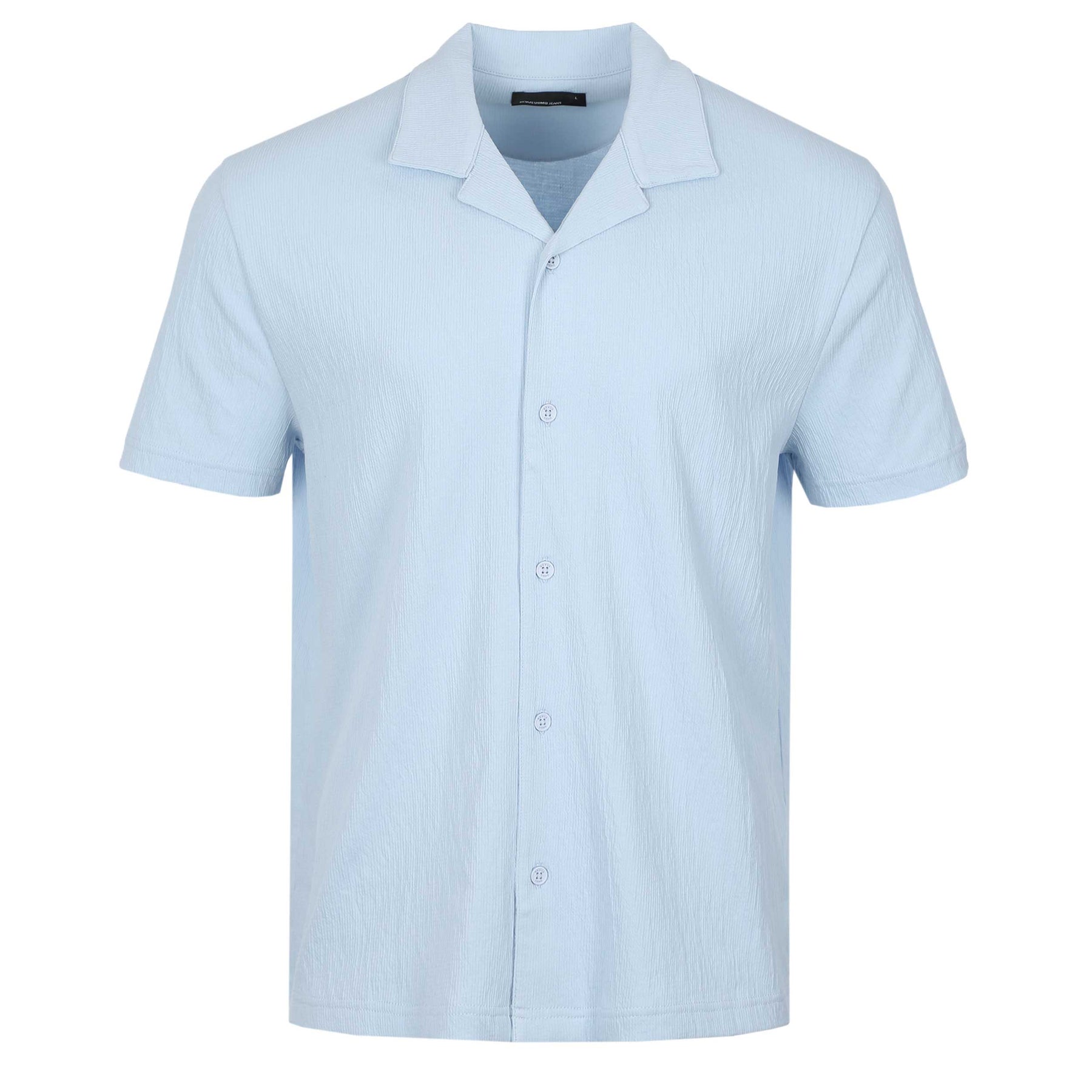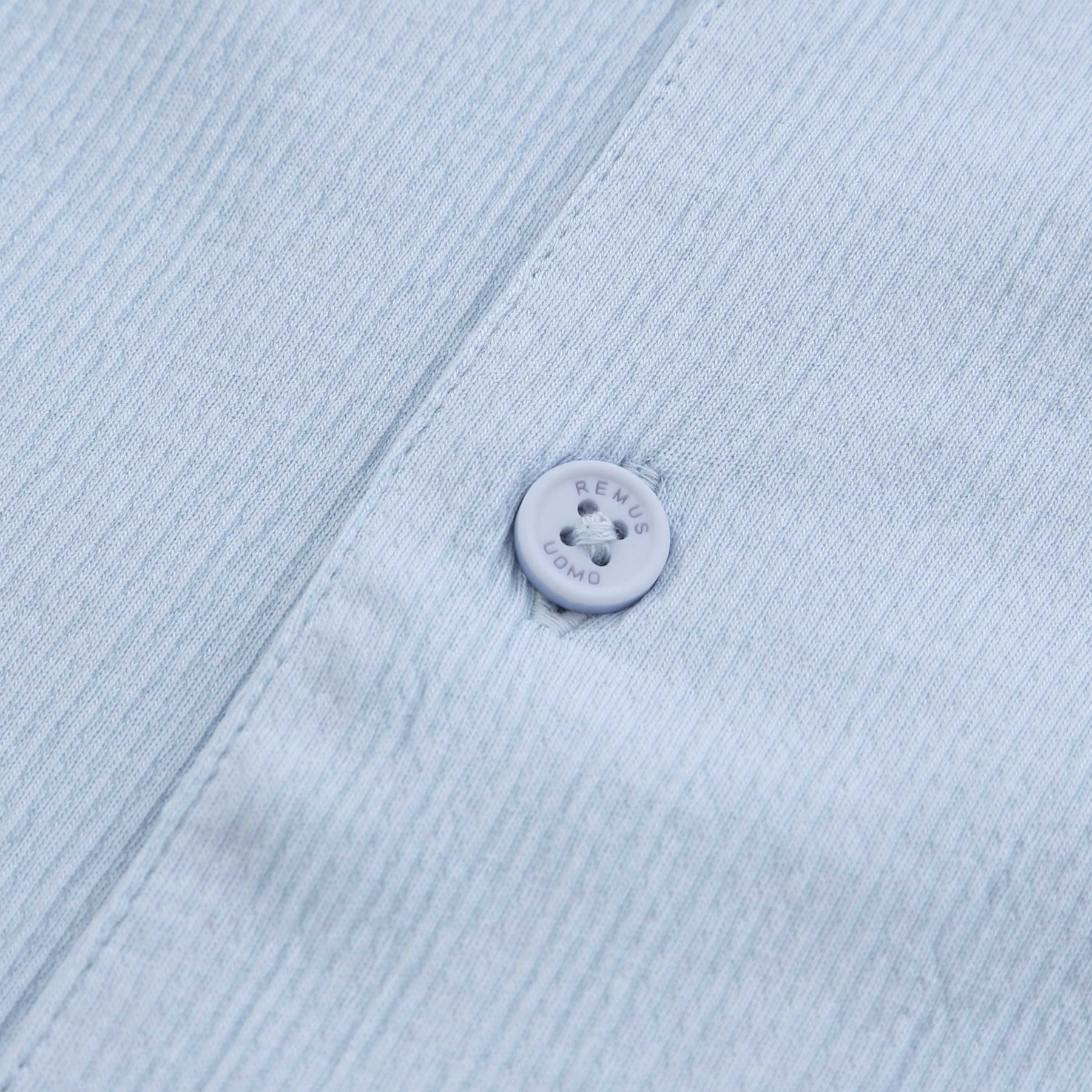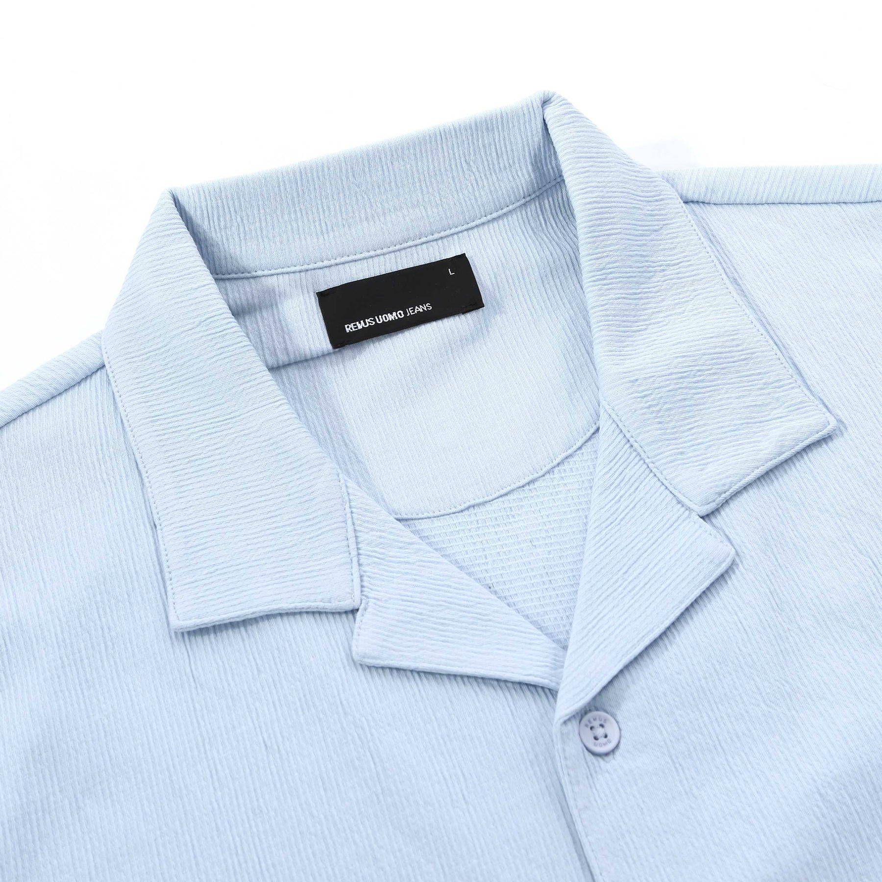 Remus Uomo Cuban Collar SS Shirt in Sky Blue. Elevate your summer style with the Remus Uomo Cuban Collar SS Shirt in Sky Blue. This sophisticated yet casual shirt is designed for the modern gentleman looking for comfort and flair. Made from a premium crinkle-textured jersey fabric, it ensures breathability and a flexible fit, making it perfect for warm-weather outings.