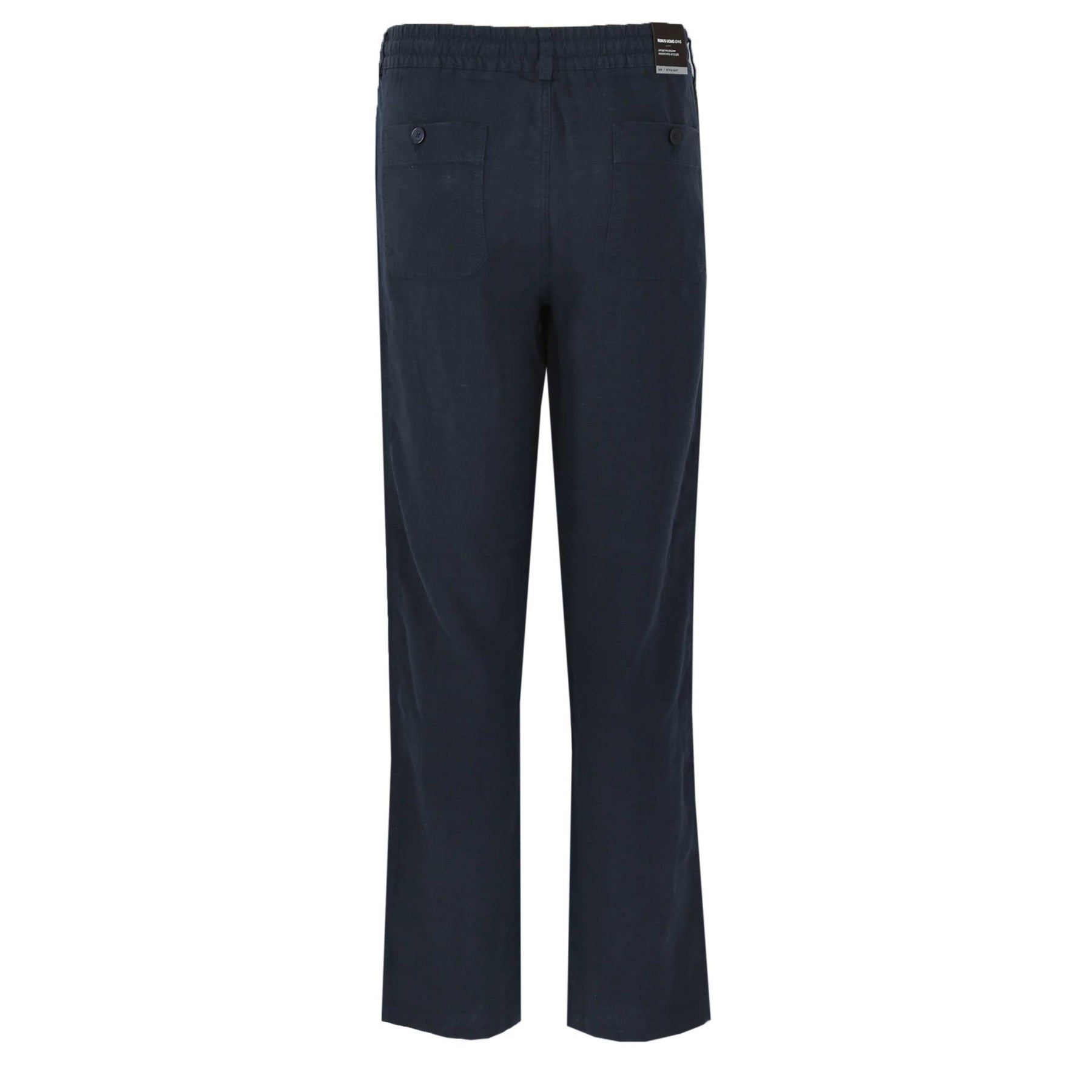 Remus Uomo Elio Linen Trouser in Navy. This is a straight fit linen trouser crafted from 100% linen. Button and fly fastening. Elasticated waistband with drawstring fastening. Detailed with two slit pockets on the front of the shorts and finishing with two buttoned seat pockets. Tonal Remus Uomo logo to the seat pocket.