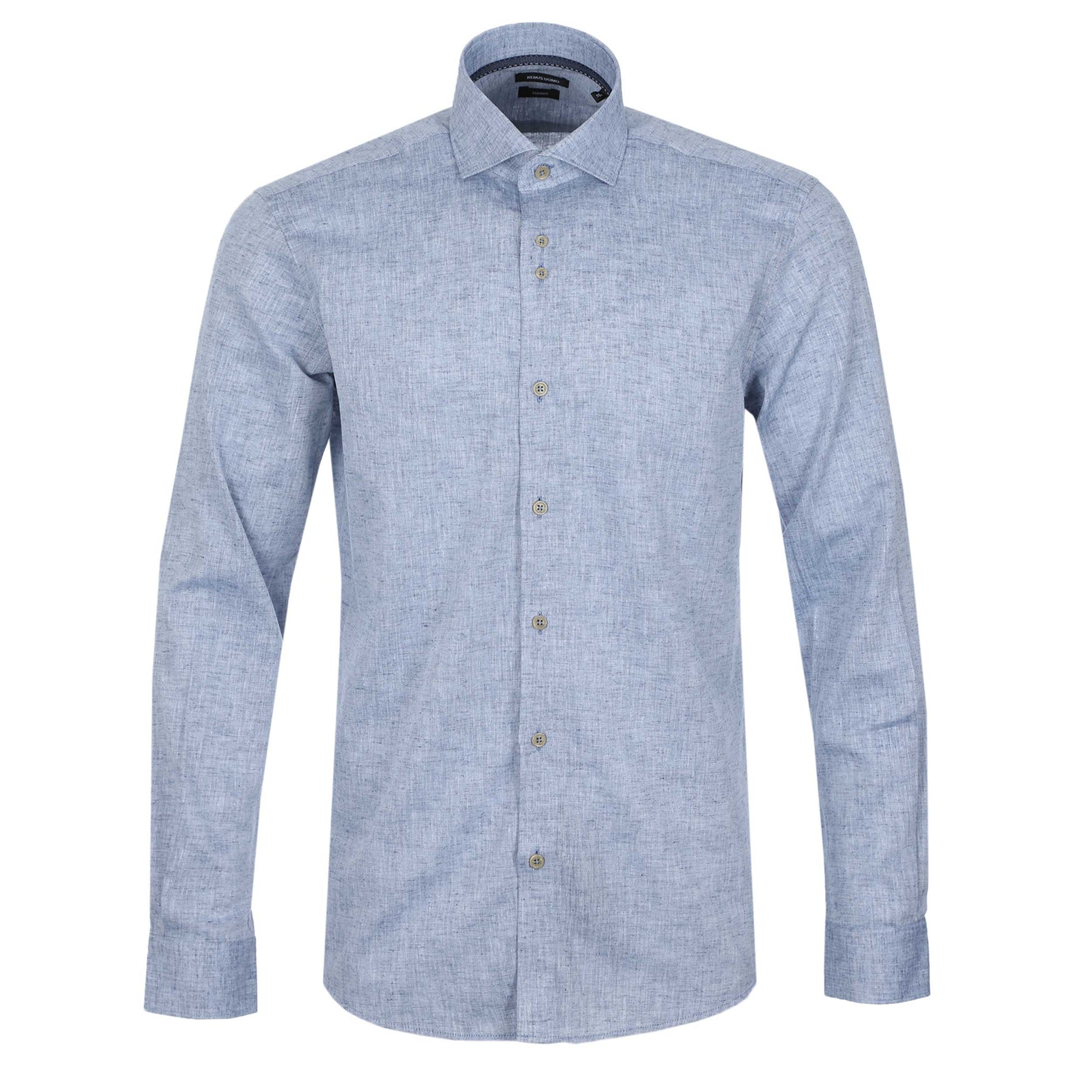 Remus Uomo Frank Linen Shirt in Washed Blue. Long sleeve shirt by Remus Uomo cut to a tapered fit. Cutaway button down collar. Mottled design shirt constructed from a cotton linen mix. Embroidered Remus Uomo logo to the sleeve. Finished with a Remus Uomo logo tab to the waist.