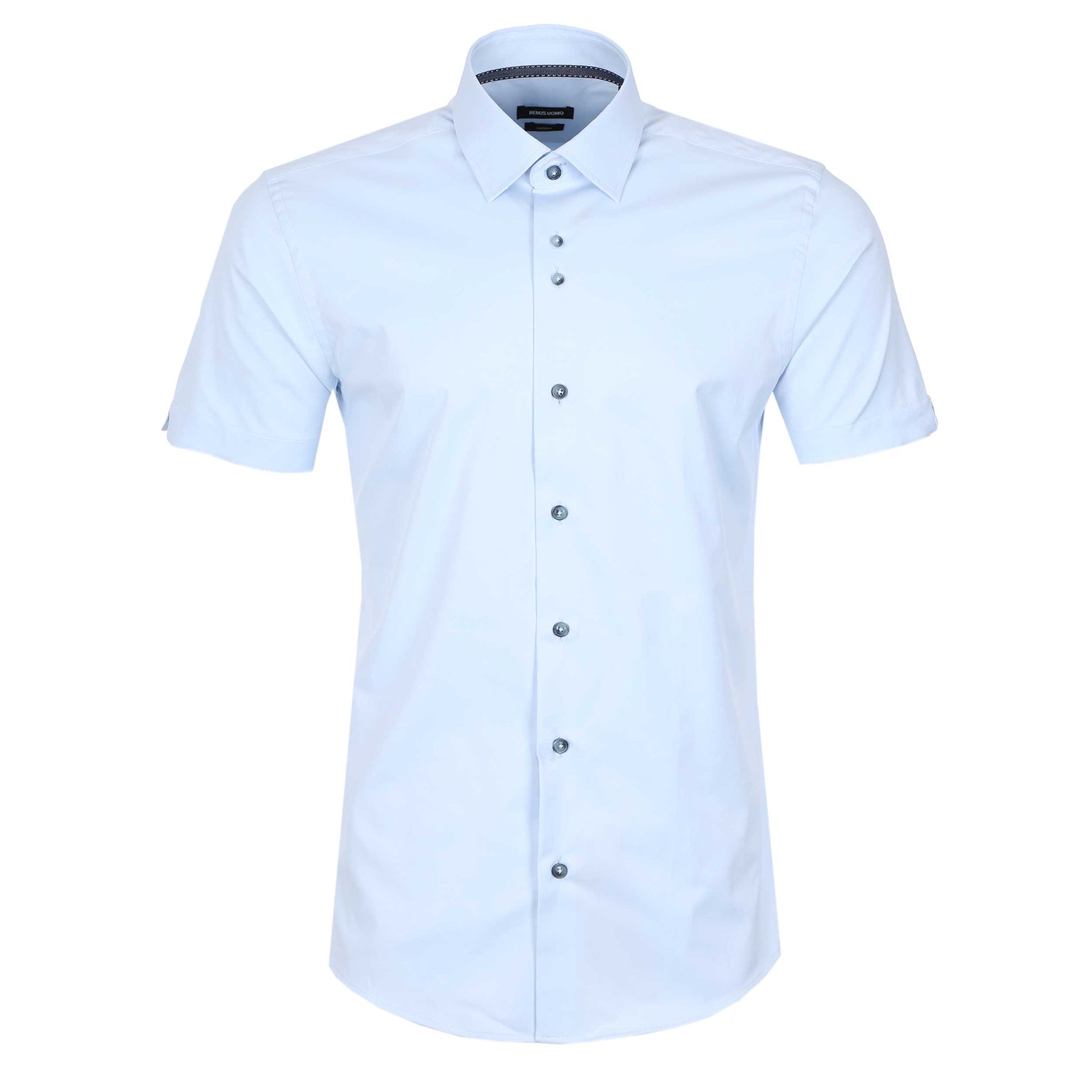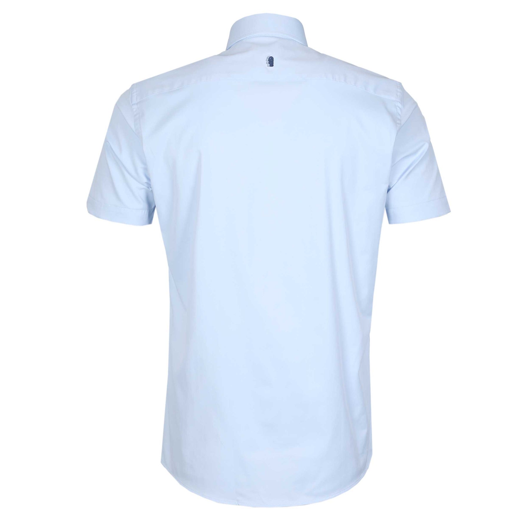 Remus Uomo Parker SS Shirt in Sky Blue. Short sleeve shirt by Remus Uomo in a slim fit. Classic pointed collar with button down function. Plain design shirt with a 2 way stretch. Embroidered logo to the nape. Finished with a Remus Uomo logo tab to the waist. Team with a jacket and pair of jeans for the complete look.