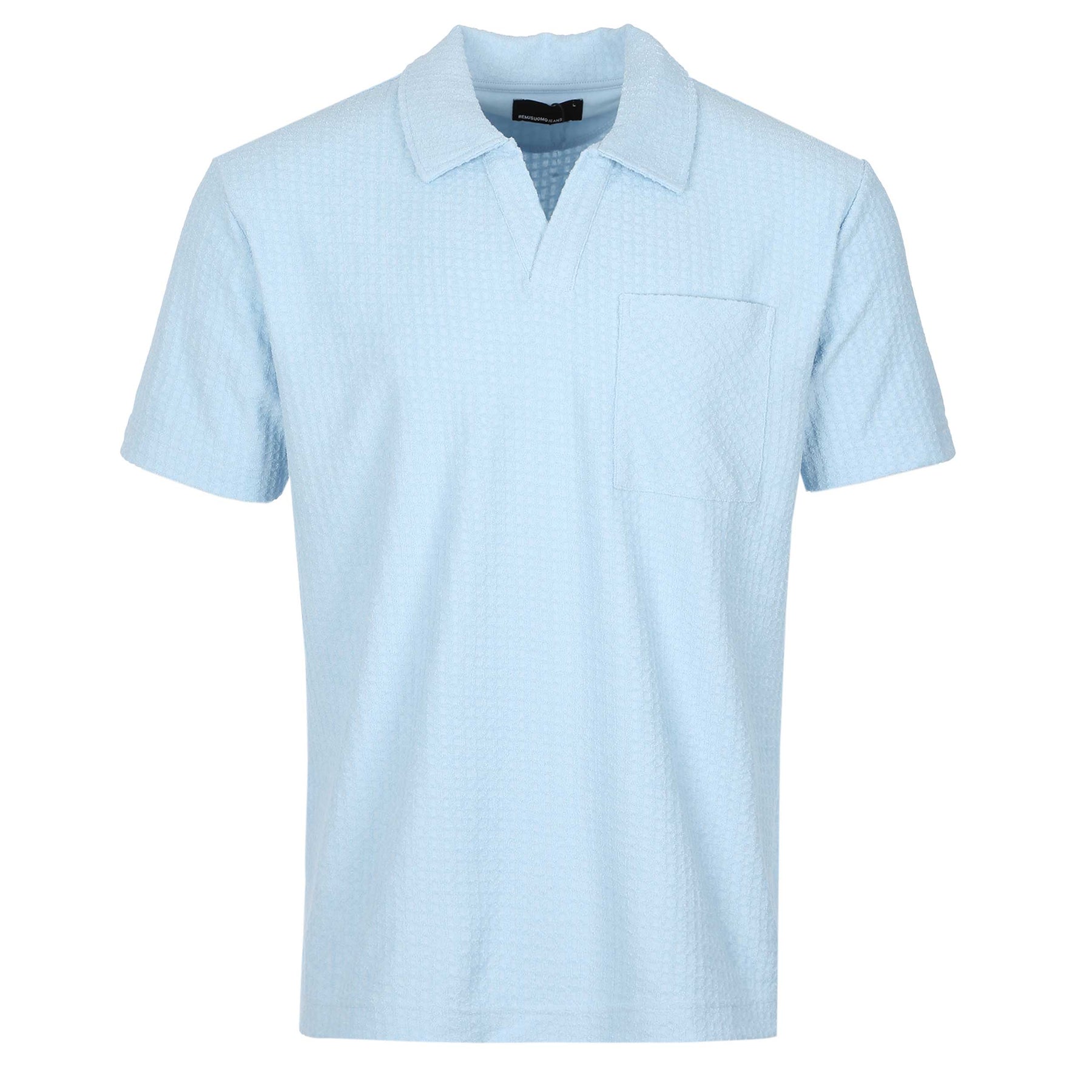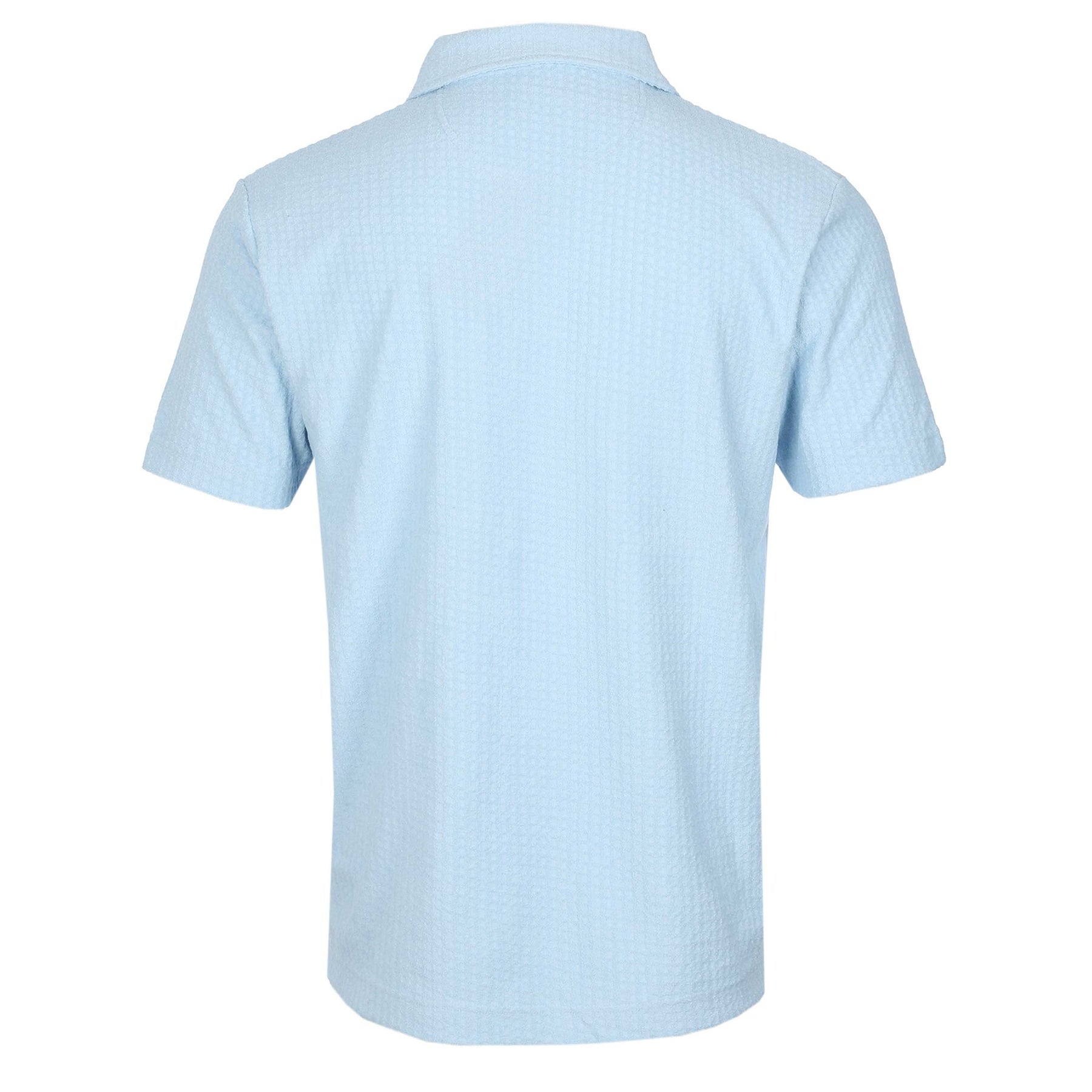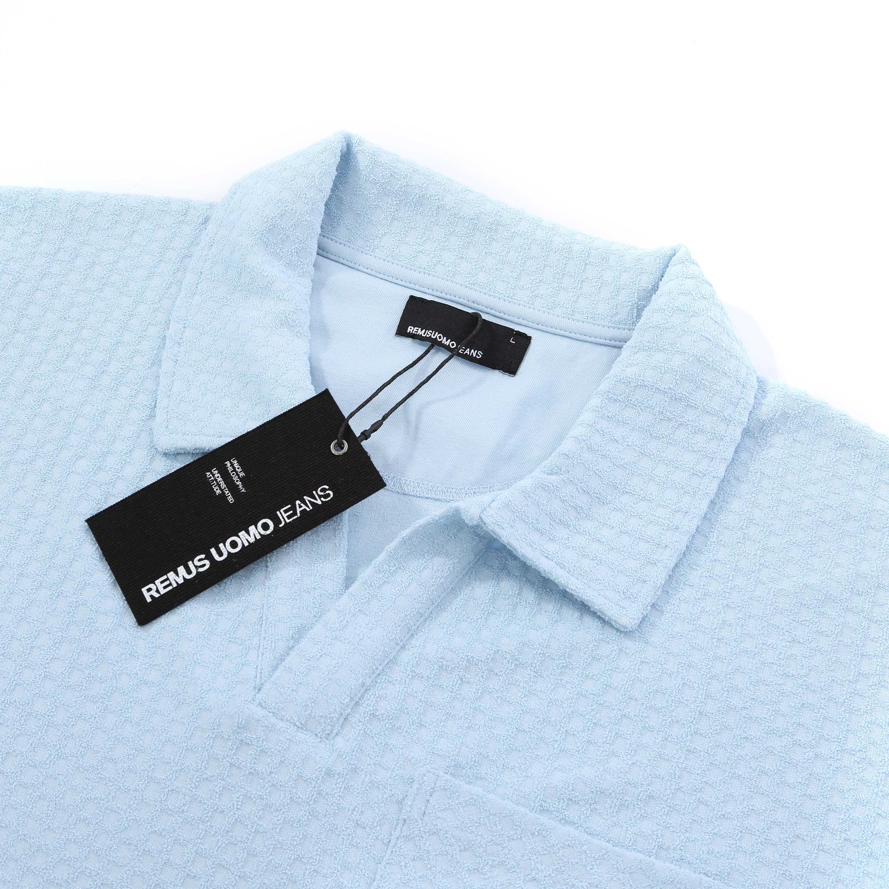 Remus Uomo Terry Towelling Skipper Collar Polo Shirt in Sky Blue. Crafted from soft terry towelling cotton, this textured polo shirt delivers relaxed, throw-on comfort with a refined edge. The all-over grid pattern adds subtle depth and visual interest, elevating it beyond a standard summer polo. Lightweight and breathable, the terry construction makes it an ideal warm-weather polo for spring and summer styling. The open collar enhances airflow while reinforcing its laid-back feel.