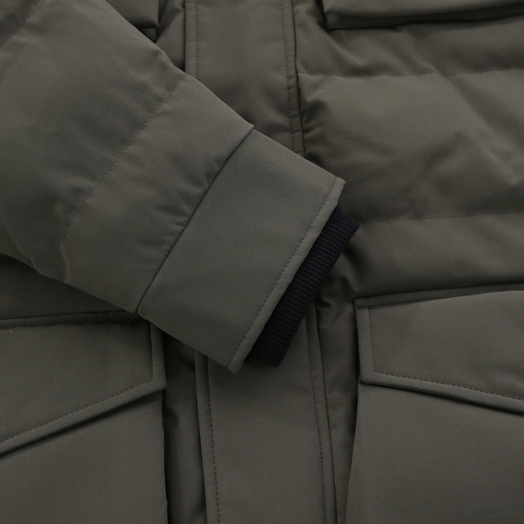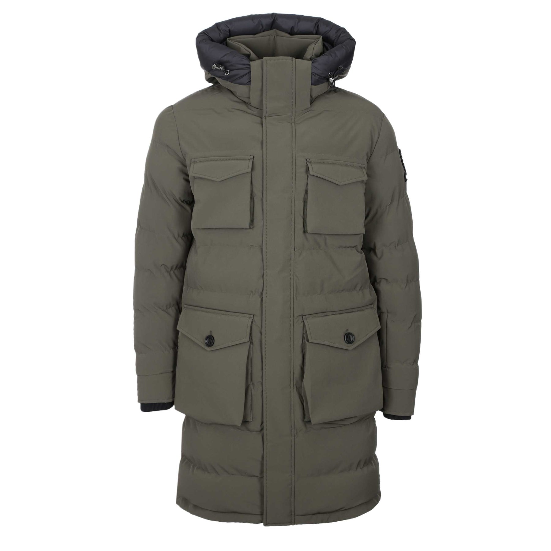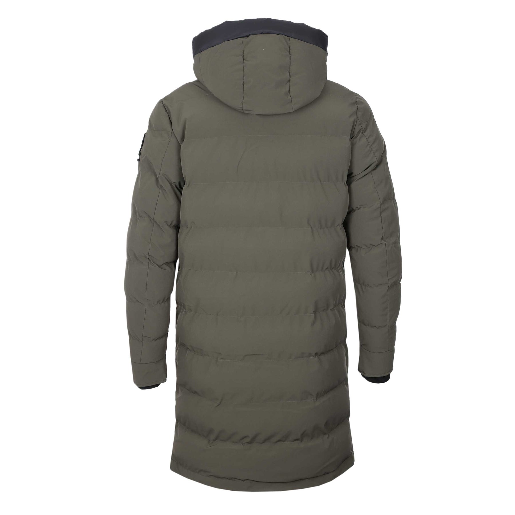 Sandbanks Branksome Long Puffer Jacket in Khaki. A long length puffer jacket by Sandbanks. Two way fastening zip placket to the front with snap fastening storm flap. Detachable hood with elasticated drawstrings. Four flap fastening pockets to the front of the jacket. Concealed ribbed cuffs. Embroidered Sandbanks logo badge to the sleeve.